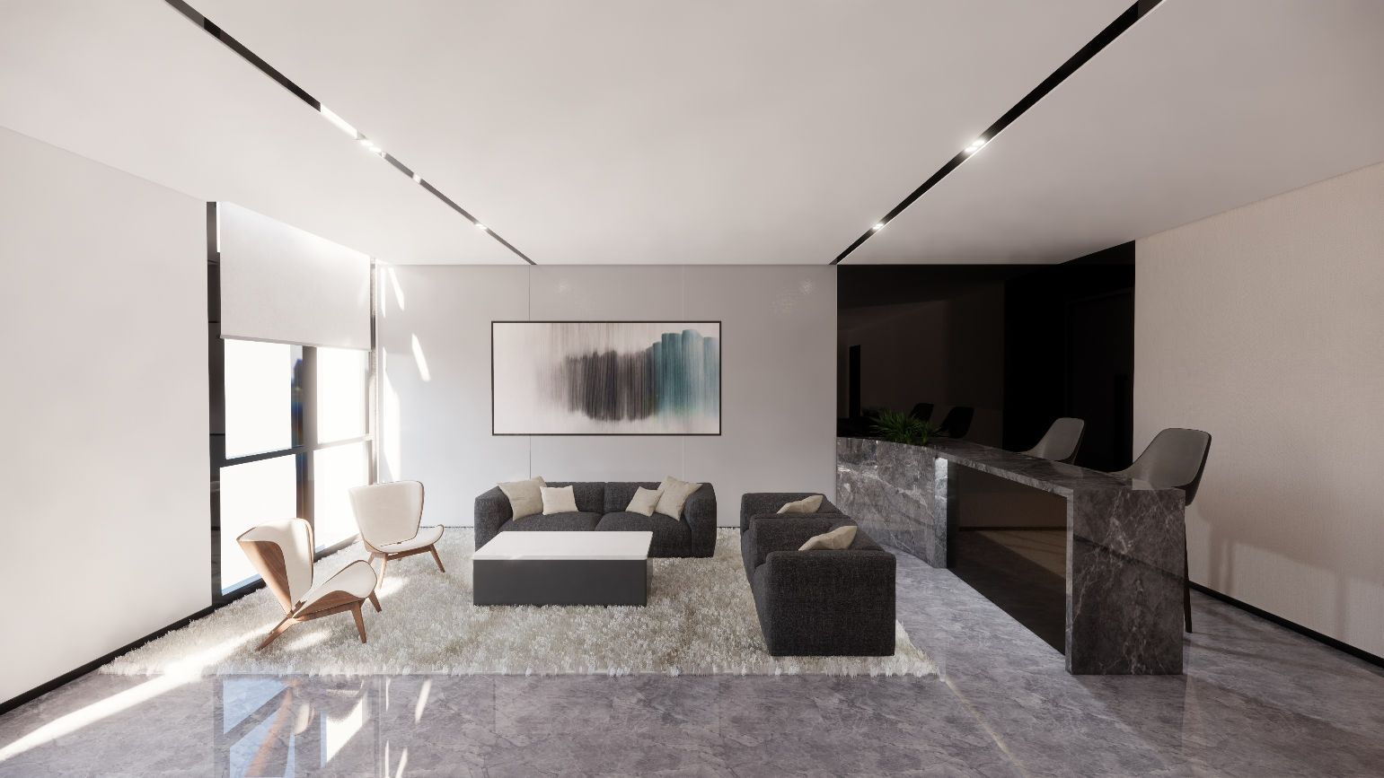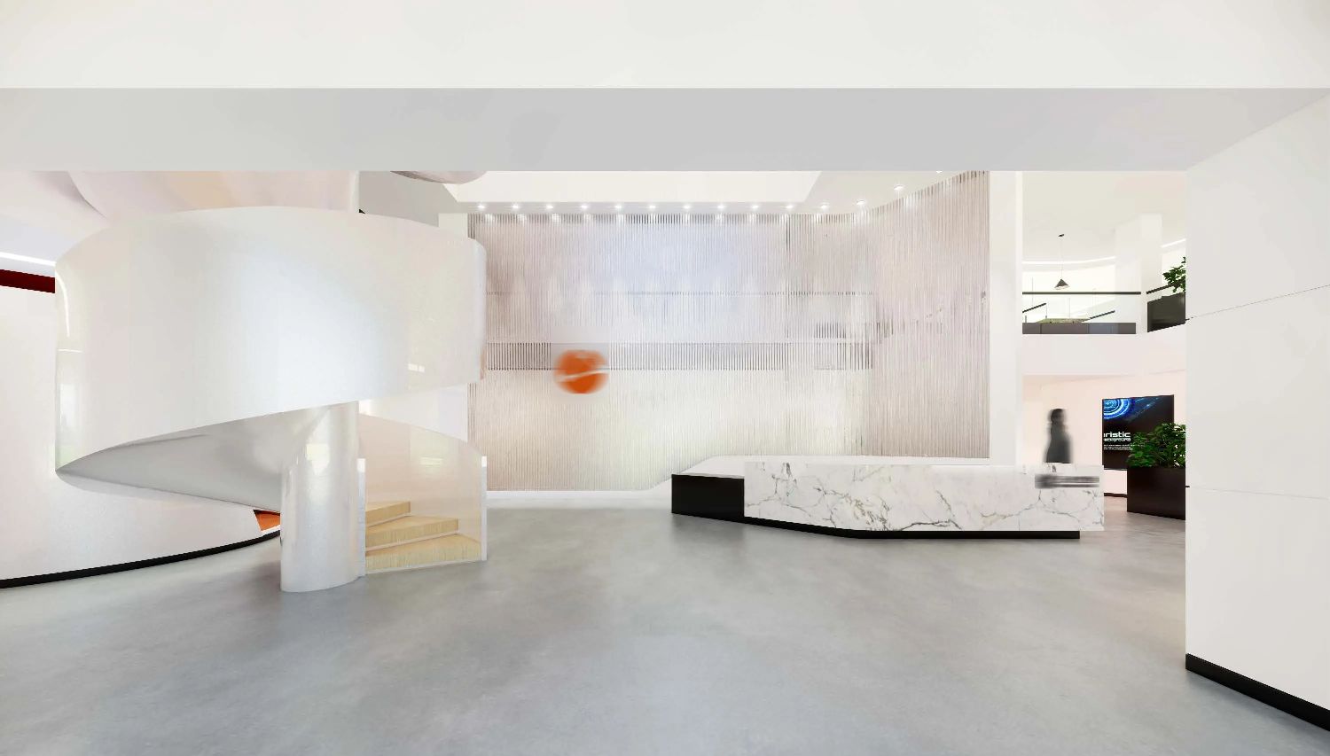 简洁,接待台采用了简洁的线条设计,表面使用了耐磨易清洁的材料,既美观又实用。旋转楼梯的设计使空间更加灵活多变,同时增加了空间的趣味性。楼梯的线条流畅,造型优雅,不仅为前厅增添了一道亮丽的风景线,也为来访者带来了独特的视觉体验。