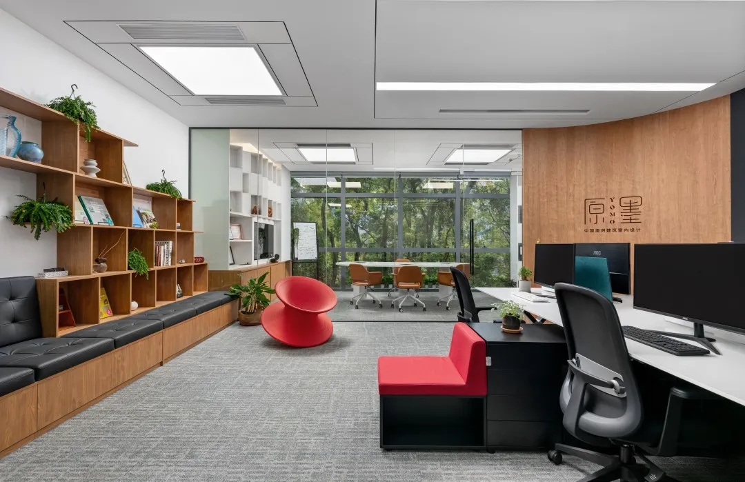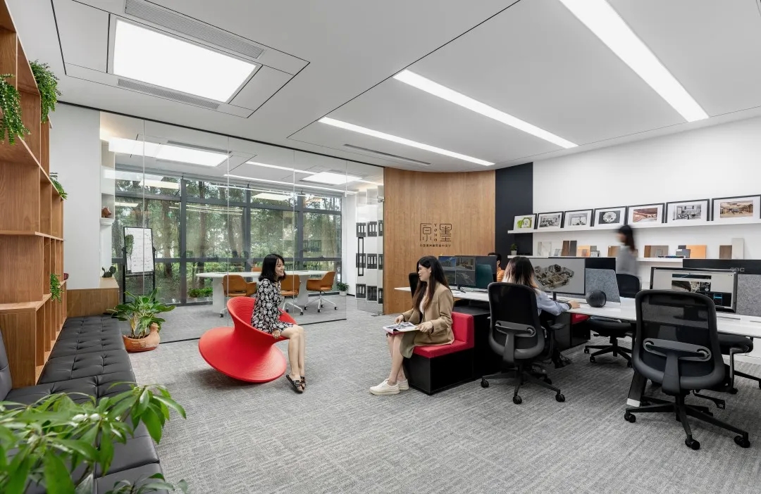 依然沿用了白色与橙色的组合。白色的墙面和天花板与的橙色相呼应,让休息区显得既温馨又活力四溢。员工们可以在这里聊天、喝茶、看书或者短暂休息,为接下来的工作充电。