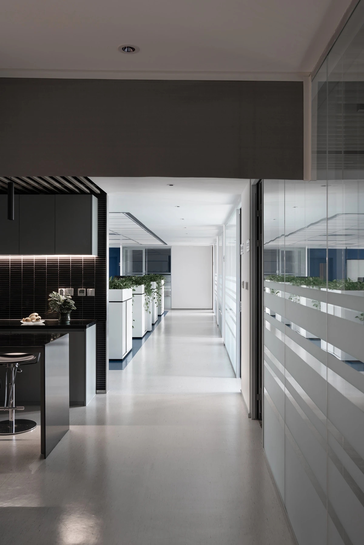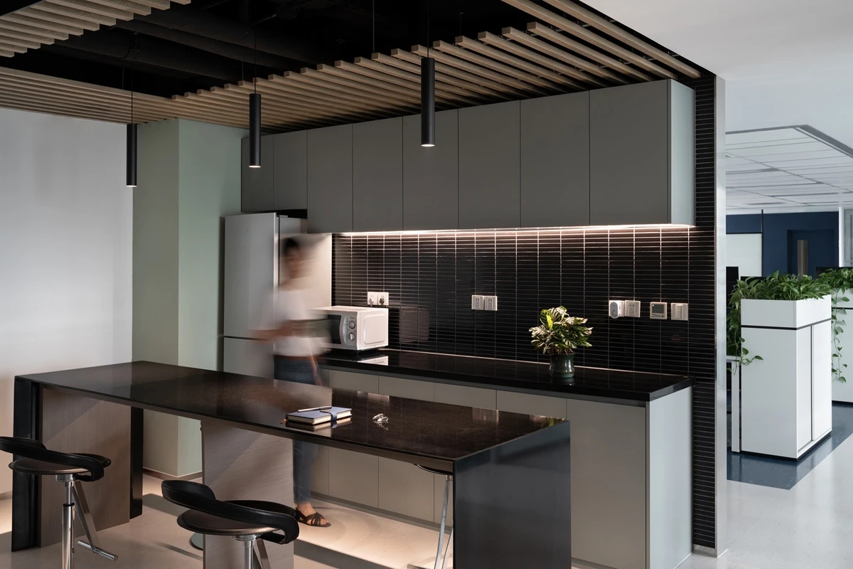 精确且务实的空间,功能小会客室、小会议室、商务会议室、办公室、实验室采用了双层隔音玻璃和独立门禁,确保信息安全。配套完备的半开放茶水区和工区尽头的休闲办公区能够支持相对开放的讨论和有自由度的工作方式。