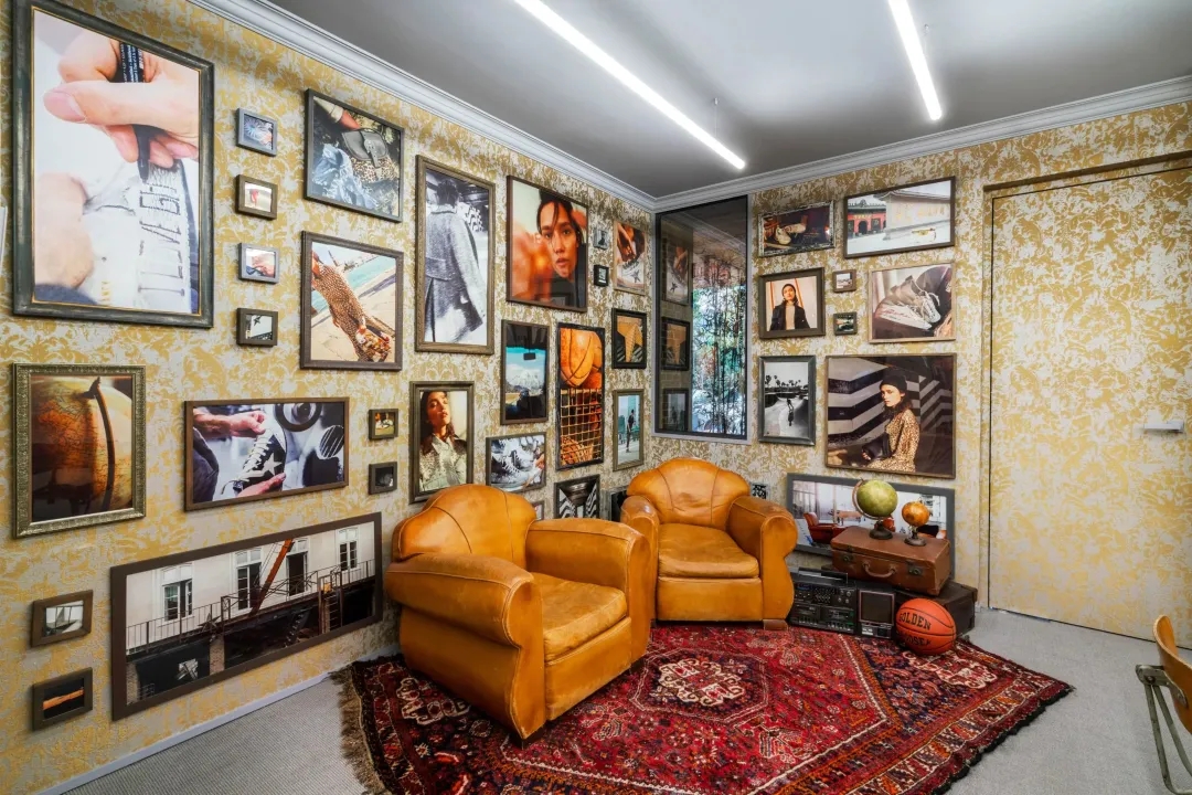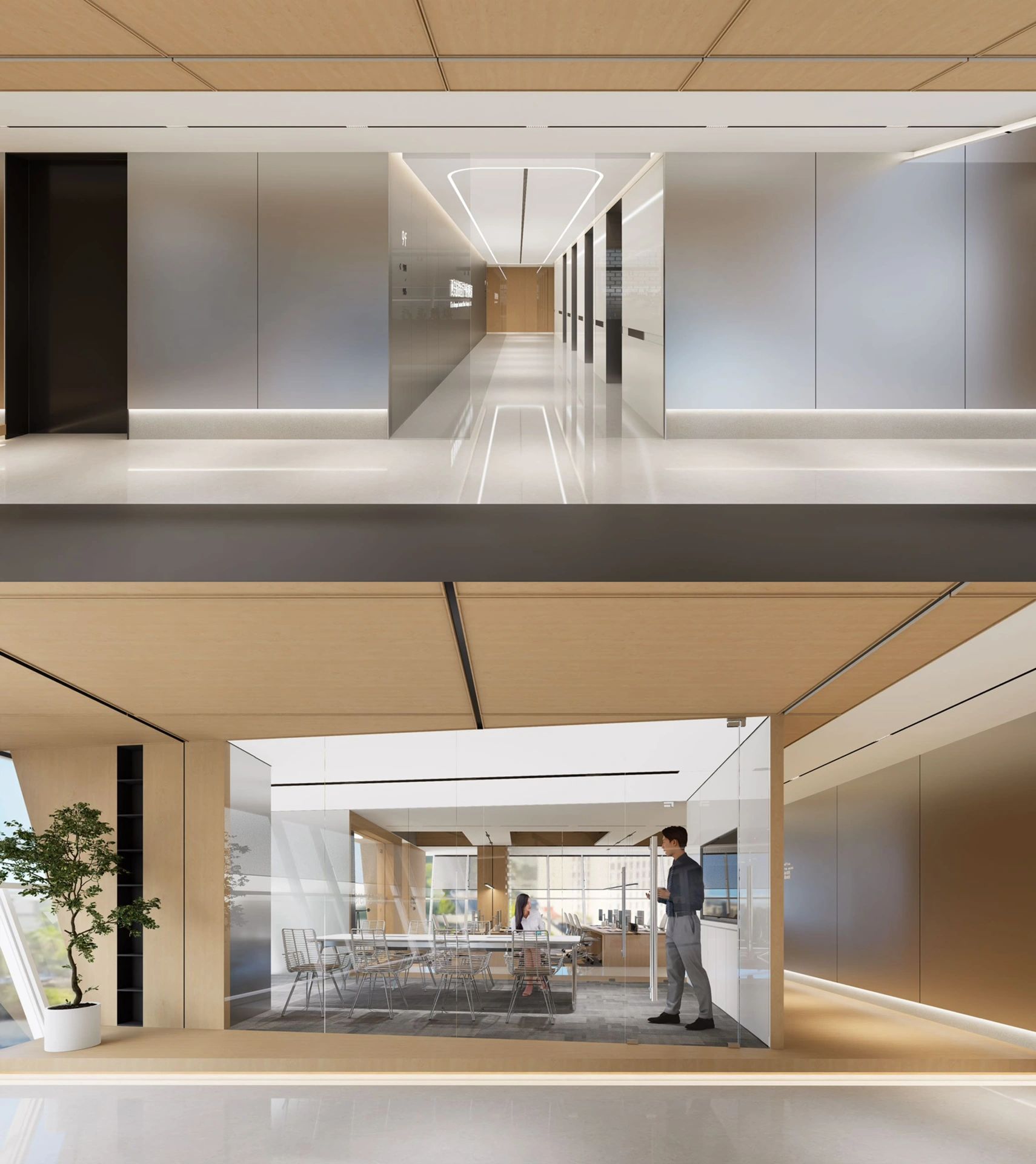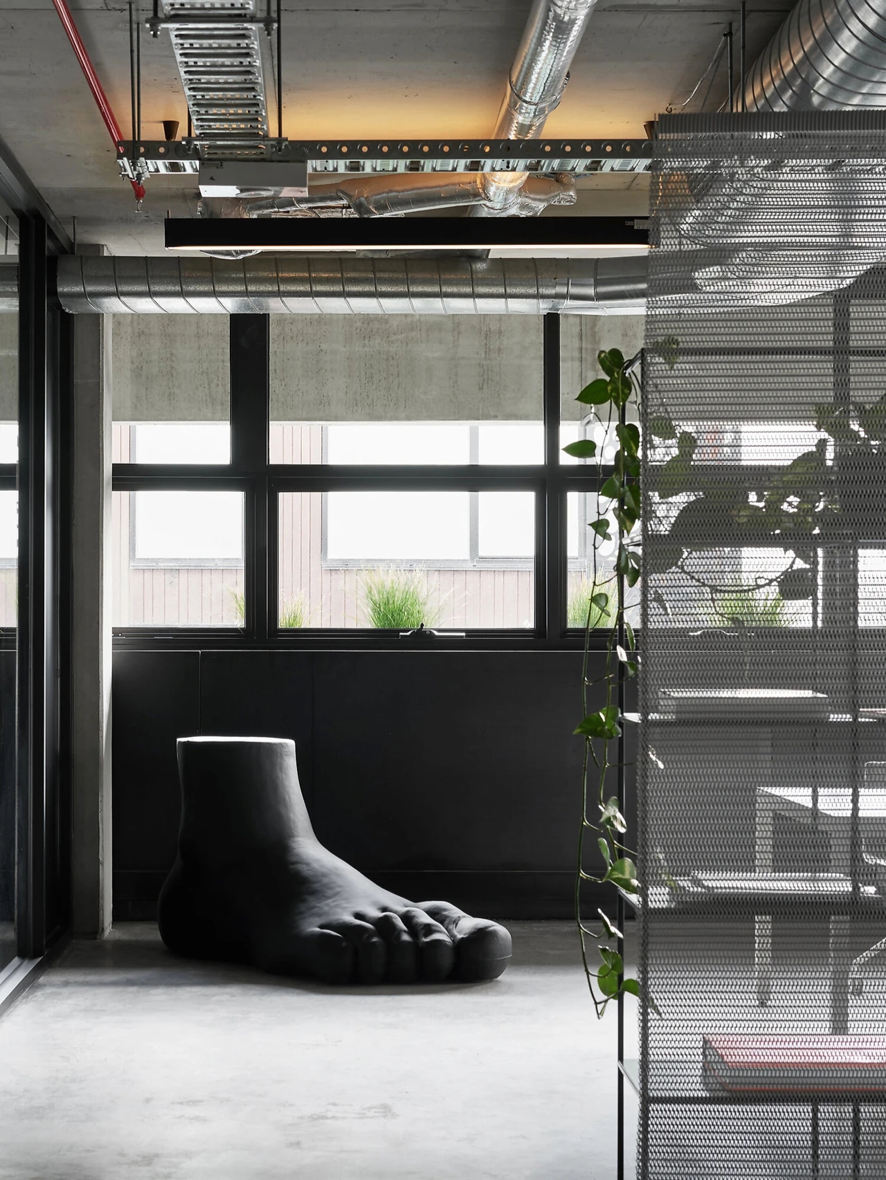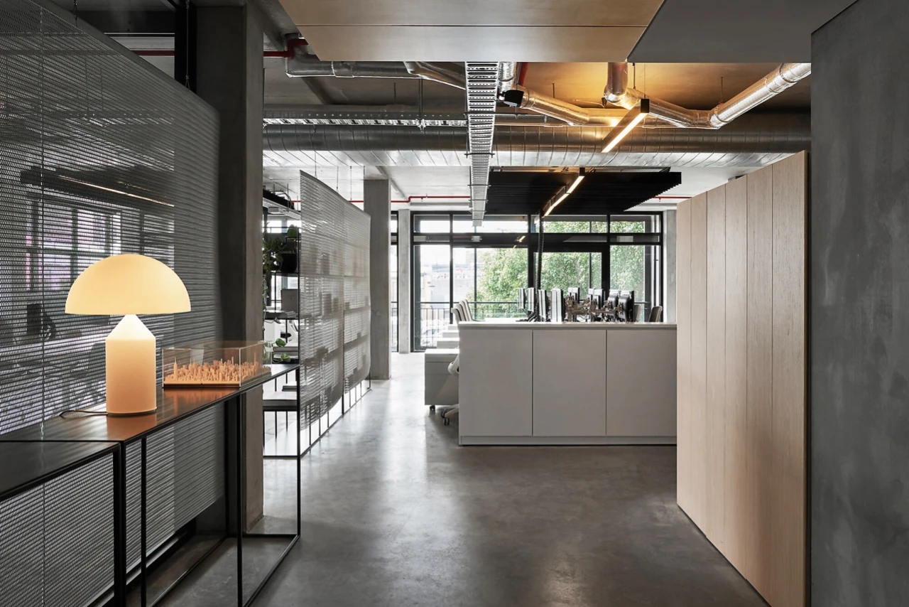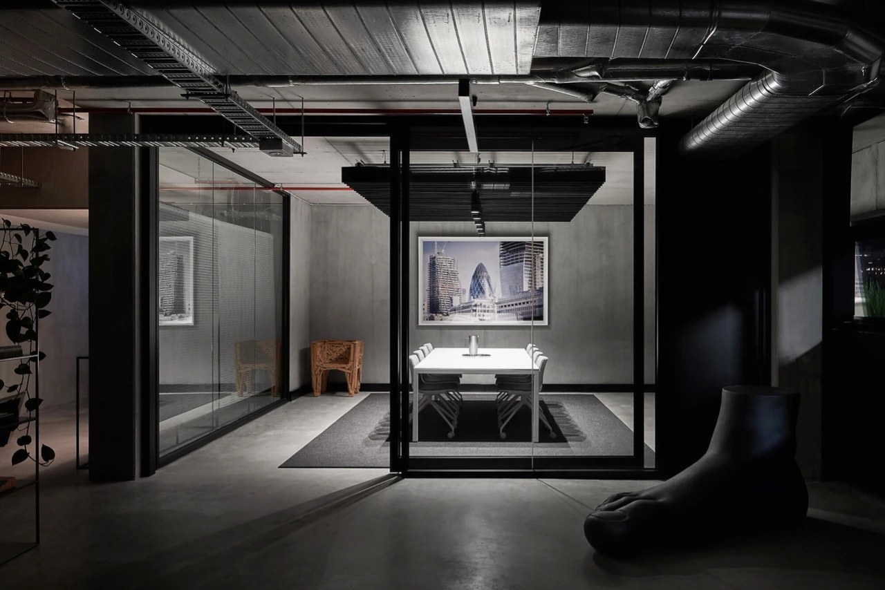 Gurner艺术品经济公司希望创建一个富有創意和張力的辦公空间,体现其企业文化的调性和价值。设计方案采用金属网等非常规材料,作为隔断墙和家具,金属材料的冷峻与木饰面的温润、水泥的质朴形成强烈的反差,并设计暗黑的室内灯光,最终营造了一种性格独特但又和谐的空间氛围。……采用开放灵活的平面布局,创造大小不等的隔断空间,既有完全独立、封闭的区域,也有相对分隔、半封闭的区域,员工可以根据客户和项目实际需求,选择不同的工作空间。……在每一个空间以及空间之间的联结节点,通过艺术品的展示,创造并凸显强烈的艺术气质。
