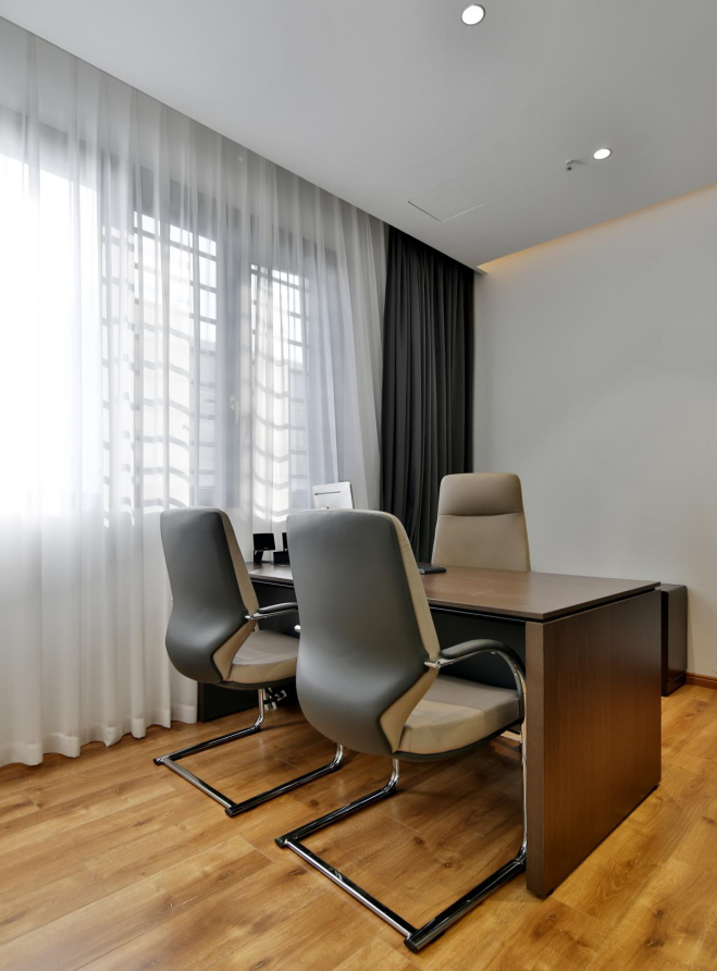 异形不规则摆放的办公桌椅、富有装饰性的半隔断、彩色的地面、三面落地窗加上横拉帘子、玻璃组合,虚实相应,使整个空间显得简练而有动感、舒适。蓝、橘跳跃的色彩使得空间的视觉感受不会显得单调无趣。