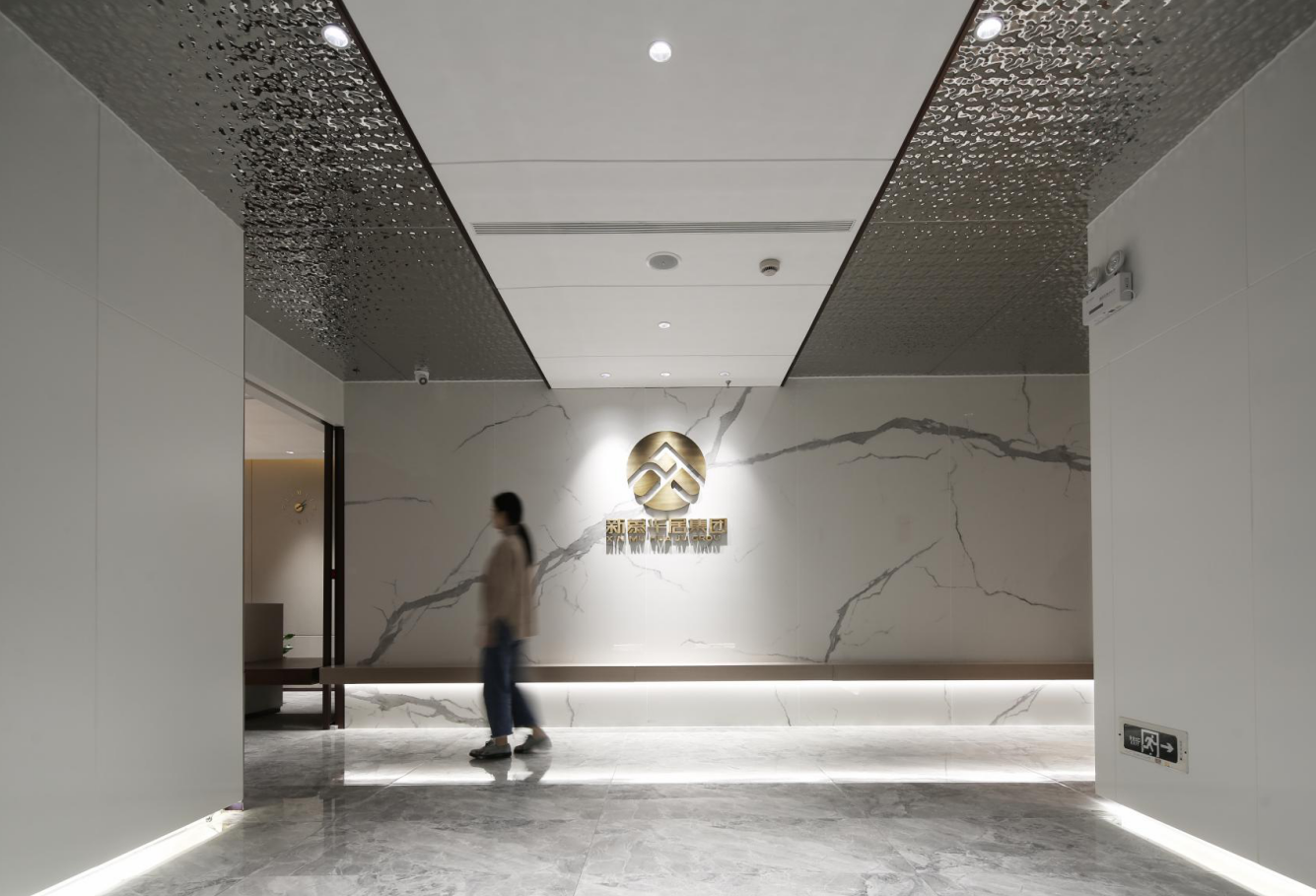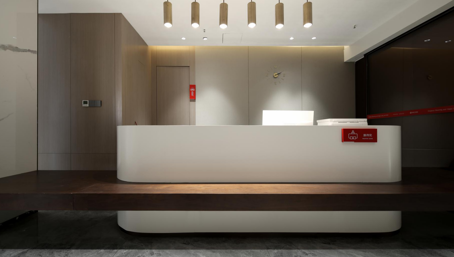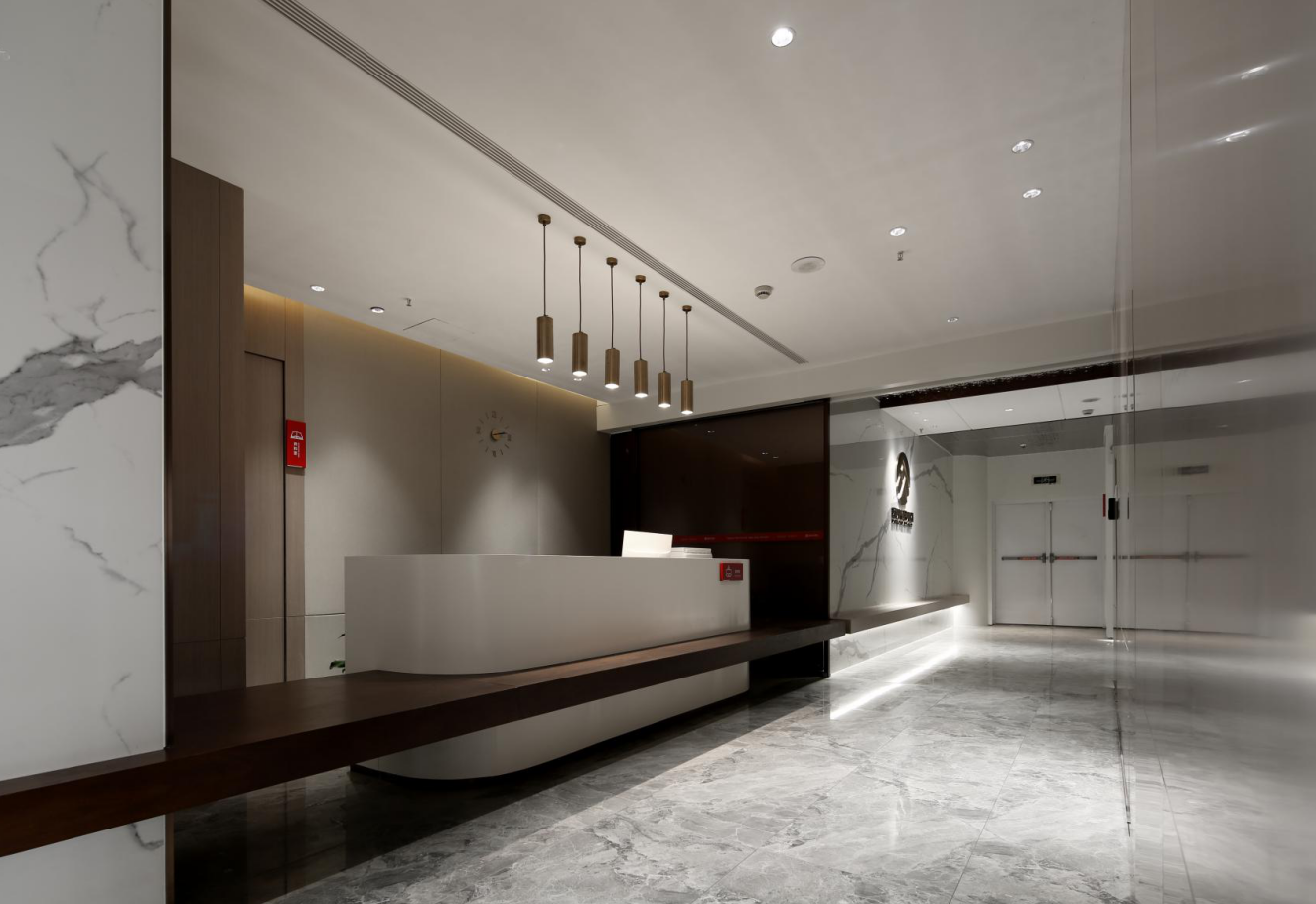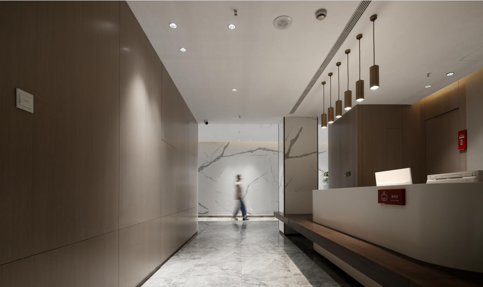 在电梯厅木质线条元素给空间增添了几分灵动和深邃;入口处白色石材接待台和白色玻璃墙,同灰白相间的地面构成的空间纯粹、干净。