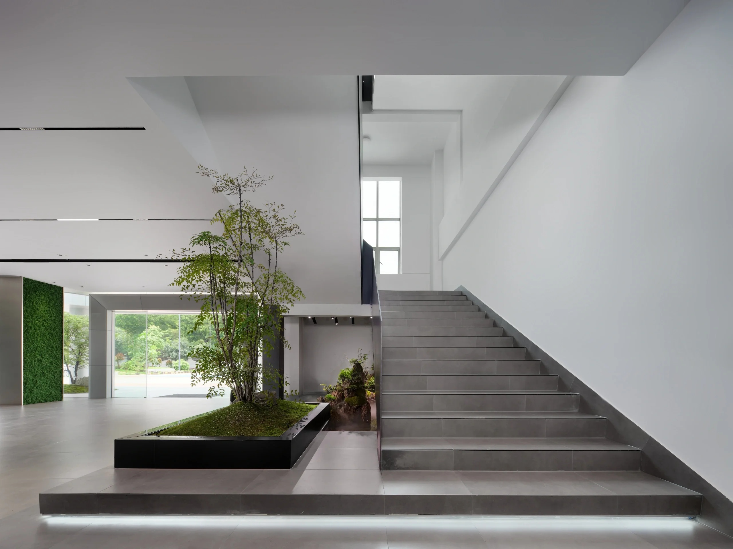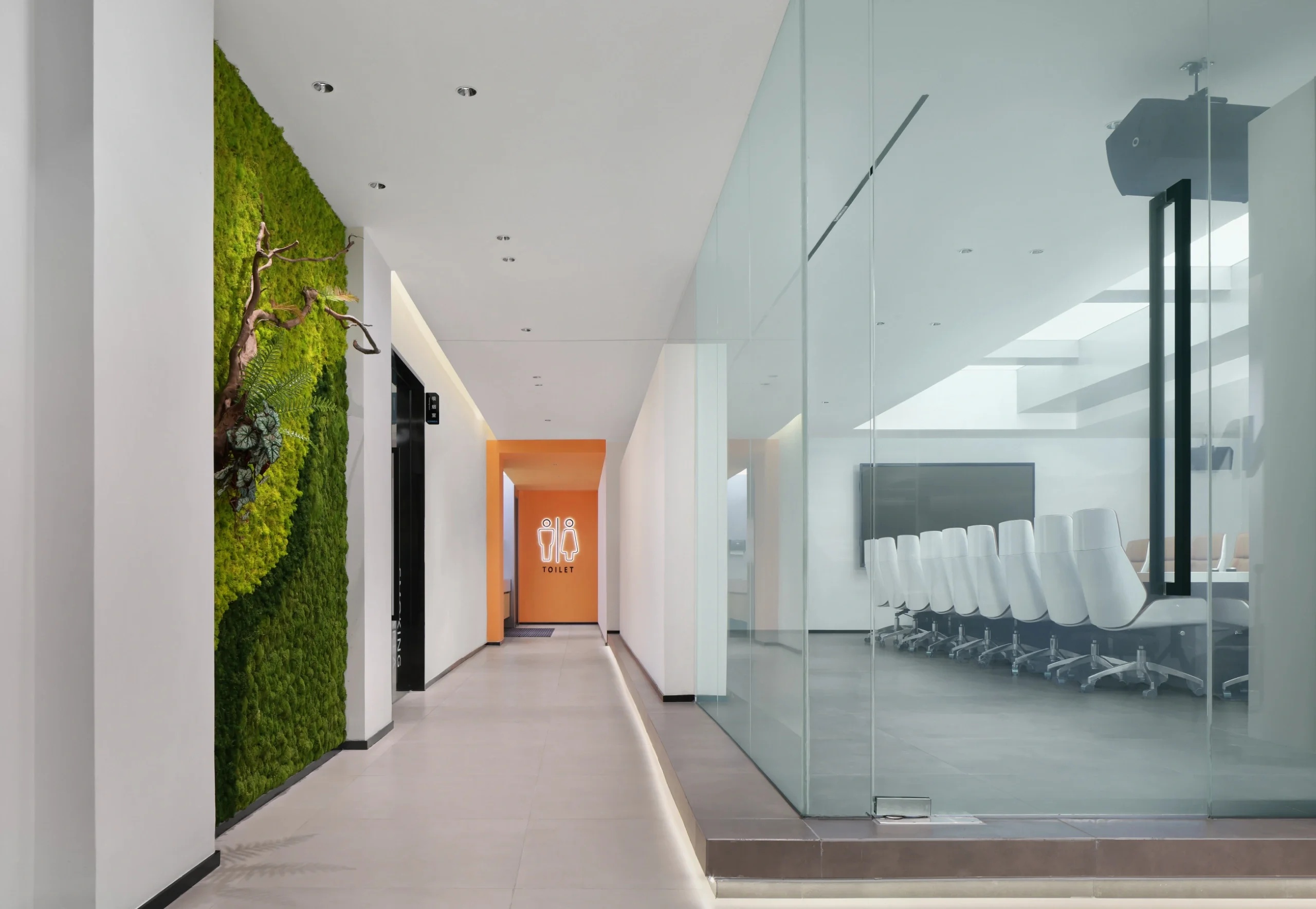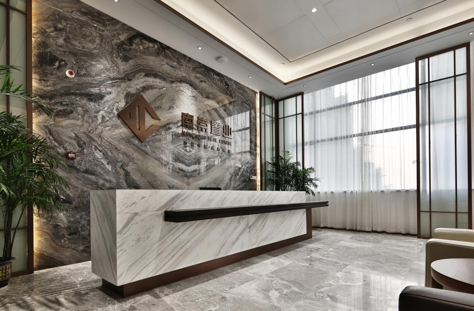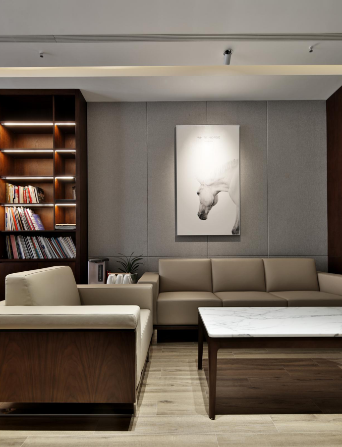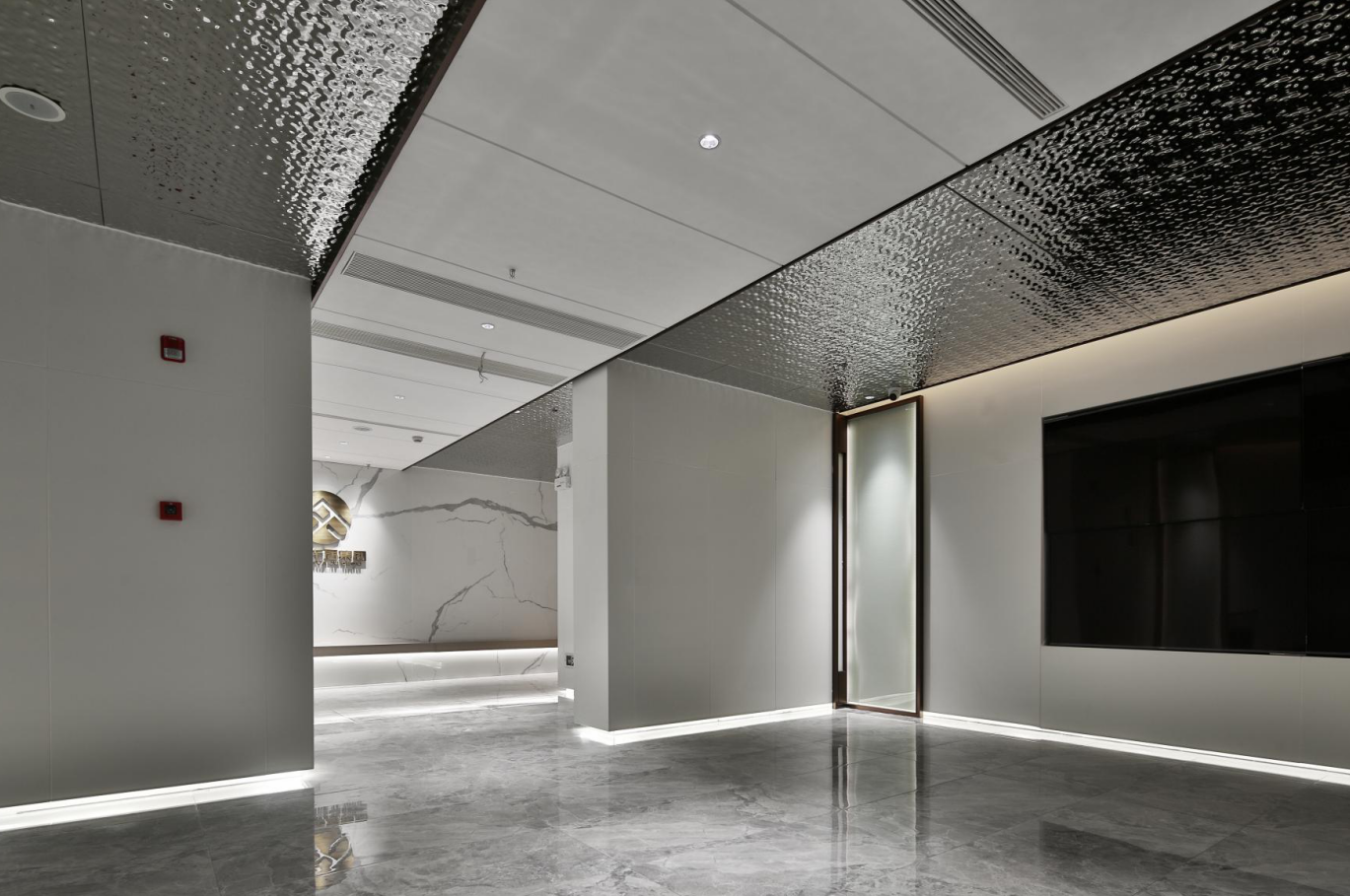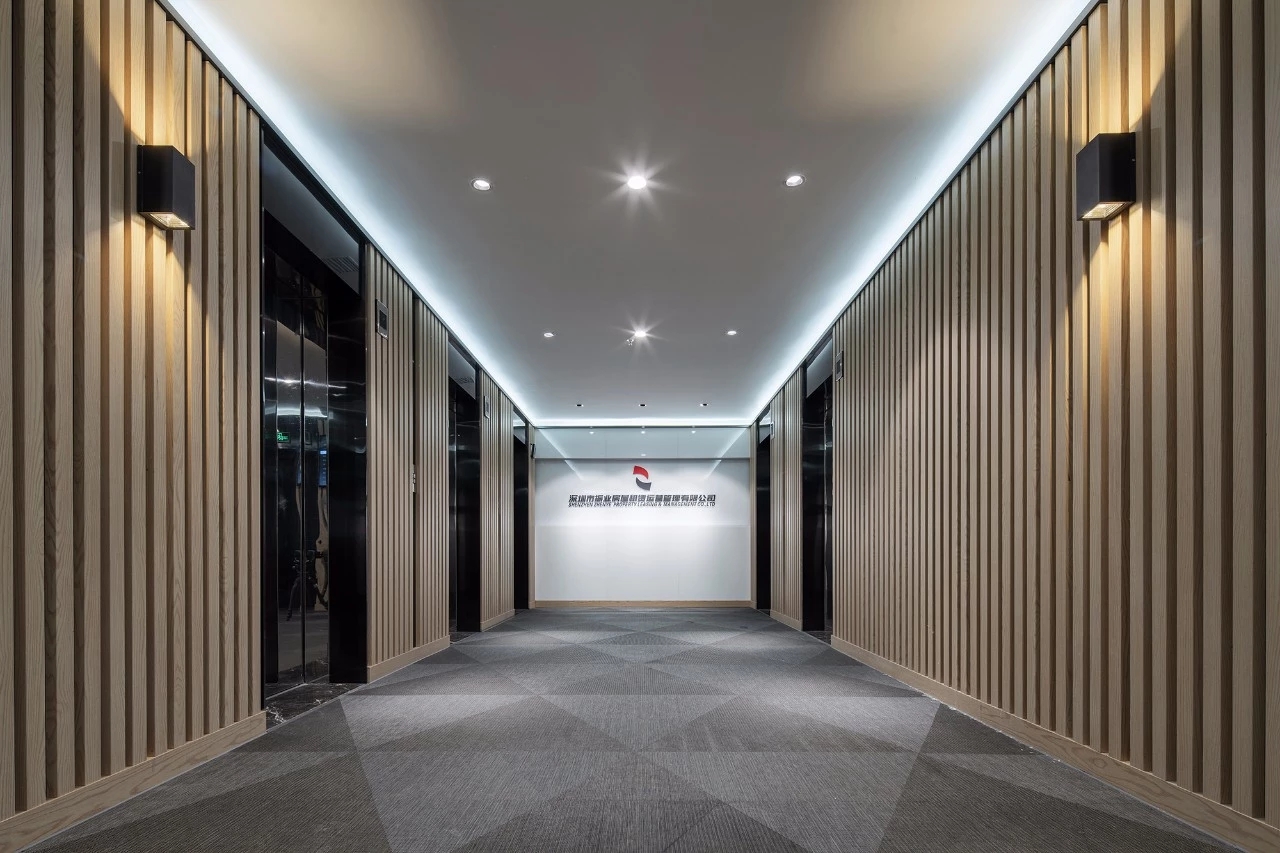 在电梯厅木质线条元素给空间增添了几分灵动和深邃;入口处白色石材接待台和白色玻璃墙,同灰白相间的地面构成的空间纯粹、干净。