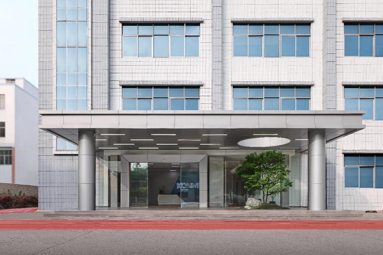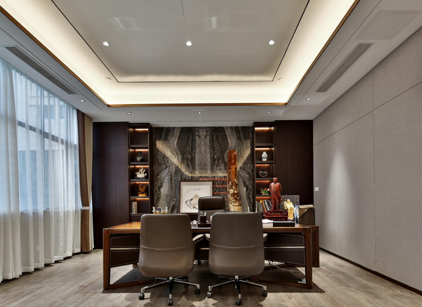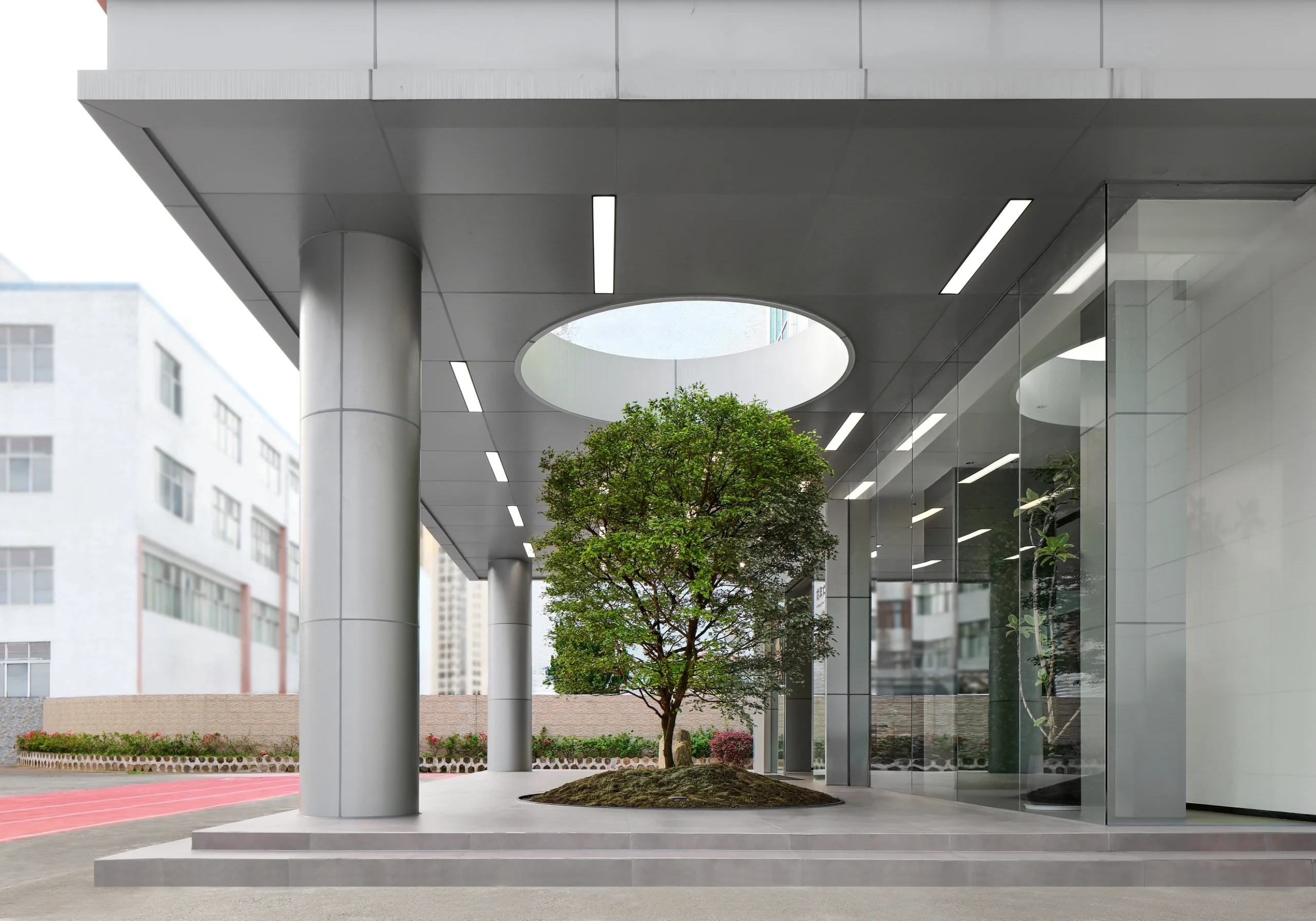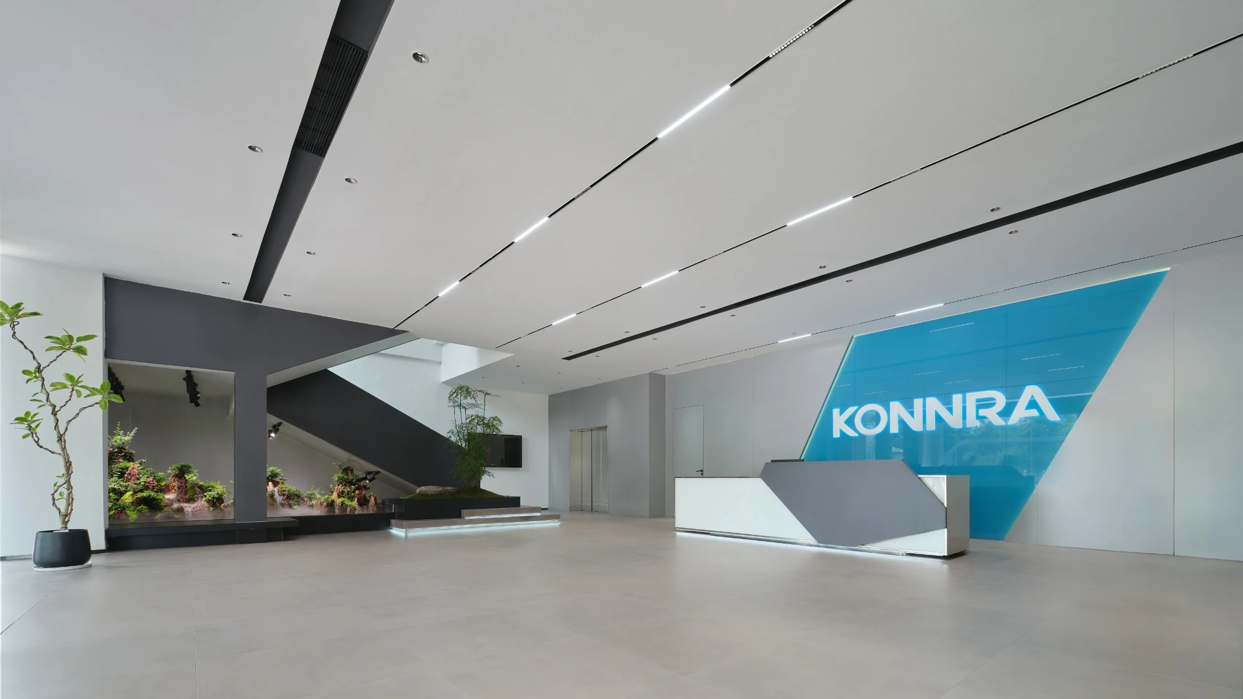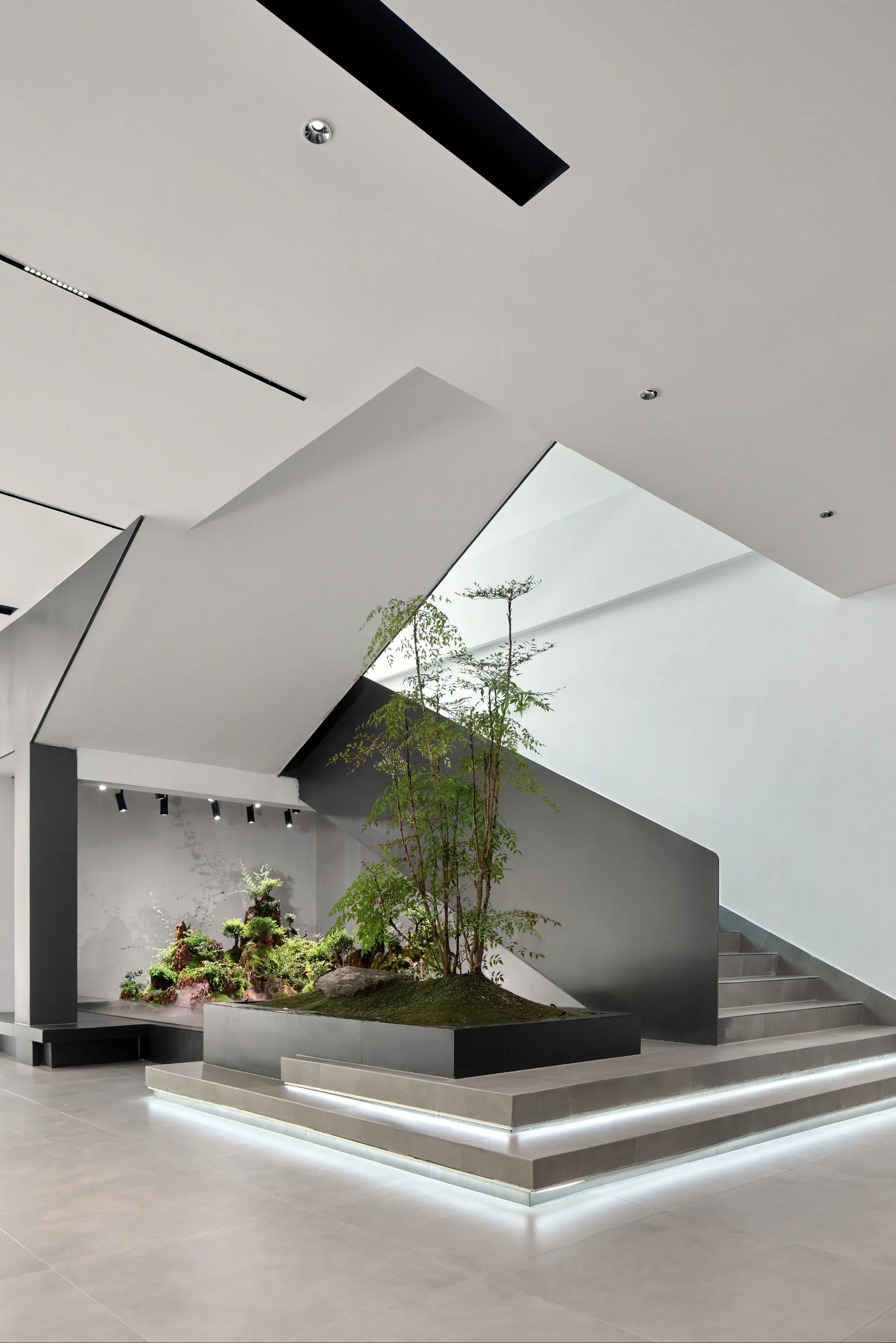 在电梯厅木质线条元素给空间增添了几分灵动和深邃;入口处白色石材接待台和白色玻璃墙,同灰白相间的地面构成的空间纯粹、干净。