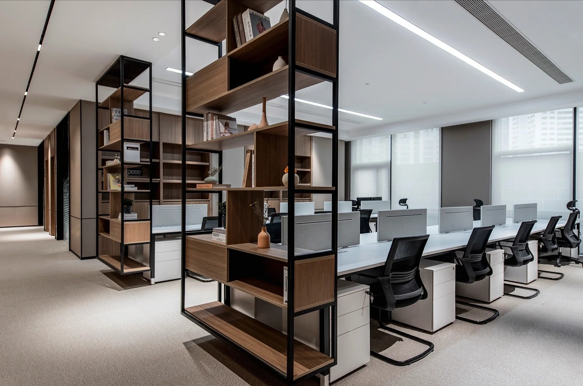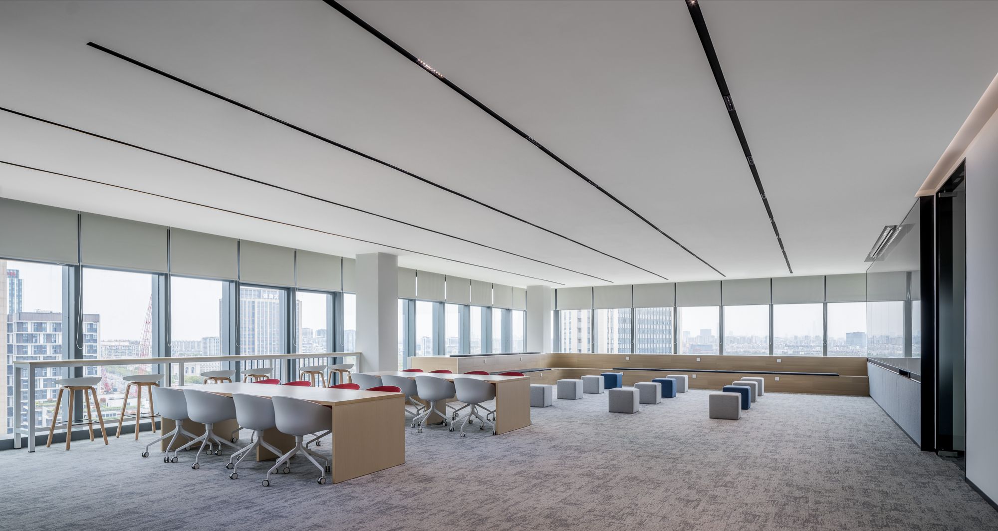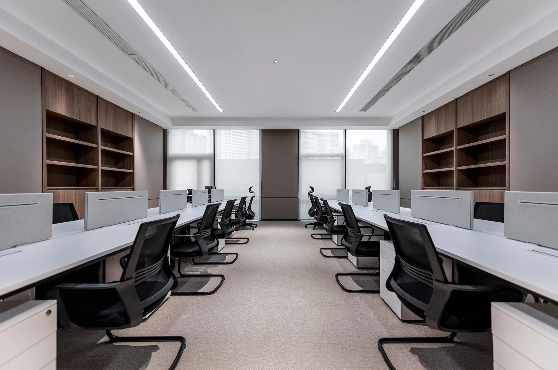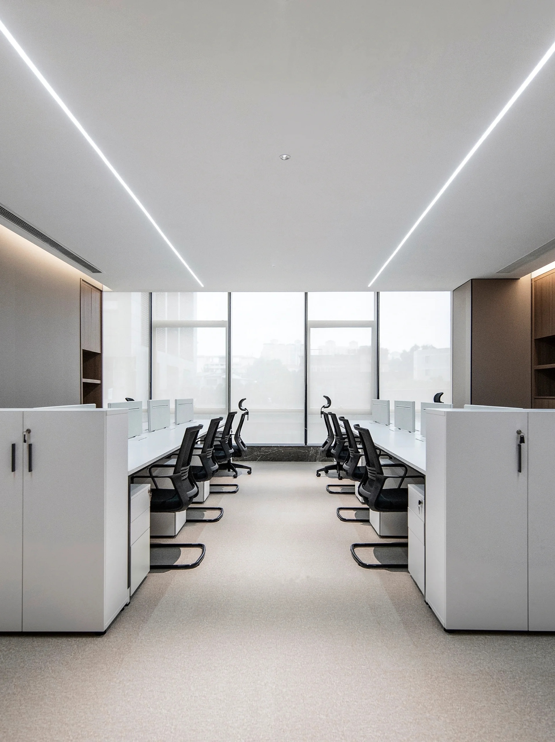 开放办公区采用现代简约的桌椅配置,桌面配色延续前厅木色系列,合理的通道设计和移动办公设备的摆放,使得员工能够方便地进出和移动。同时,裸顶的设计搭配矩阵排列的条形灯营造出强烈的空间秩序感和延展性。