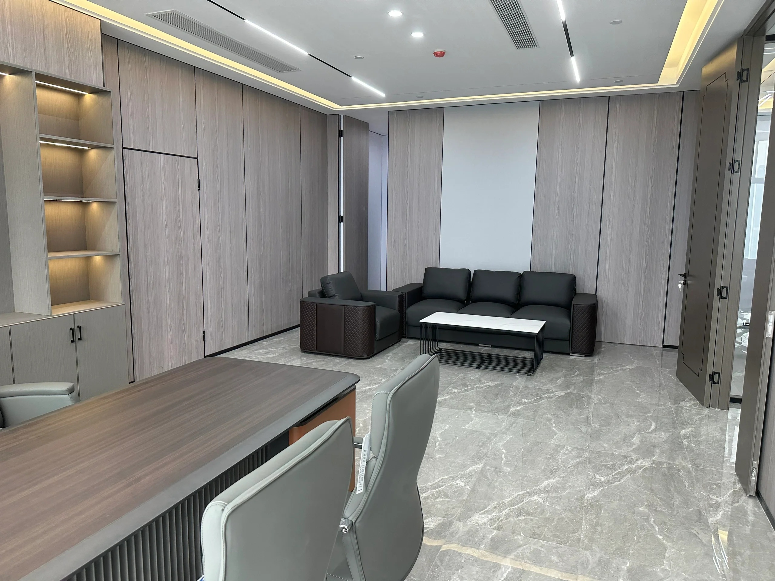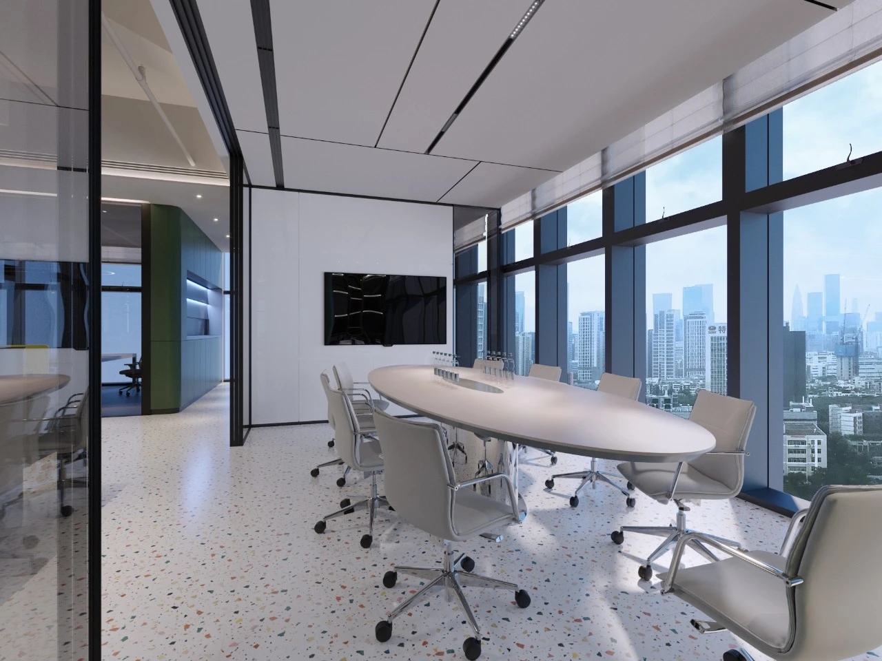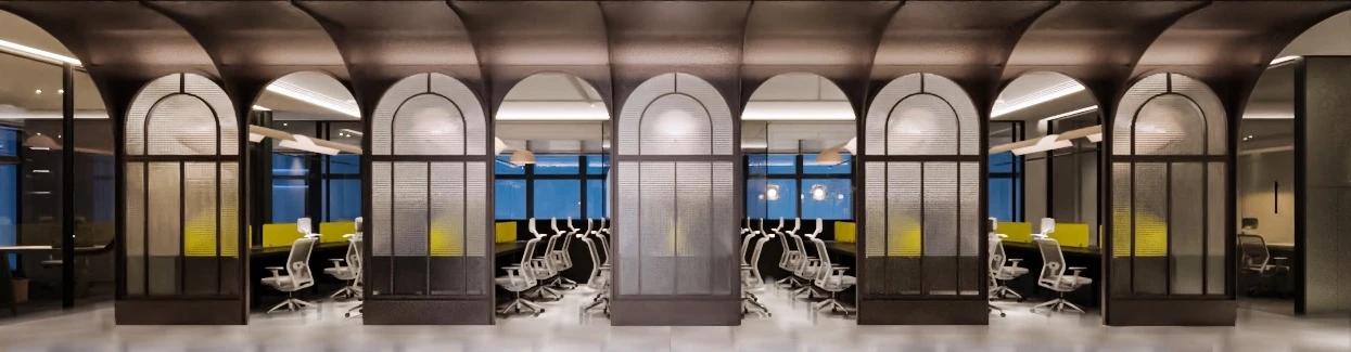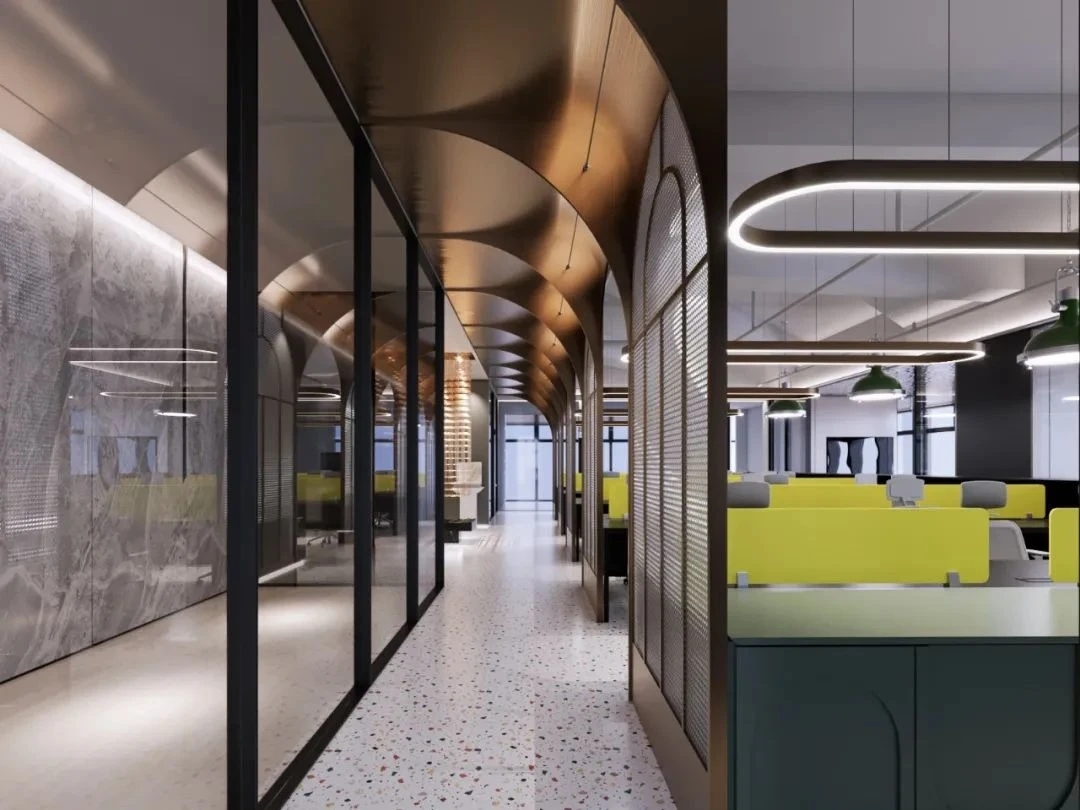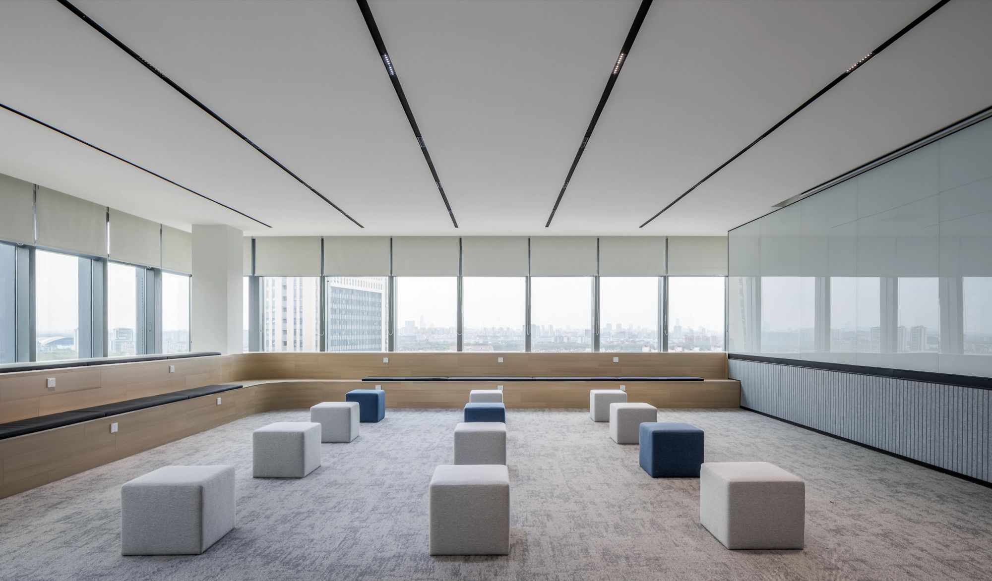 开放办公区采用现代简约的桌椅配置,桌面配色延续前厅木色系列,合理的通道设计和移动办公设备的摆放,使得员工能够方便地进出和移动。同时,裸顶的设计搭配矩阵排列的条形灯营造出强烈的空间秩序感和延展性。