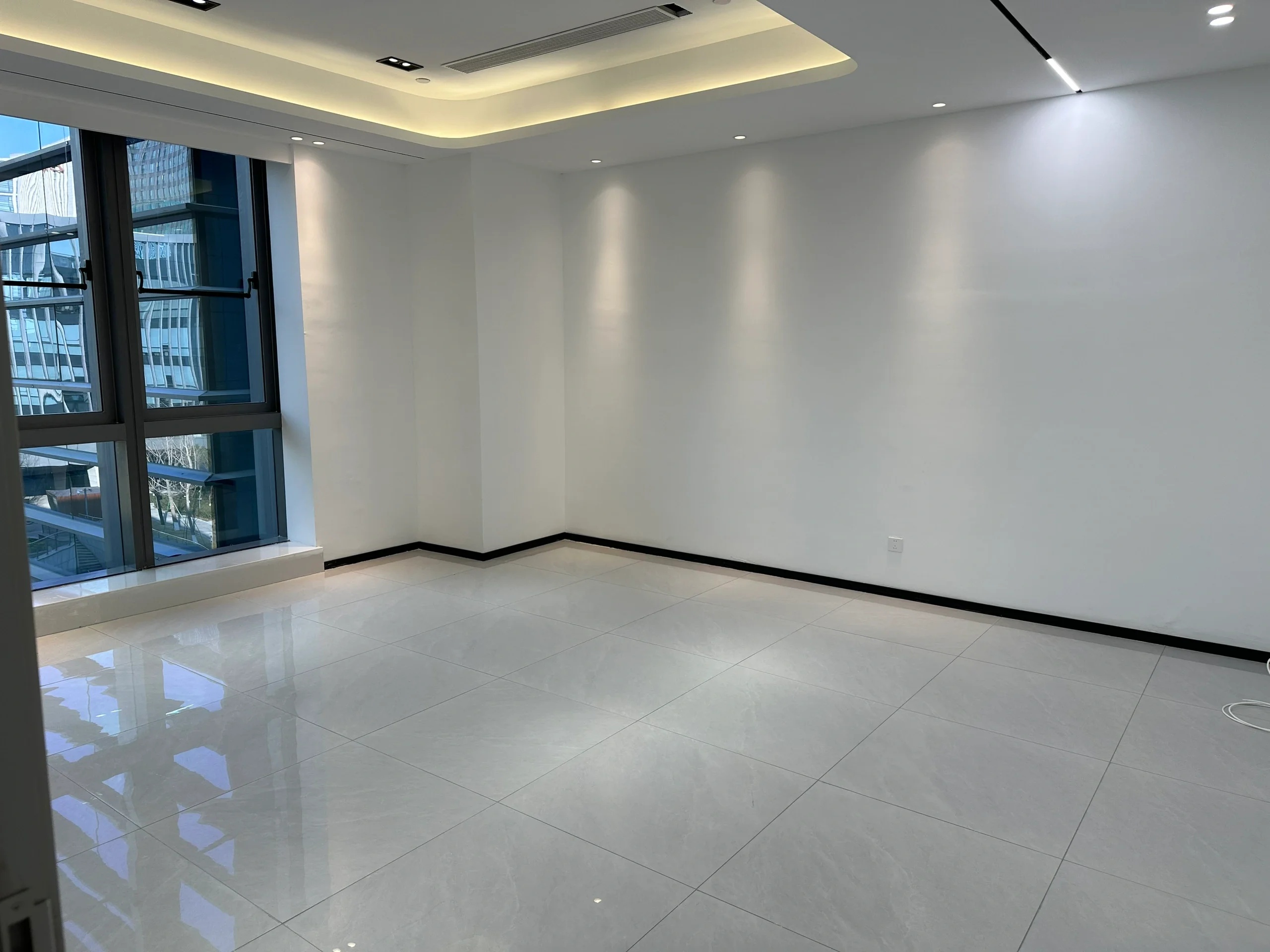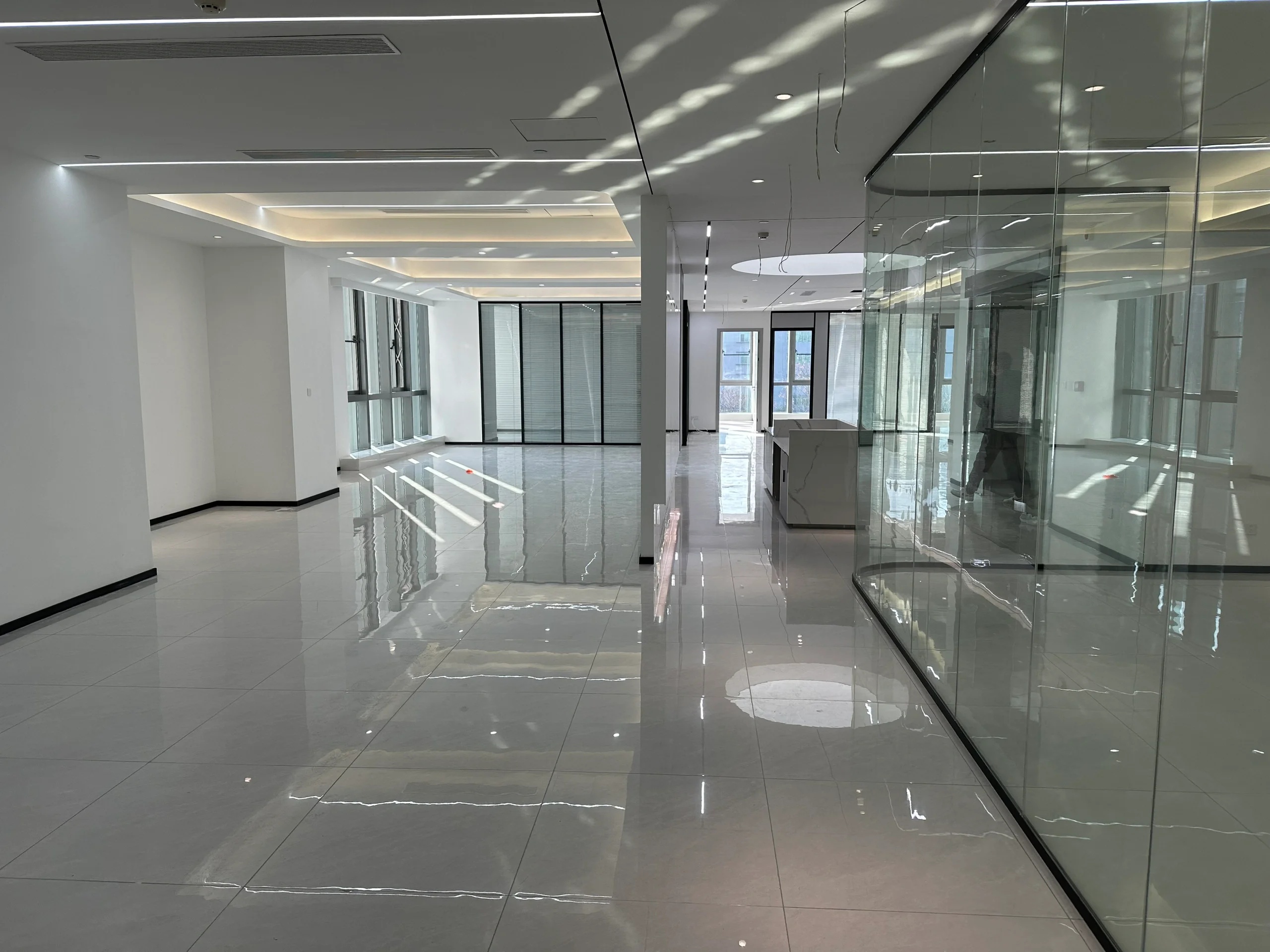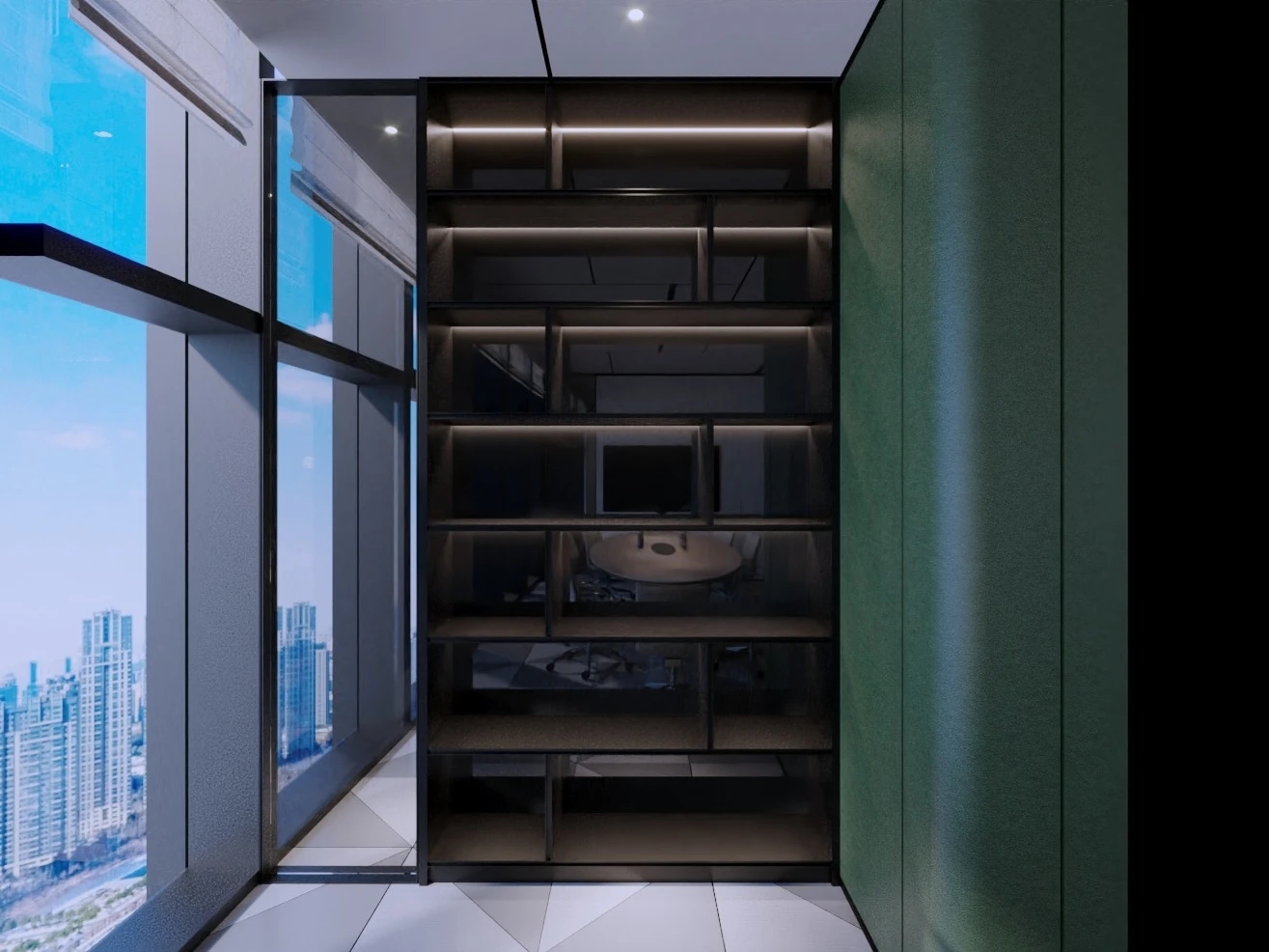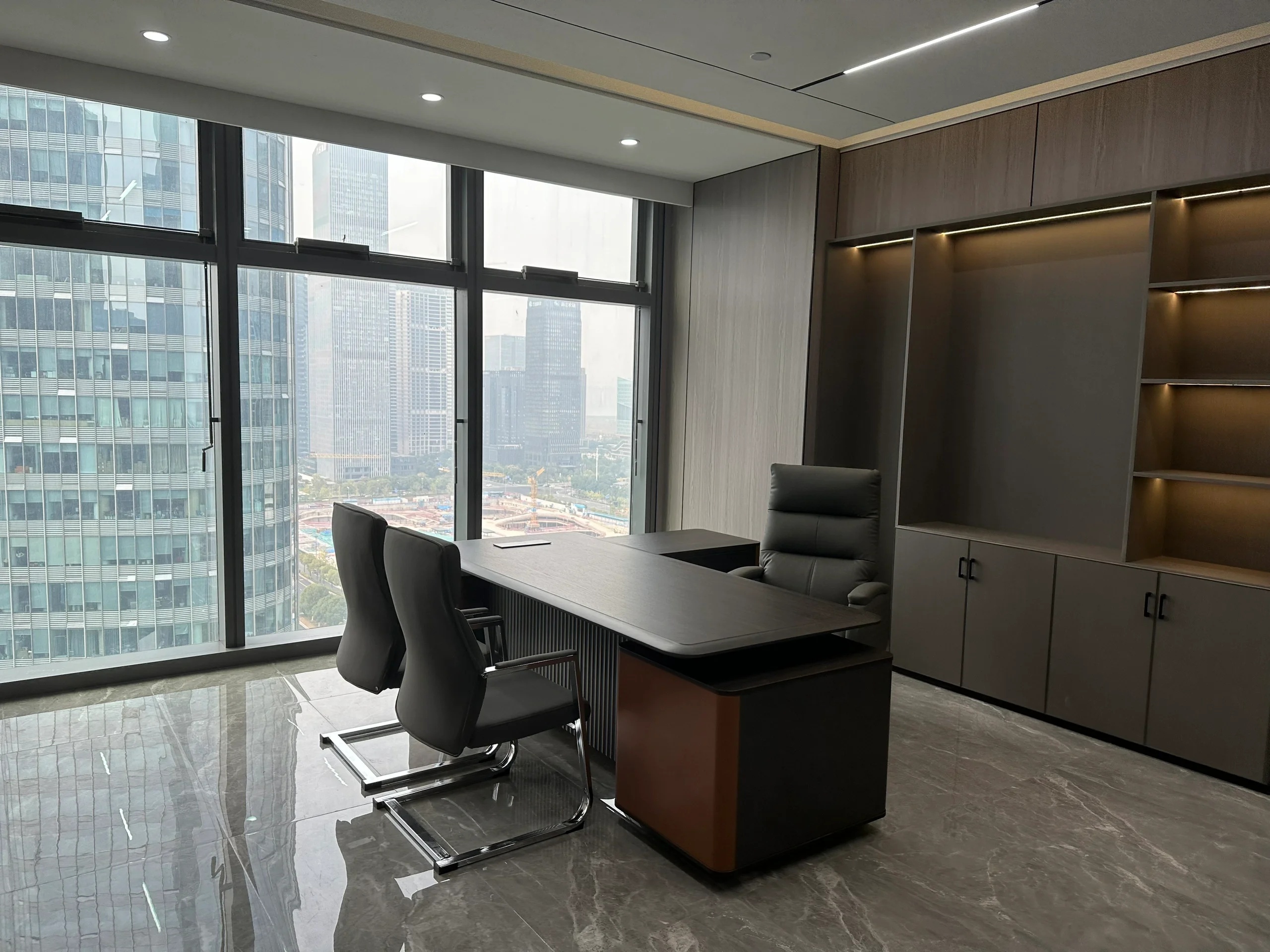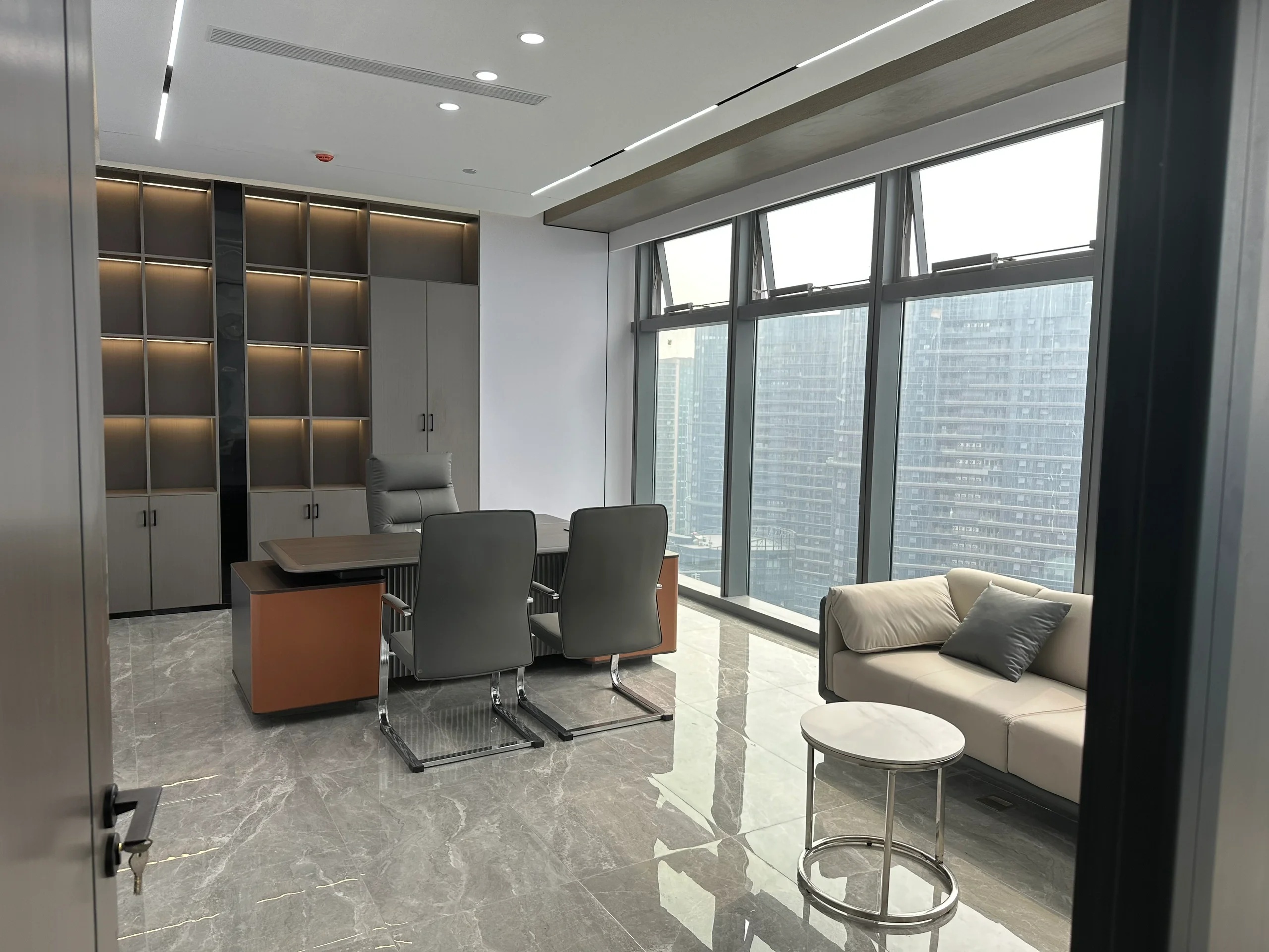 整体空间三面为落地窗,采光极好。我们利用可以发挥的墙面,以墨绿色皮革包裹大楼结构柱,加以金属的银灰色、古铜金点缀,复古感和科技感由此得以体现。