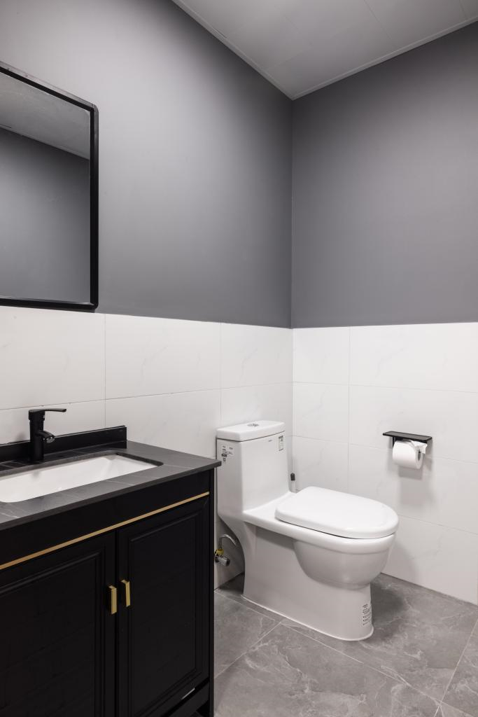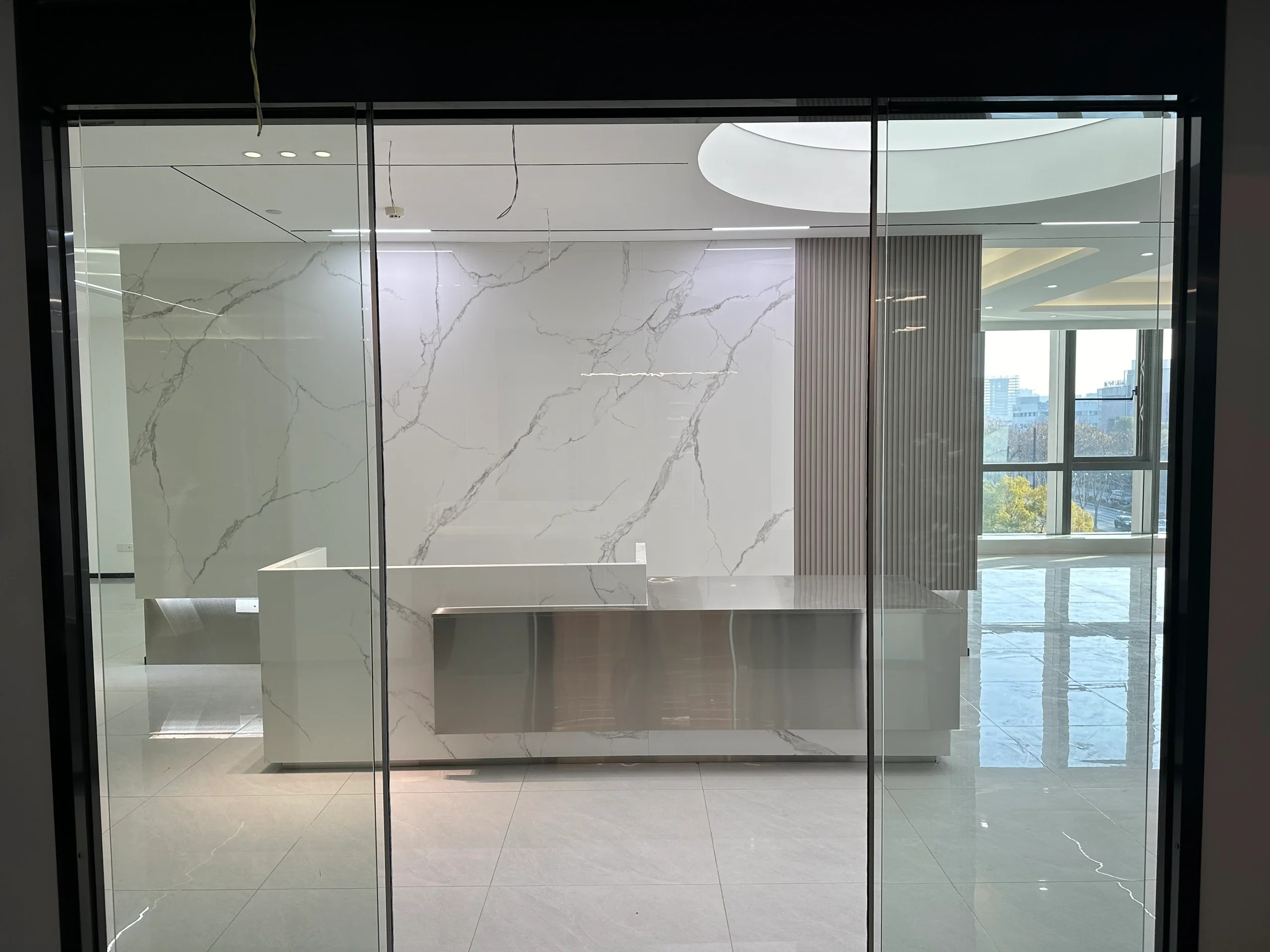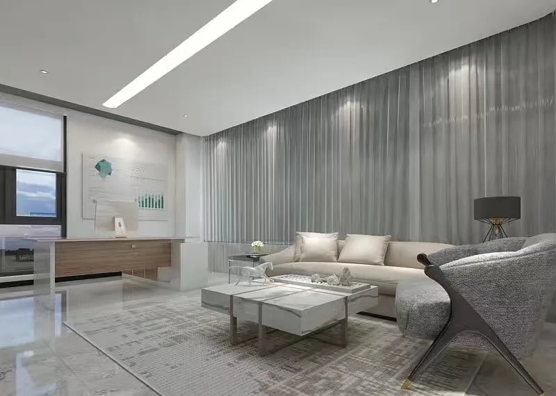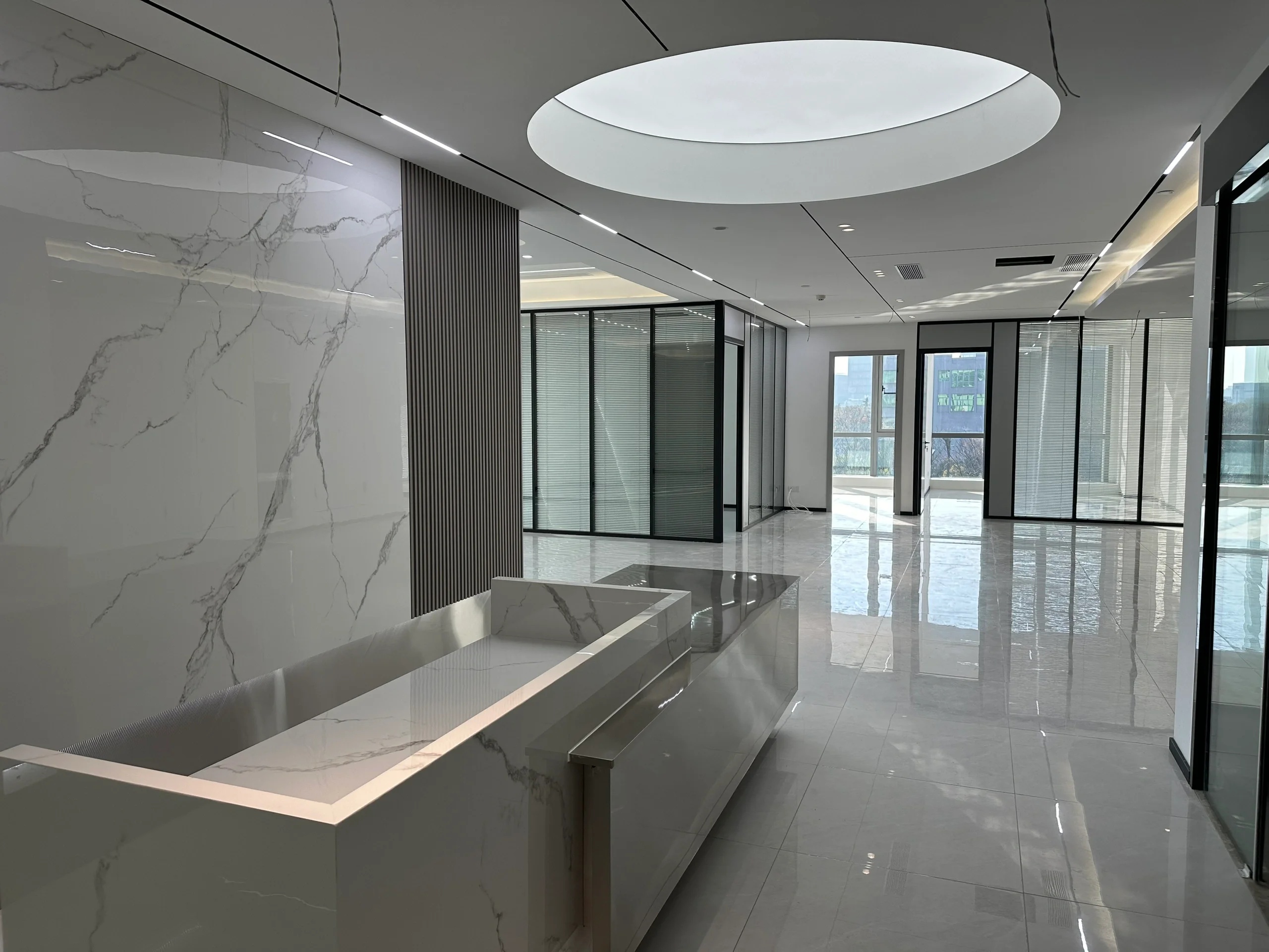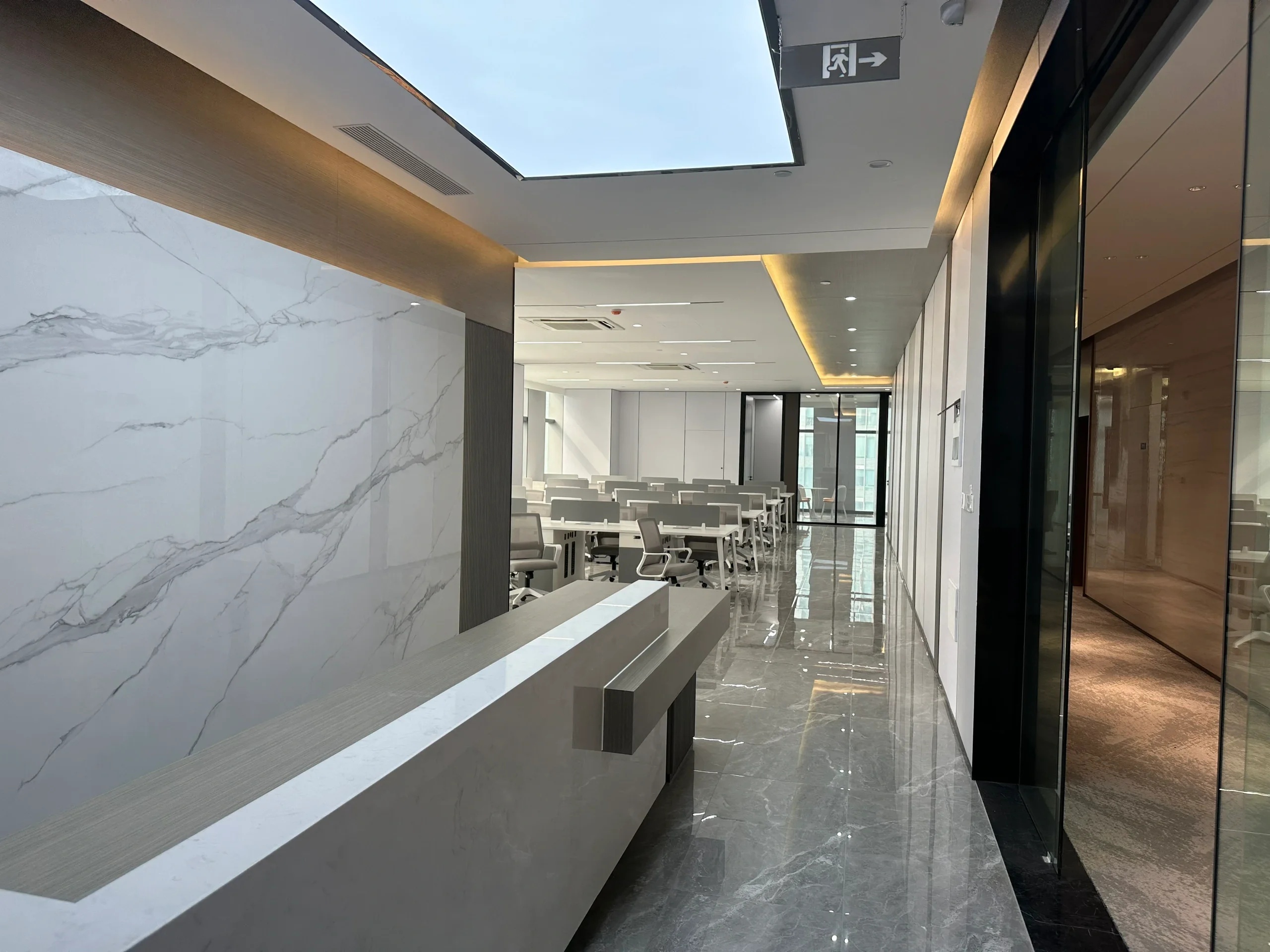 前厅设计以开阔明朗为特色,整体造型极简却不失高级感。垂直表面采用木饰面,为空间注入自然温暖感,而白色柜面和灰色地毯的搭配则增添了清爽干净的氛围。背景墙的氛围灯和前台的艺术灯点缀,进一步提升了空间的视觉吸引力。淡化的设计痕迹,呈现出简洁的轮廓和细致的细节,以小见大的方式展现出空间的专业性和高效性。