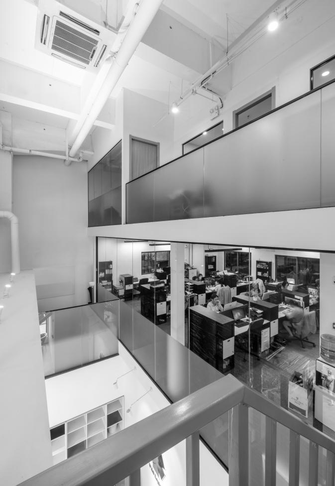 项目的整个设计中,可以说“光”参与了空间的创造与再组织。原始的项目现场可以由两个词汇概况:“超高”、“巨暗”。项目现场的层高有十米之高,但采光面有且仅有一面,且窗洞高度较矮。面对现状建筑,设计师决定保证原有建筑结构的完整性,同时通过中庭的形式把受光面分散到室内的所有空间,使光影与空间交融产生无限的可能性。更是利用错层楼板的搭建,增强各功能空间的连贯性,以满足现代办公的空间需求。
