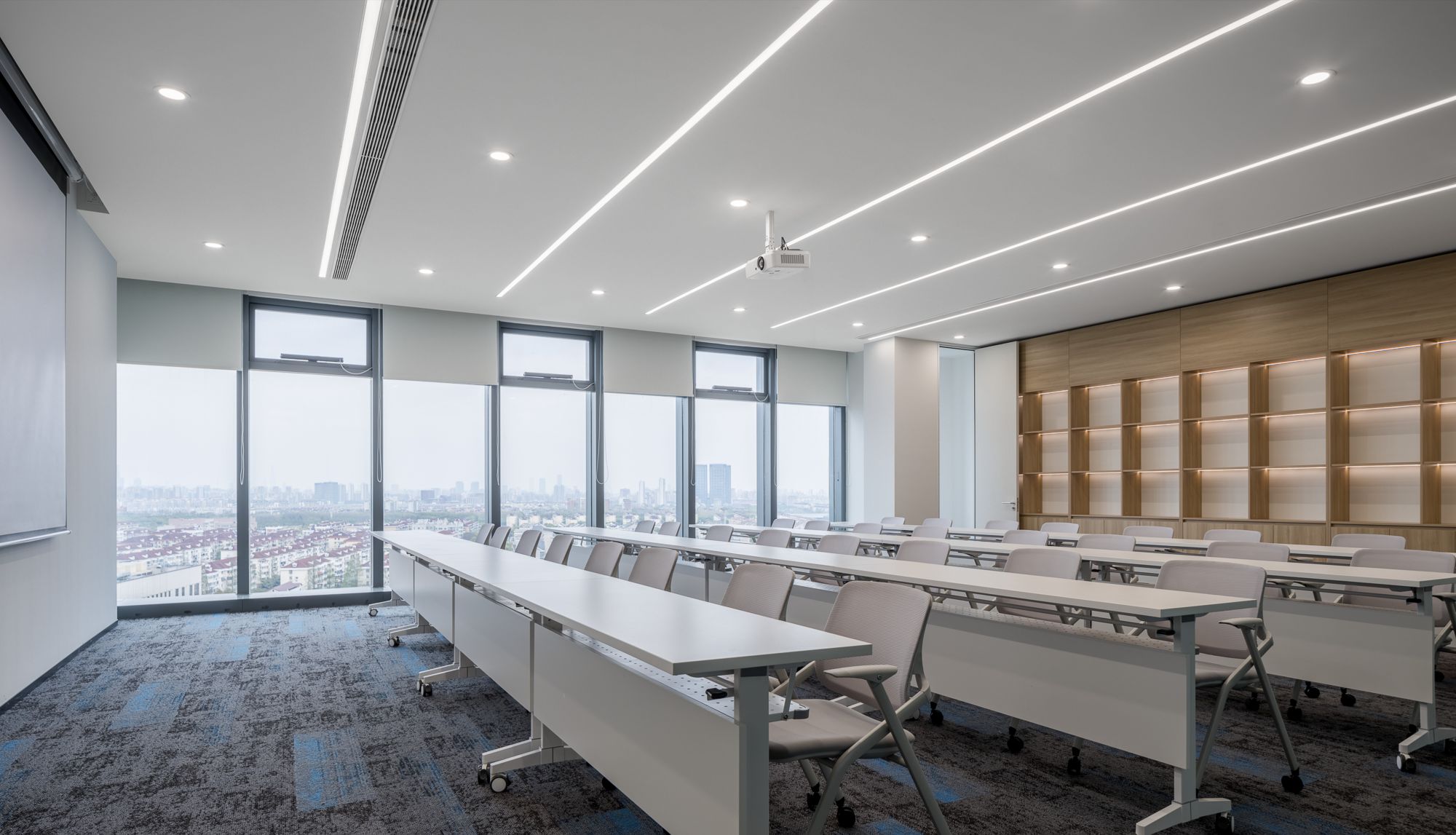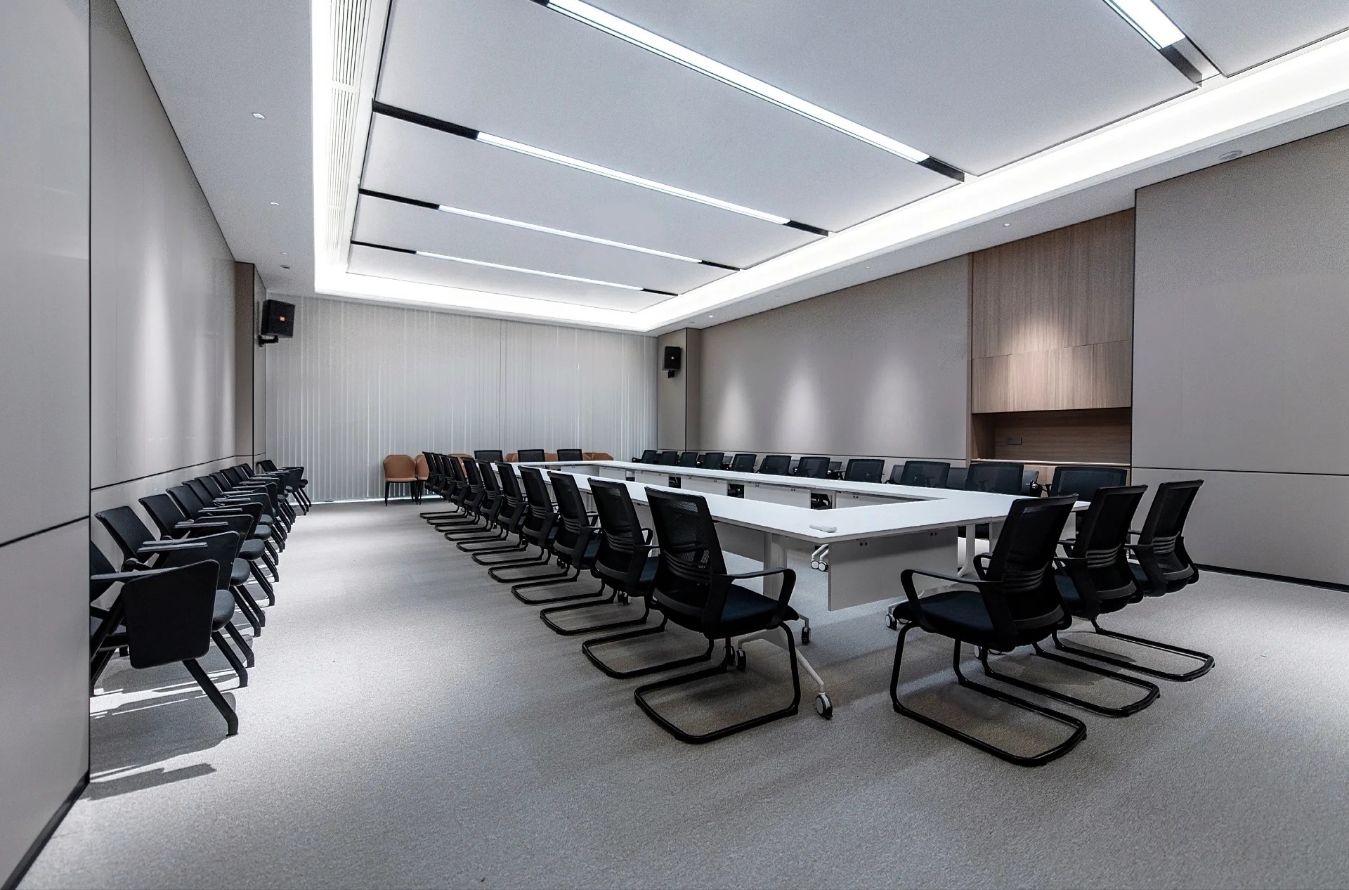 培训室兼具投影和会议功能,模块式背景柜与前台呼应,延续采用原色木饰面板,为空间增添精致的细节质感,体现专业与品质。整面落地窗消除了内外空间的界限,为空间带来充足的自然光线和开阔的视野,为参会者提供了舒适宜人的环境,促进高效的沟通与协作。
