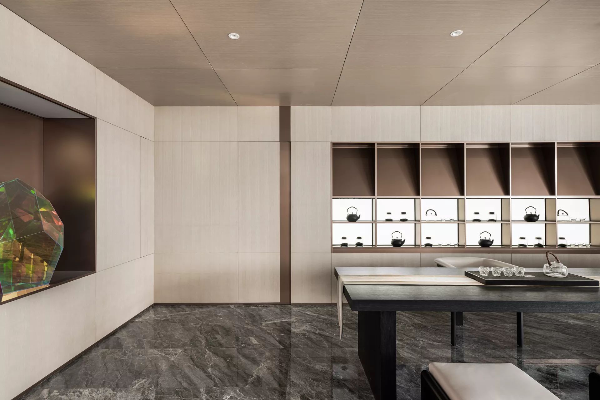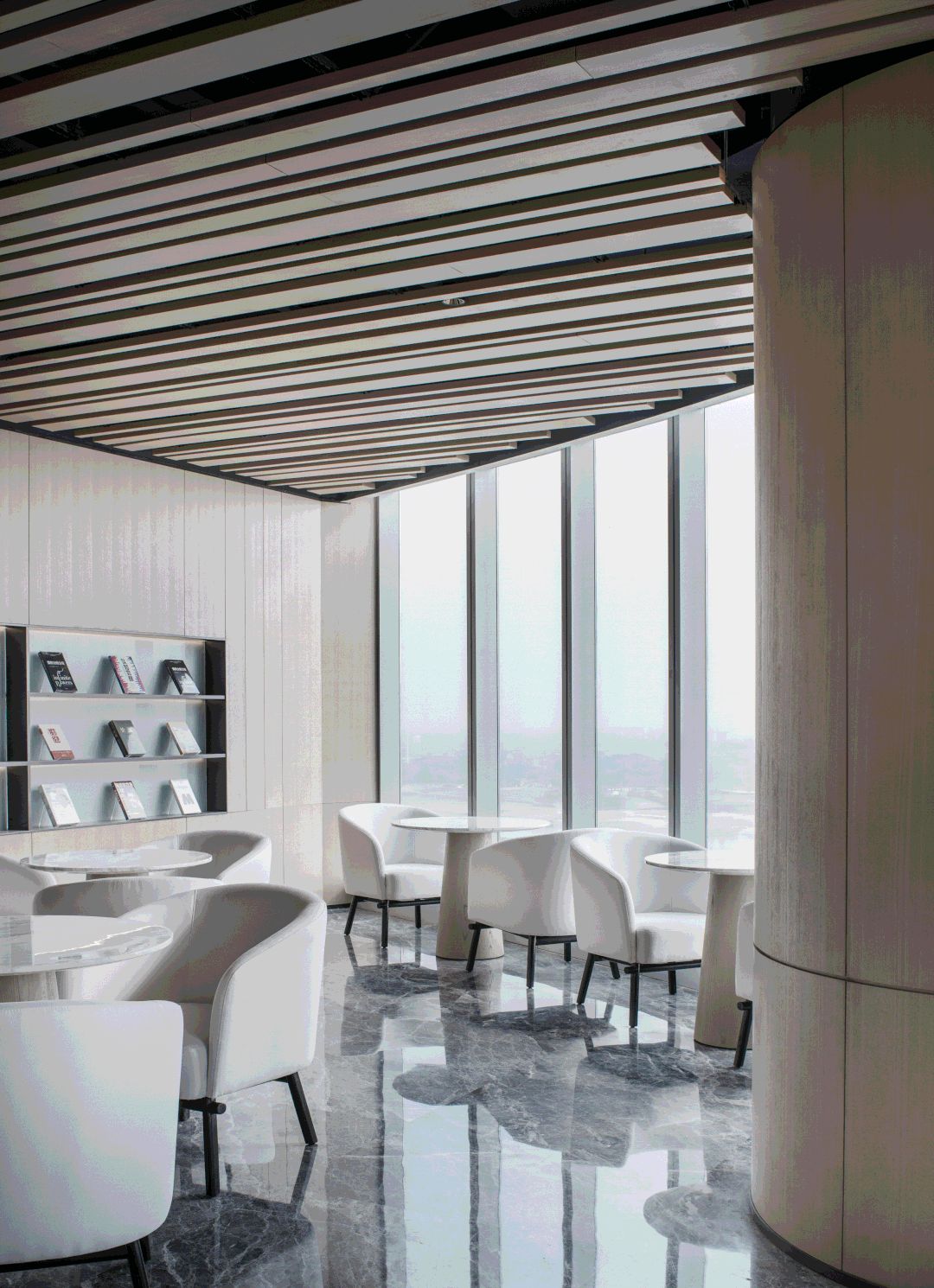 开放式茶水间打破传统座位的分布方式,创造员工彼此亲密关系的重要场所。在这里,他们可共享美味佳肴,或小憩放松独处美好时光。当办公的乌托邦偶遇的自然水景,空间再被诠释。充满节奏感的线条,随着欢沁的阳光在空间里随意跳跃,这一切都基于企业对员工更细致的关怀。