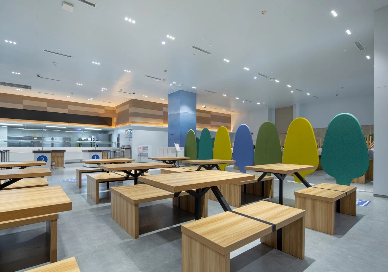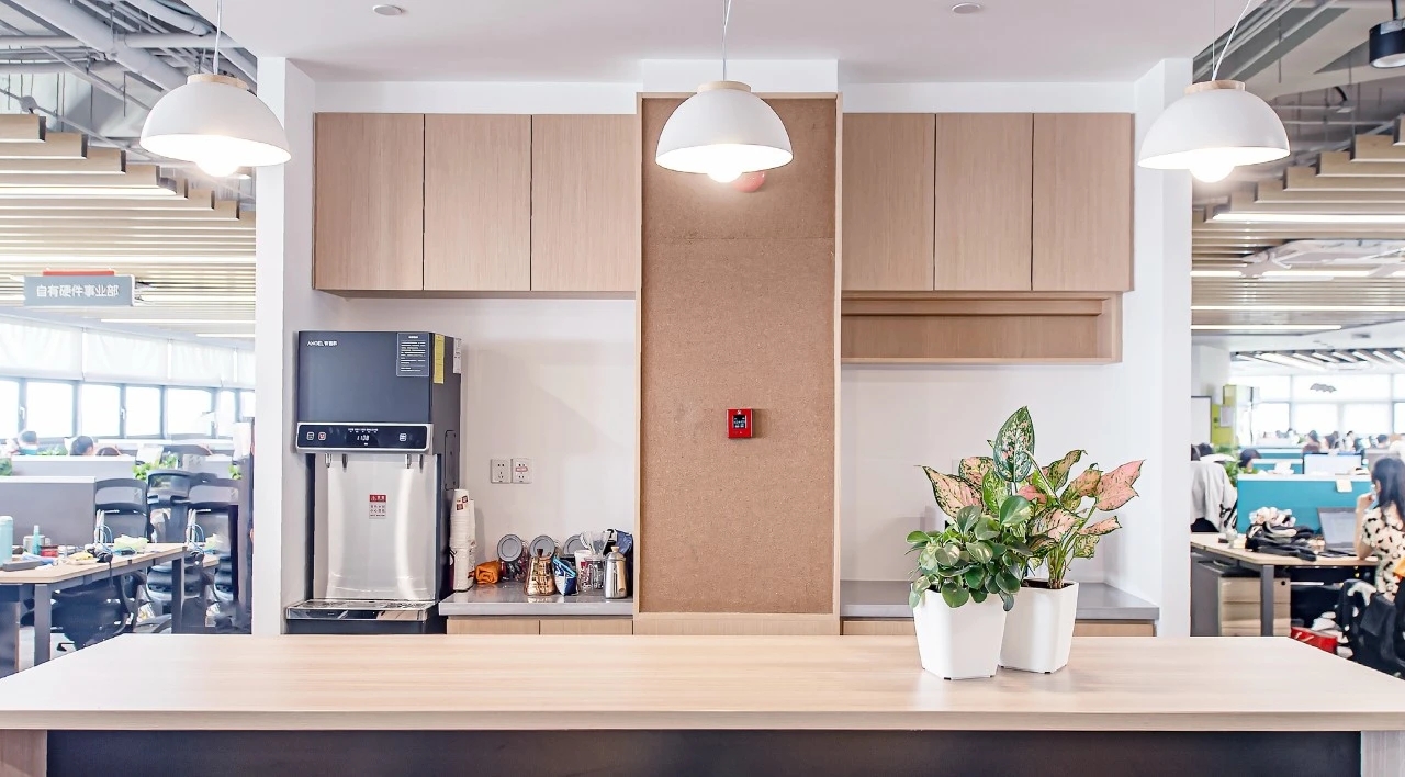 开放式茶水间与办公区仅一步之遥,米白吊灯与浅木纹吧台让空间自然明亮,有助于休息和放松。通过淡化紧张的办公区与这处闲逸小憩之地的边界,让动静交融,自成一番趣味。