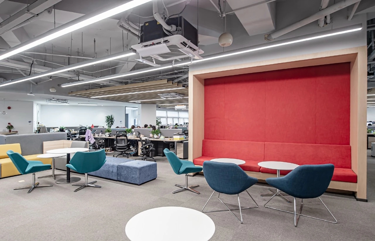 通过大胆的装饰布局,搭配跳跃的颜色,模糊了休闲区域与办公区域的边界,让整个空间氛围跳跃起来。