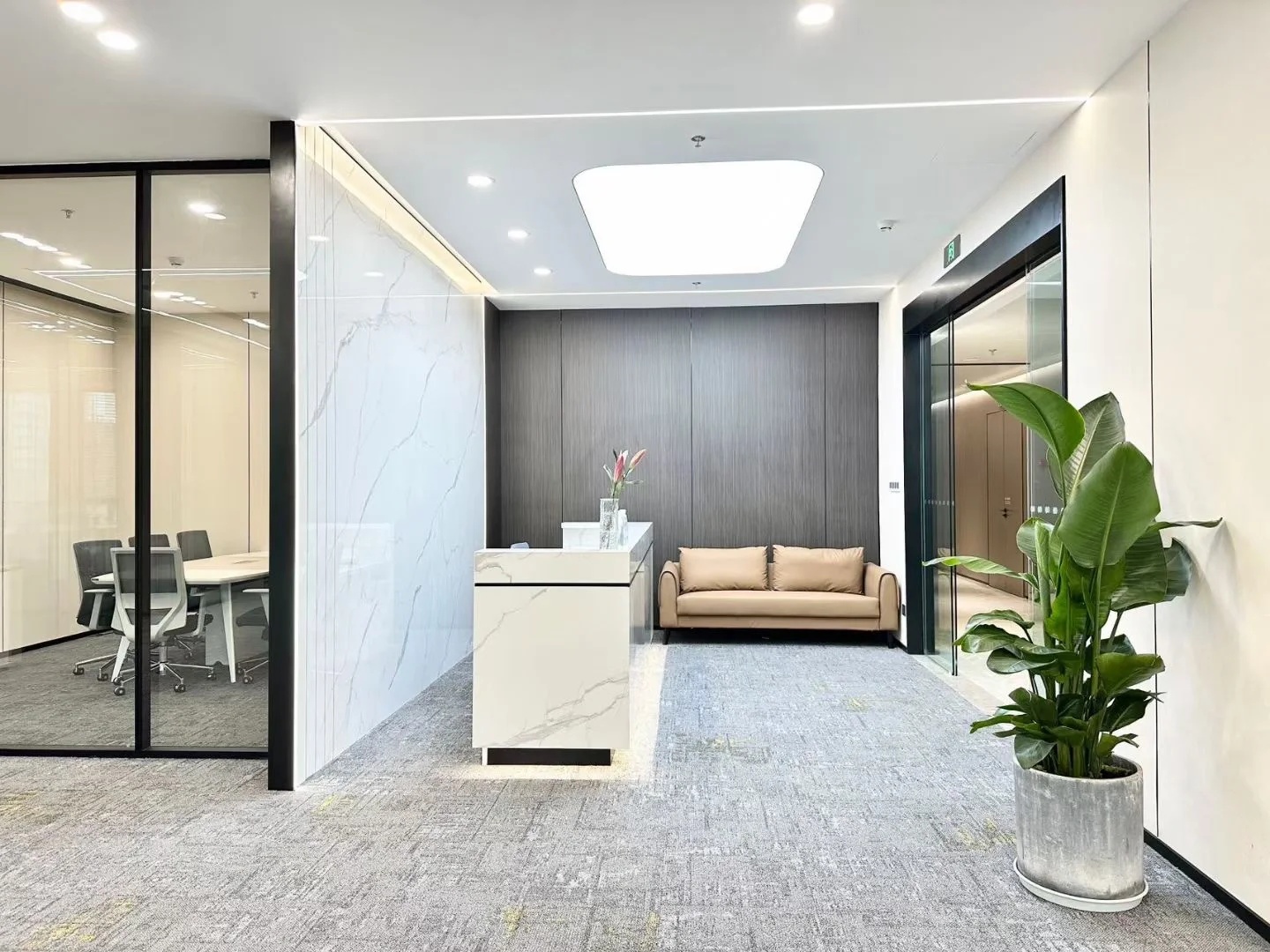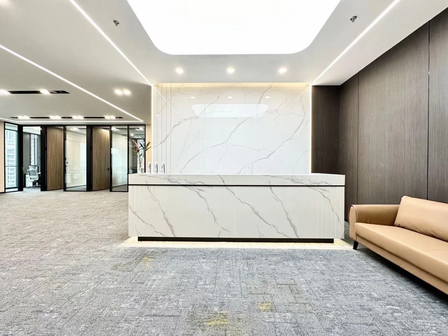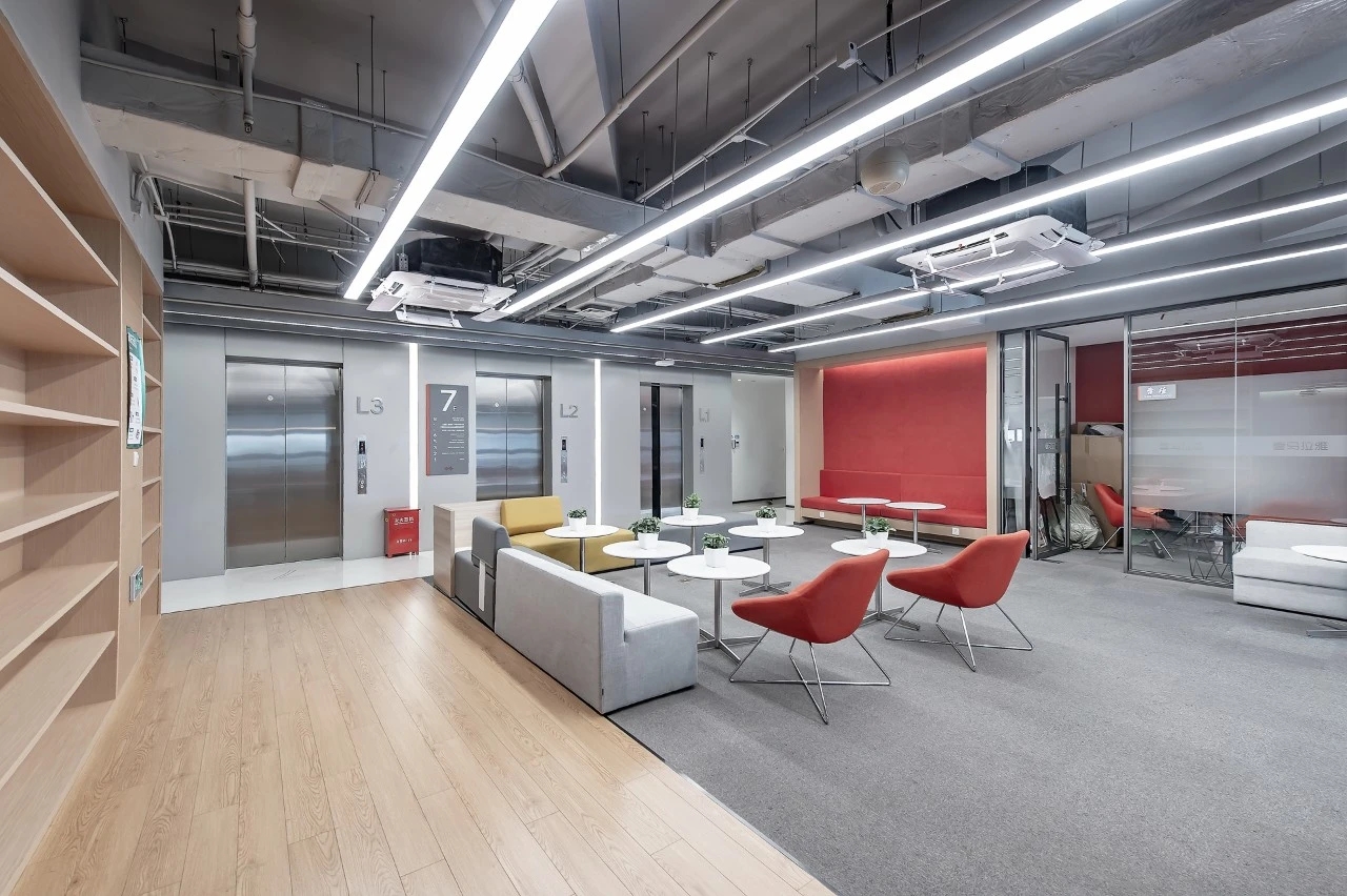 在兼顾传统办公空间高效简洁的同时,运用相同色系饰材的延伸,由外向内,形成一条视野走廊,一出电梯就能够看到整个开阔的空间。