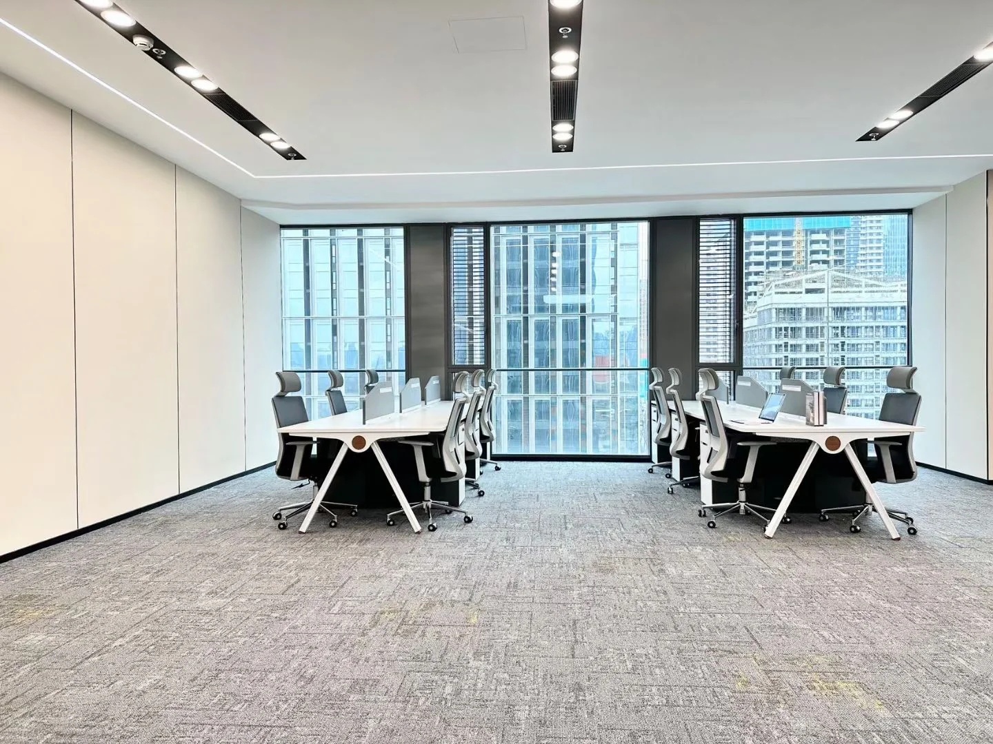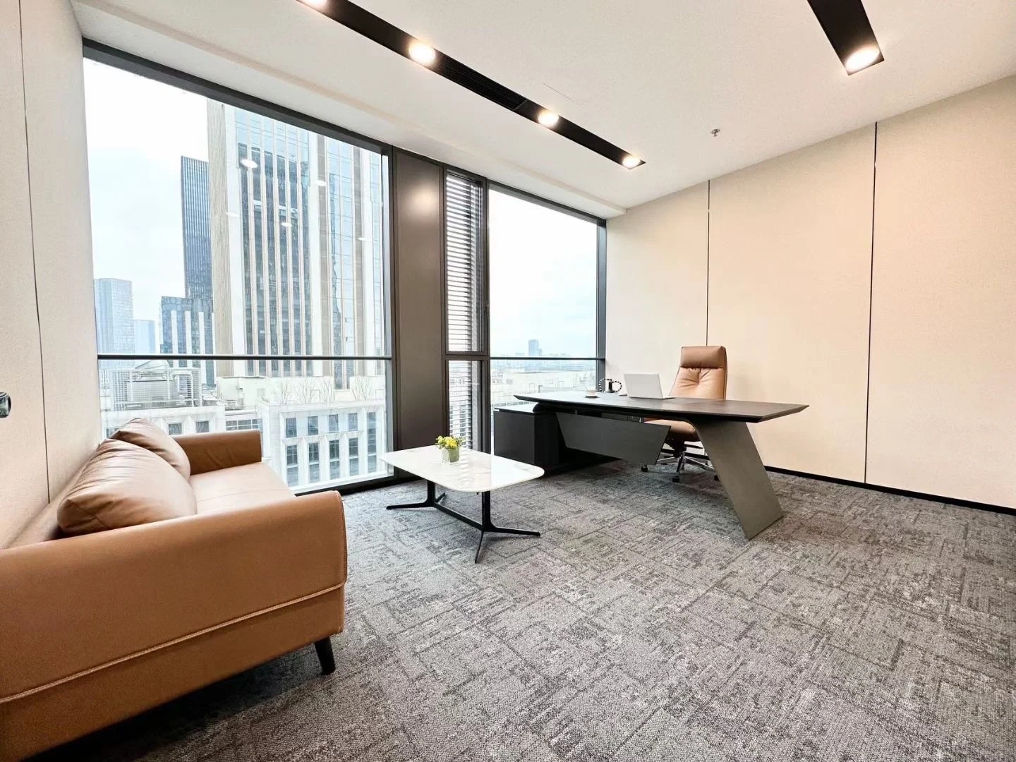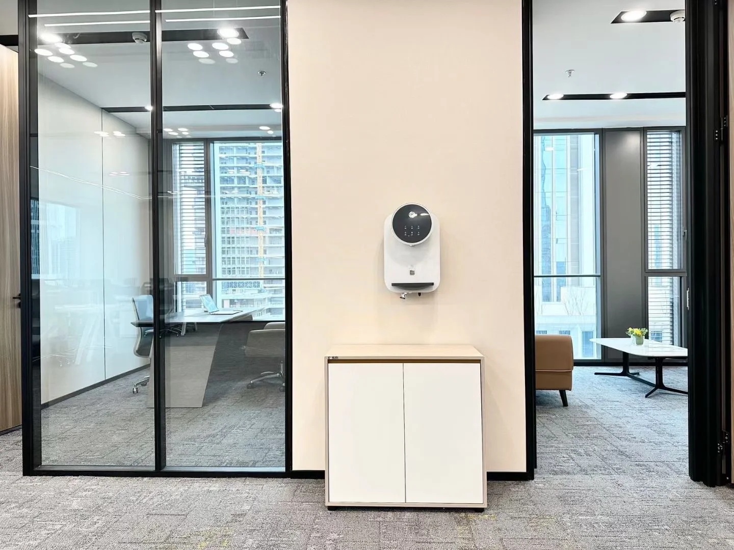 在兼顾传统办公空间高效简洁的同时,运用相同色系饰材的延伸,由外向内,形成一条视野走廊,一出电梯就能够看到整个开阔的空间。