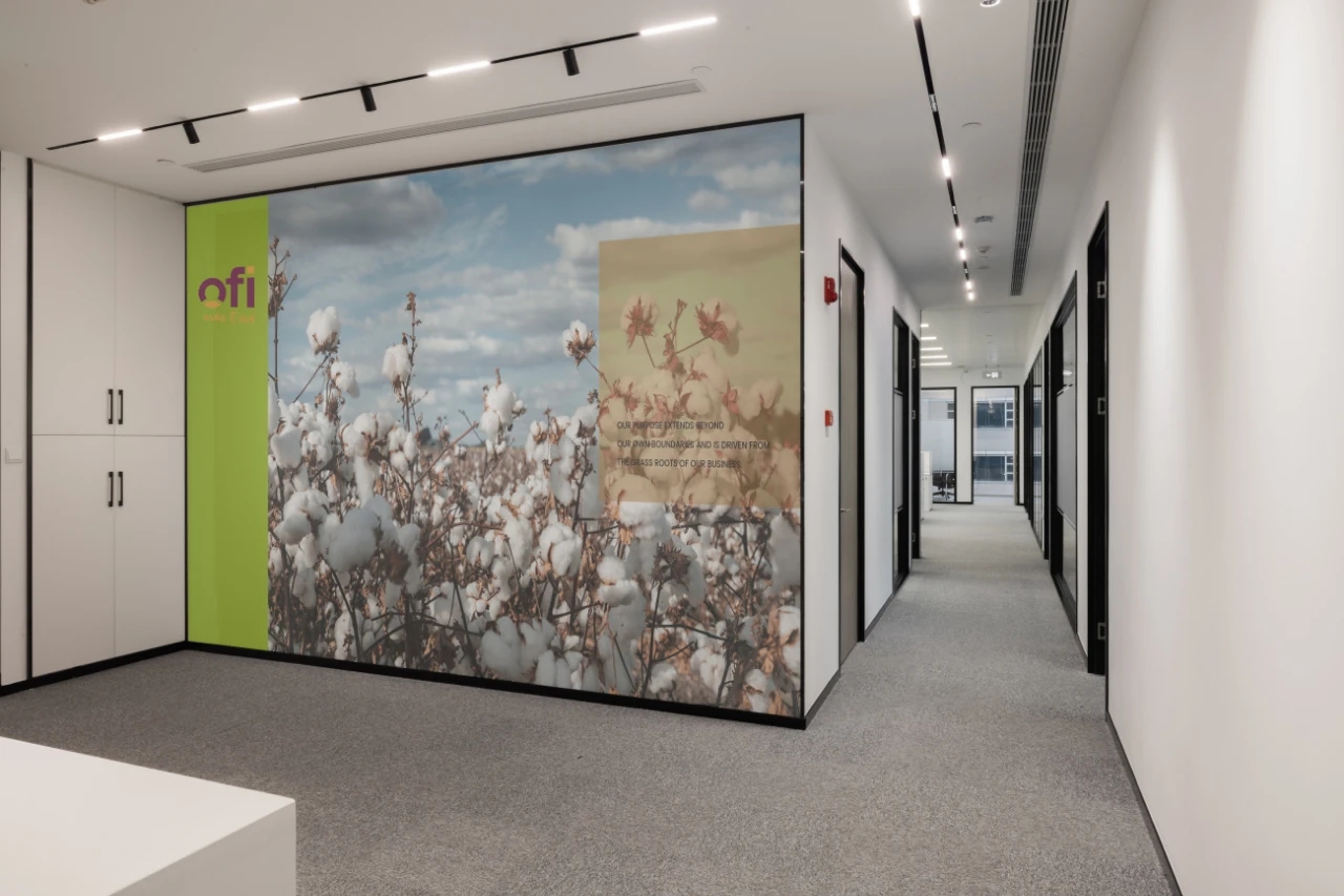 本项目中白色和黑色金属线条的搭配则显得空间简洁明净,让人能够安心思考。「纯白与绿色」这两个元素贯穿了整个空间,让这里可以成为OLAM事业的战场,也可以是精神纯白的乌托邦。设计师更是将企业的农产基地海报置于空间之中,为干净秩序的空间带来活泼的文化渲染,更将办公空间打造出一种“会呼吸的”轻盈感。