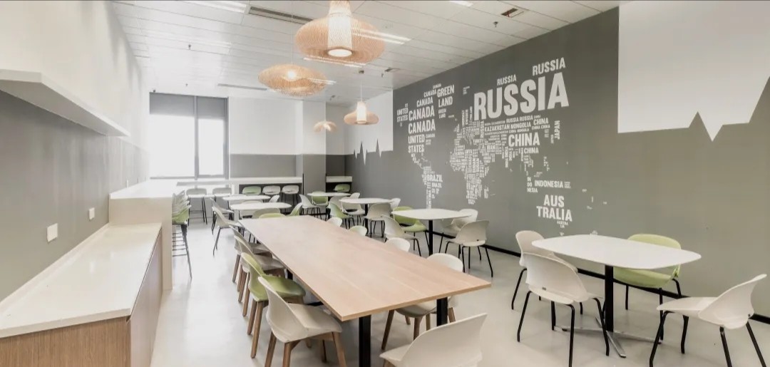公共空间软装元素采用世界地图墙纸,代表着企业多元文化交流融合的工作方式,也是企业产品走遍世界的象征。
