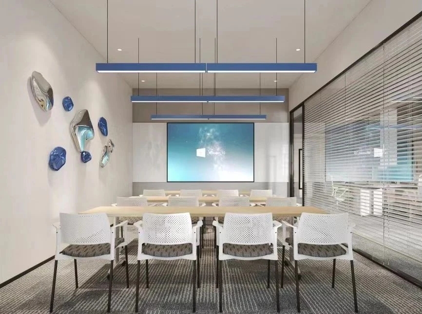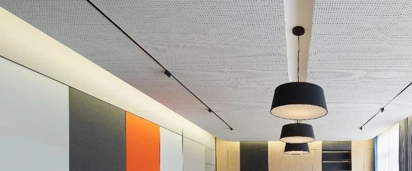 在会议室的顶面采用穿孔石膏板,这种材质可以有效地吸收噪音。穿孔自身能够帮助声音的吸收,这就如同共振器。通过这种方式,当声音进入到石膏板的空腔之中时,就会损失一定的能量,从而降低噪音所形成的混响。设计师在LED数字屏的背景墙上采用了可以降低噪音的定制穿孔铝板,并搭配上亚克力透光灯片,为原本沉闷的会议室增加了科技感。和高清的LED数字屏幕融合,增加灯光的韵律和氛围感。