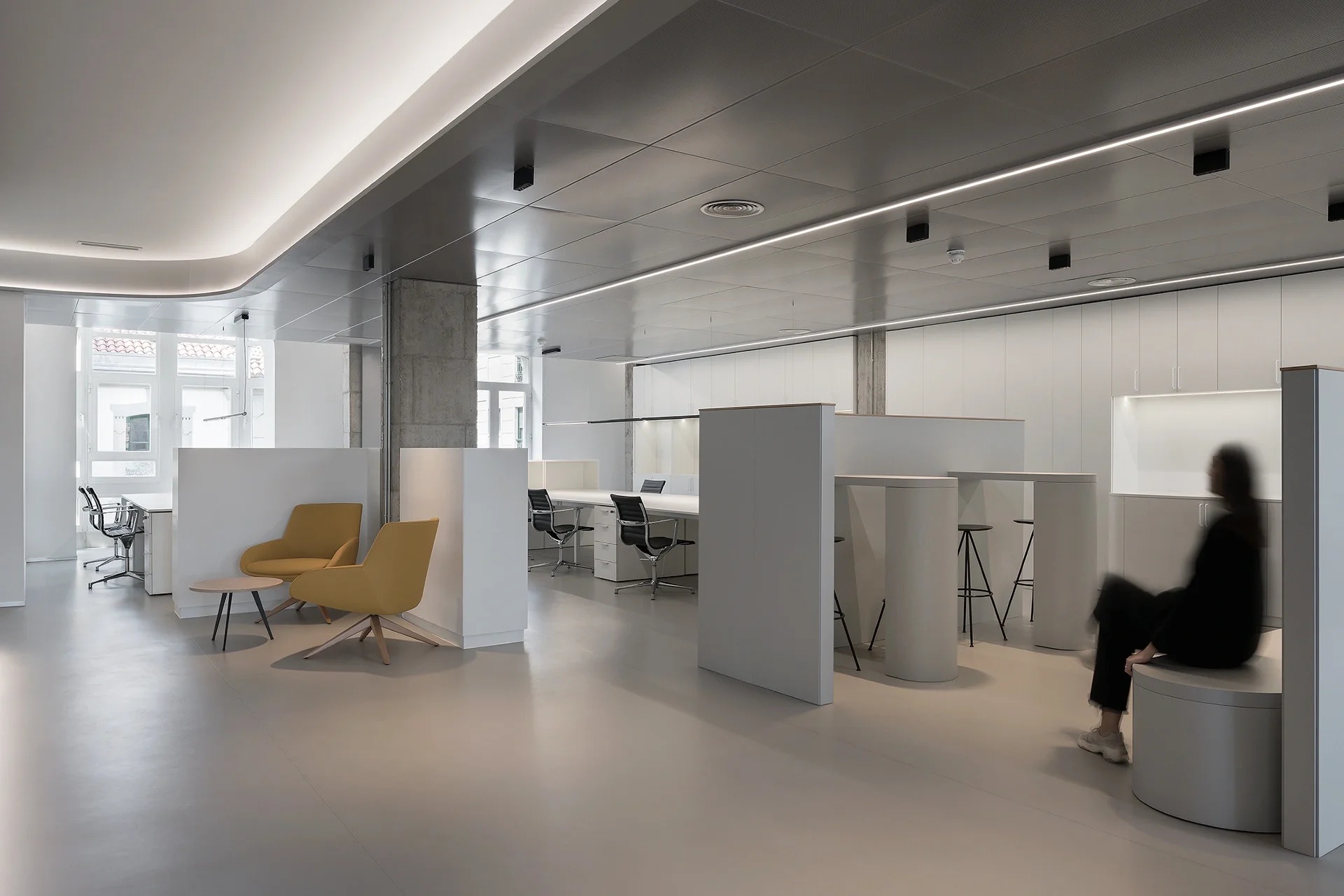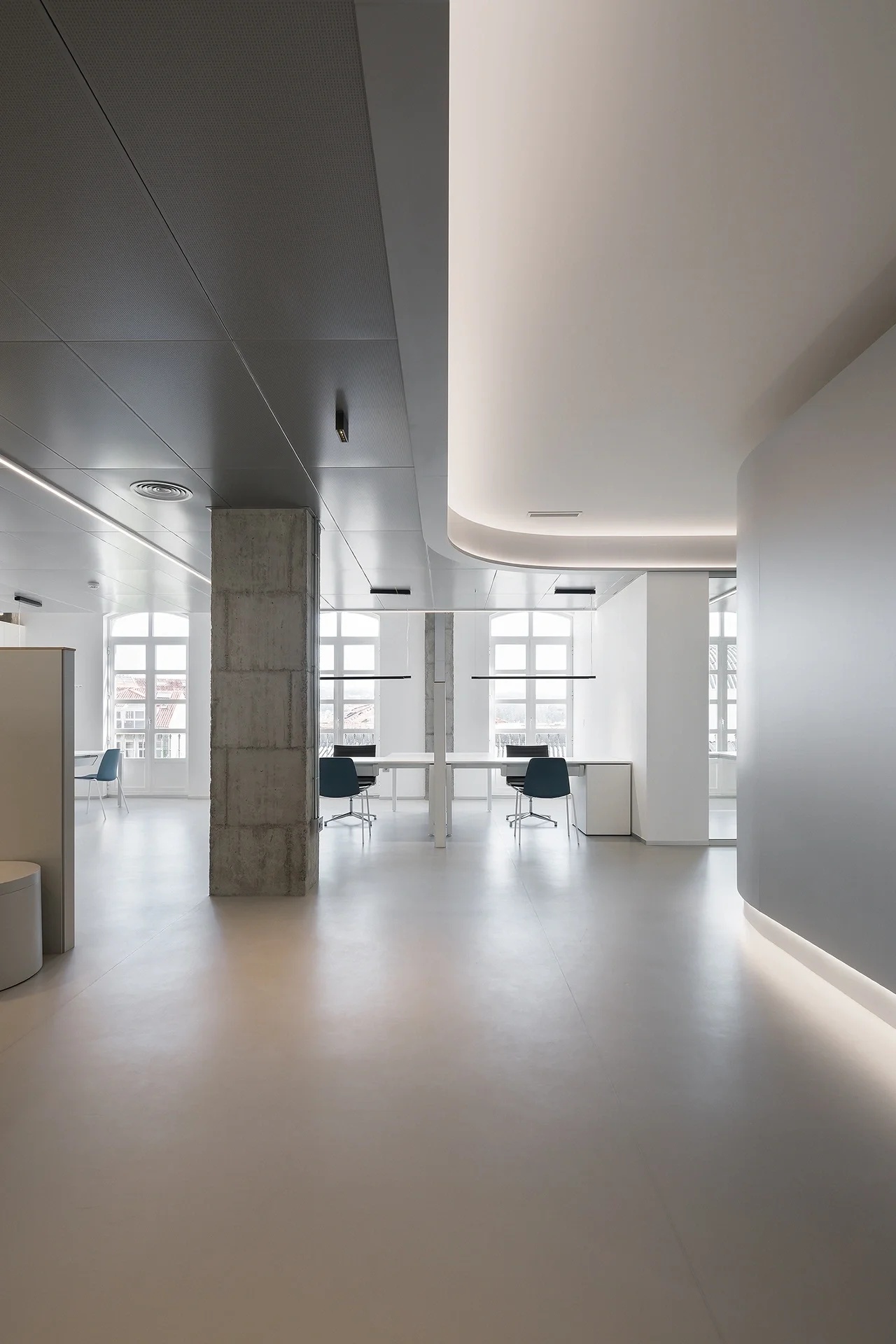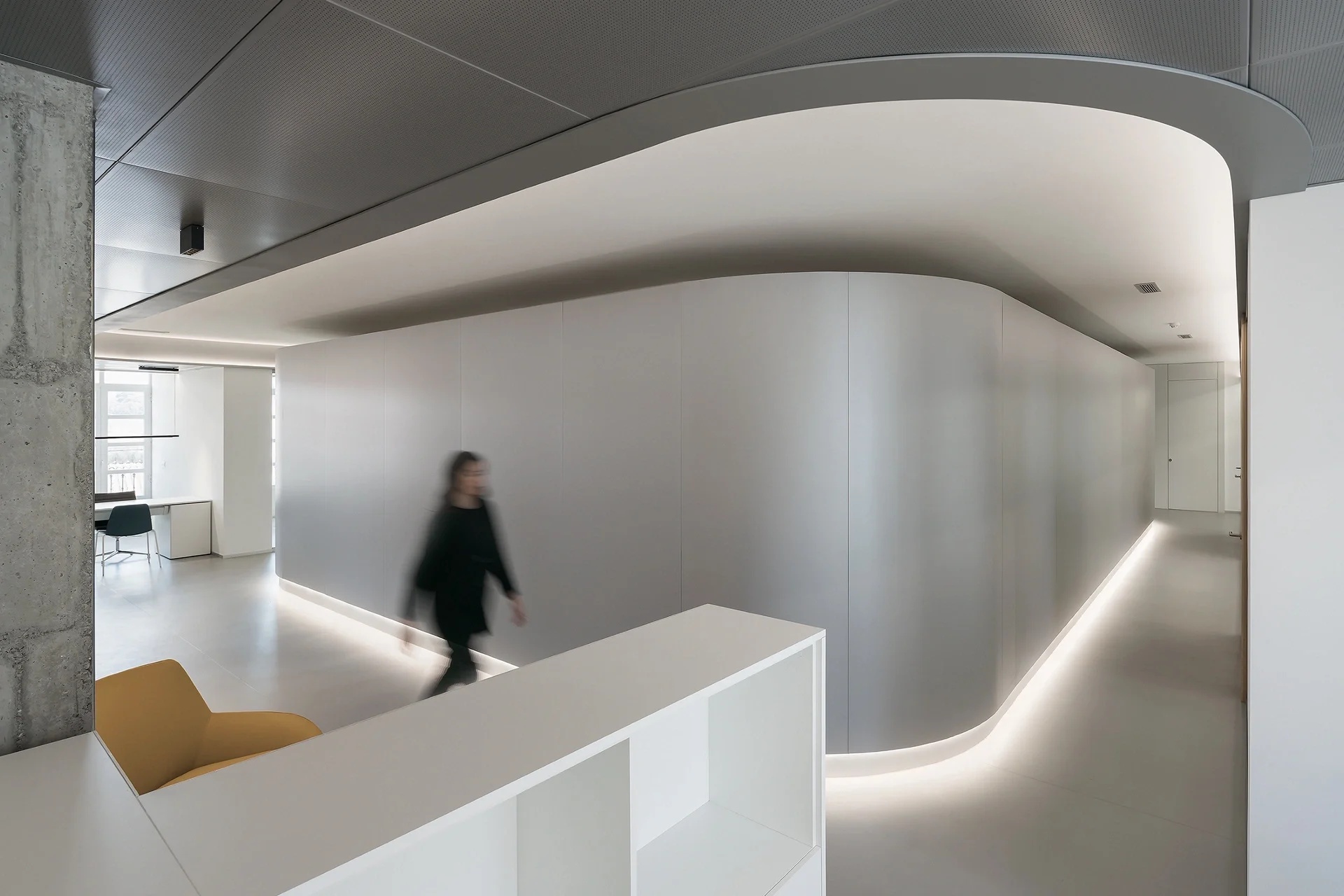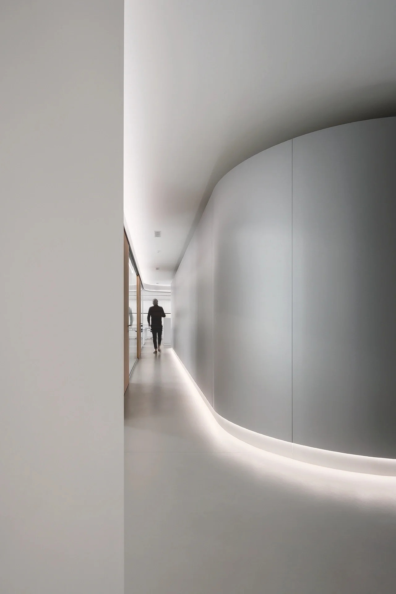 纯白色空间,模拟液态奶的流动特性,演绎出“流动”富有想象的建筑之美,品牌产品有序排列展示其中,是工作空间中具有品牌代表性的一道亮丽风景。