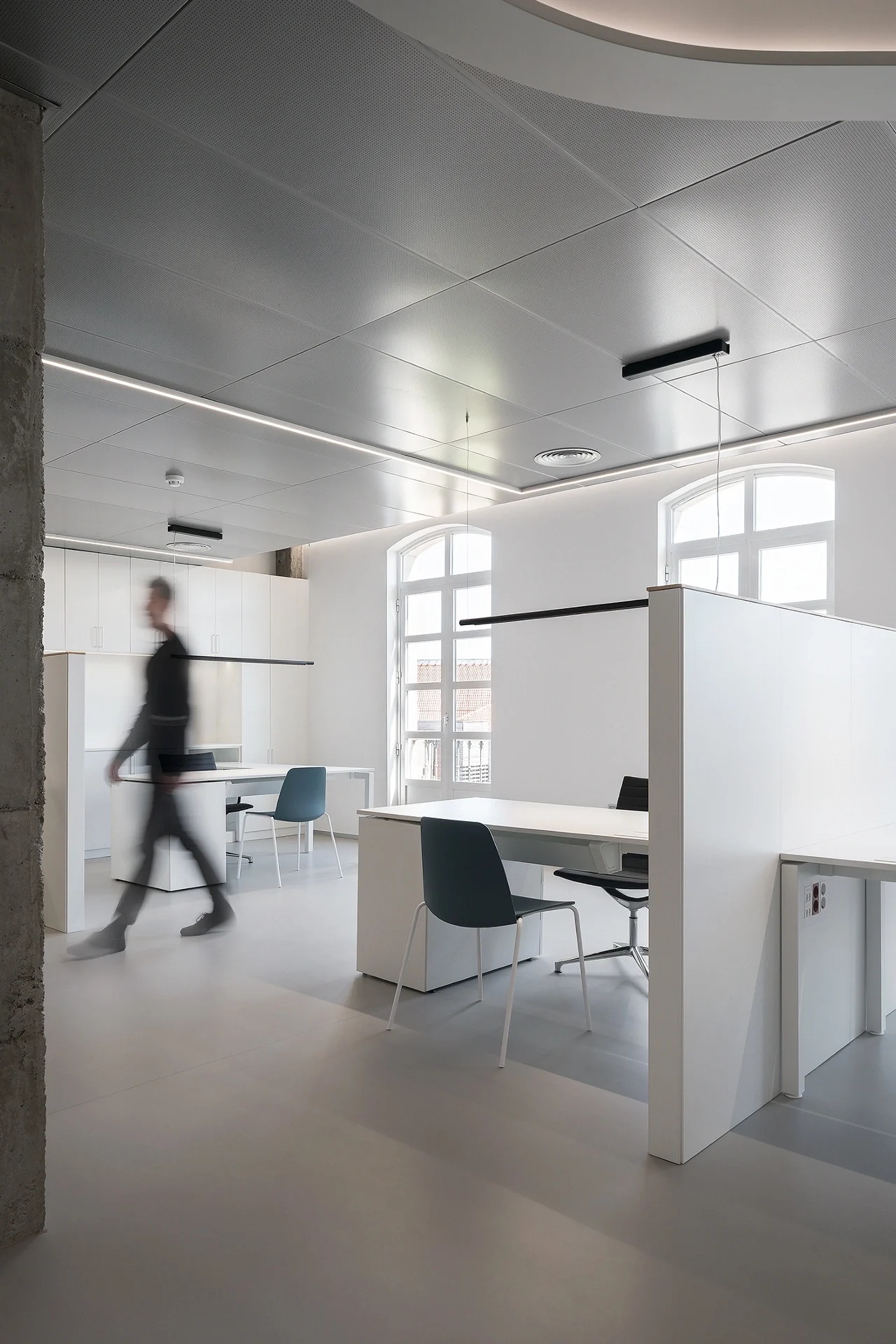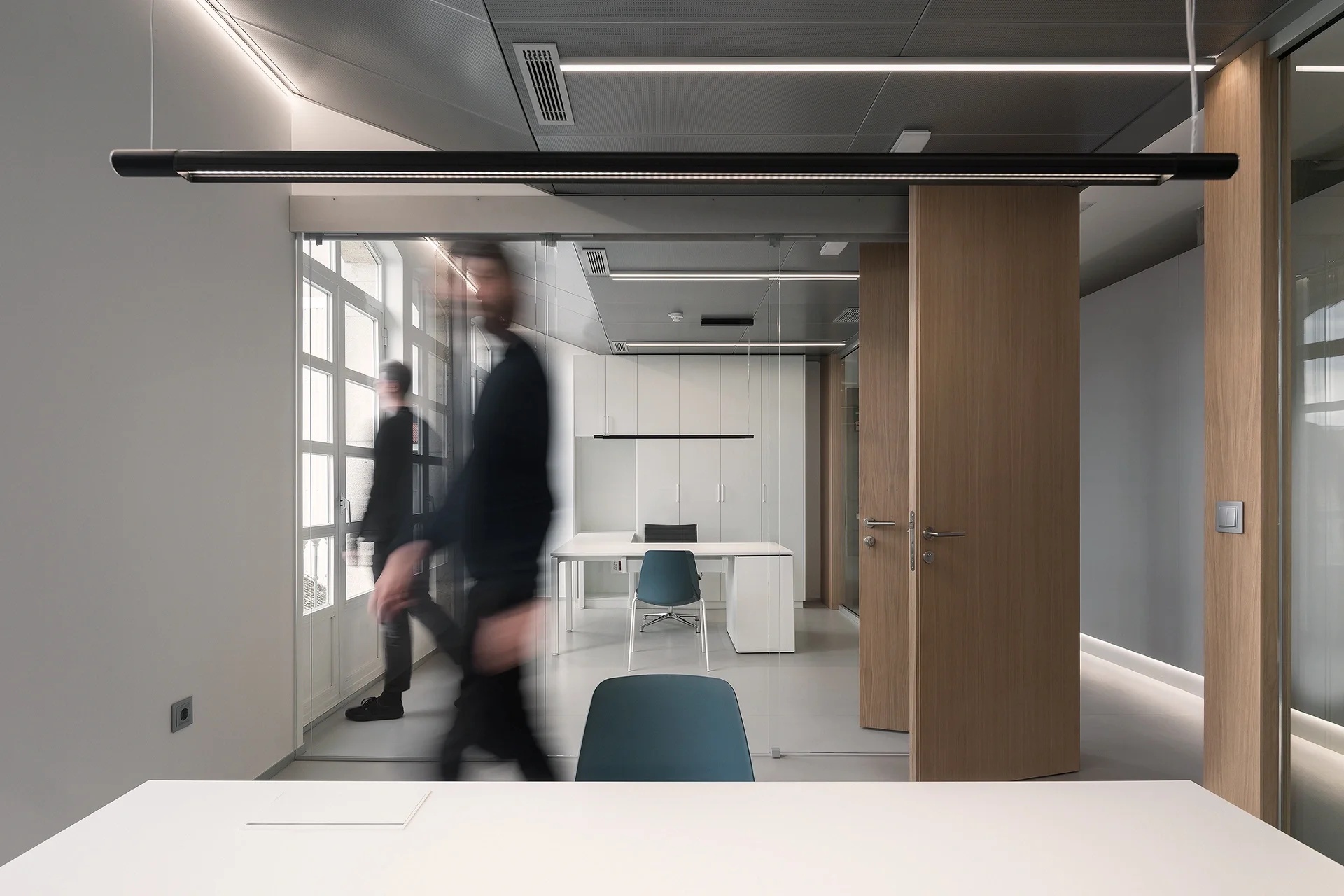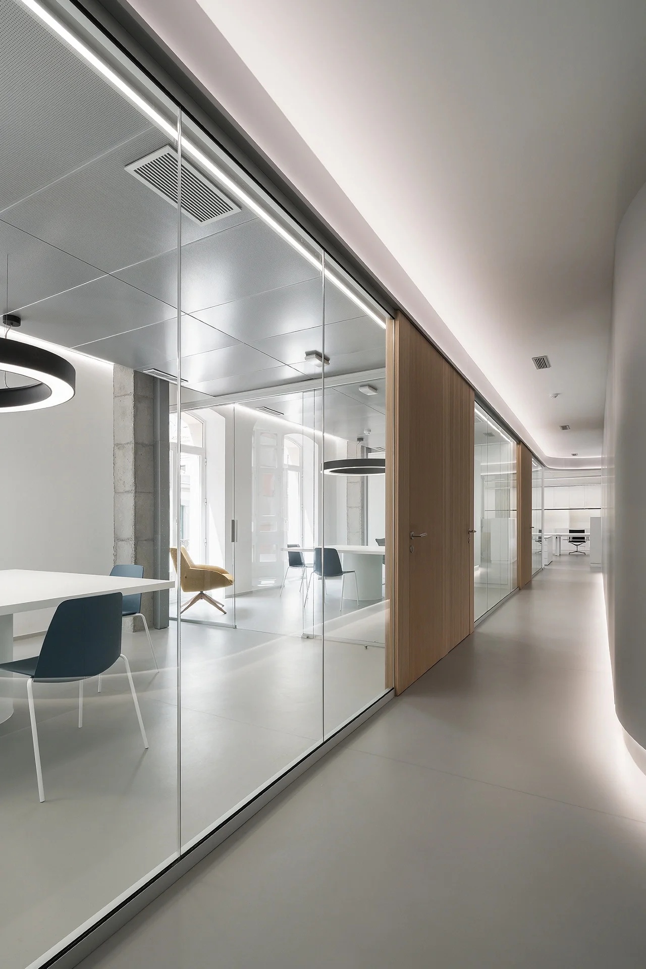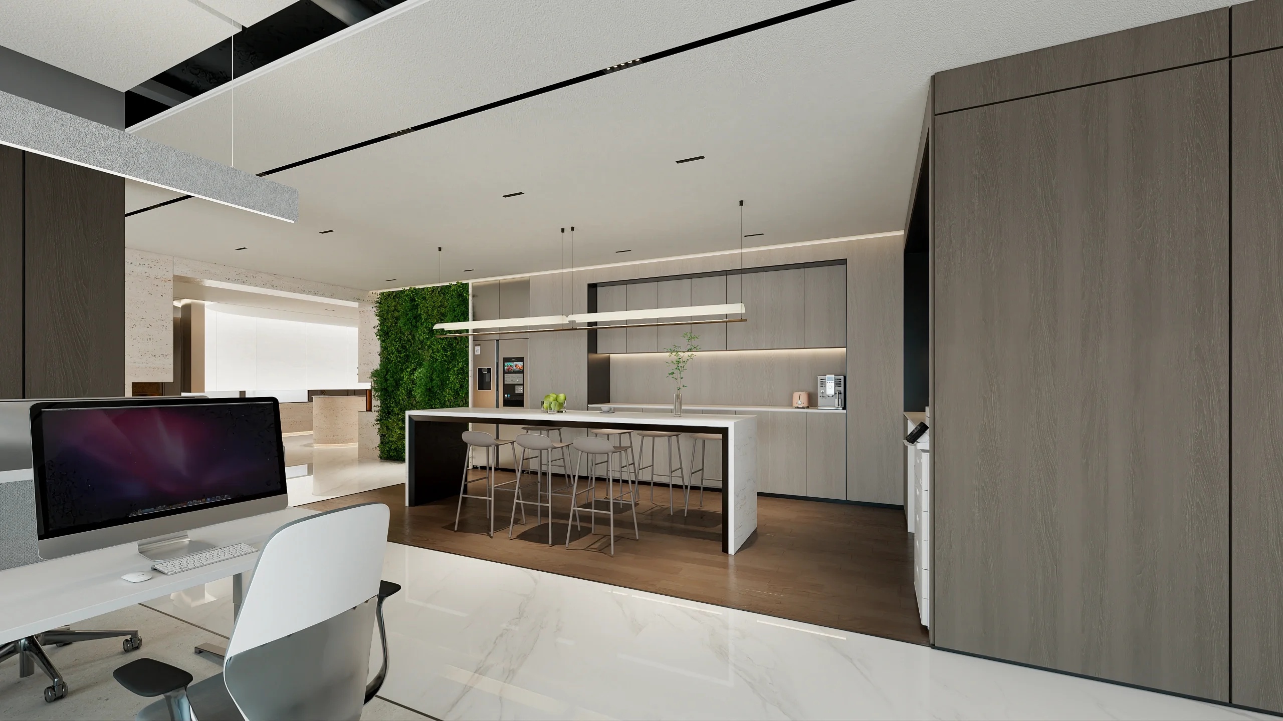 白色的张力,光影重叠,明暗交织;静谧的手法,颠覆重组,进退得宜。为了加强空间的通透性与纵深感,在隔墙的腰部玻璃进行空间隔断,从而实现空间区域的划分与交错。使得各区域既相互渗透又保证了必要的私密性,同时也极大地丰富了空间体验。