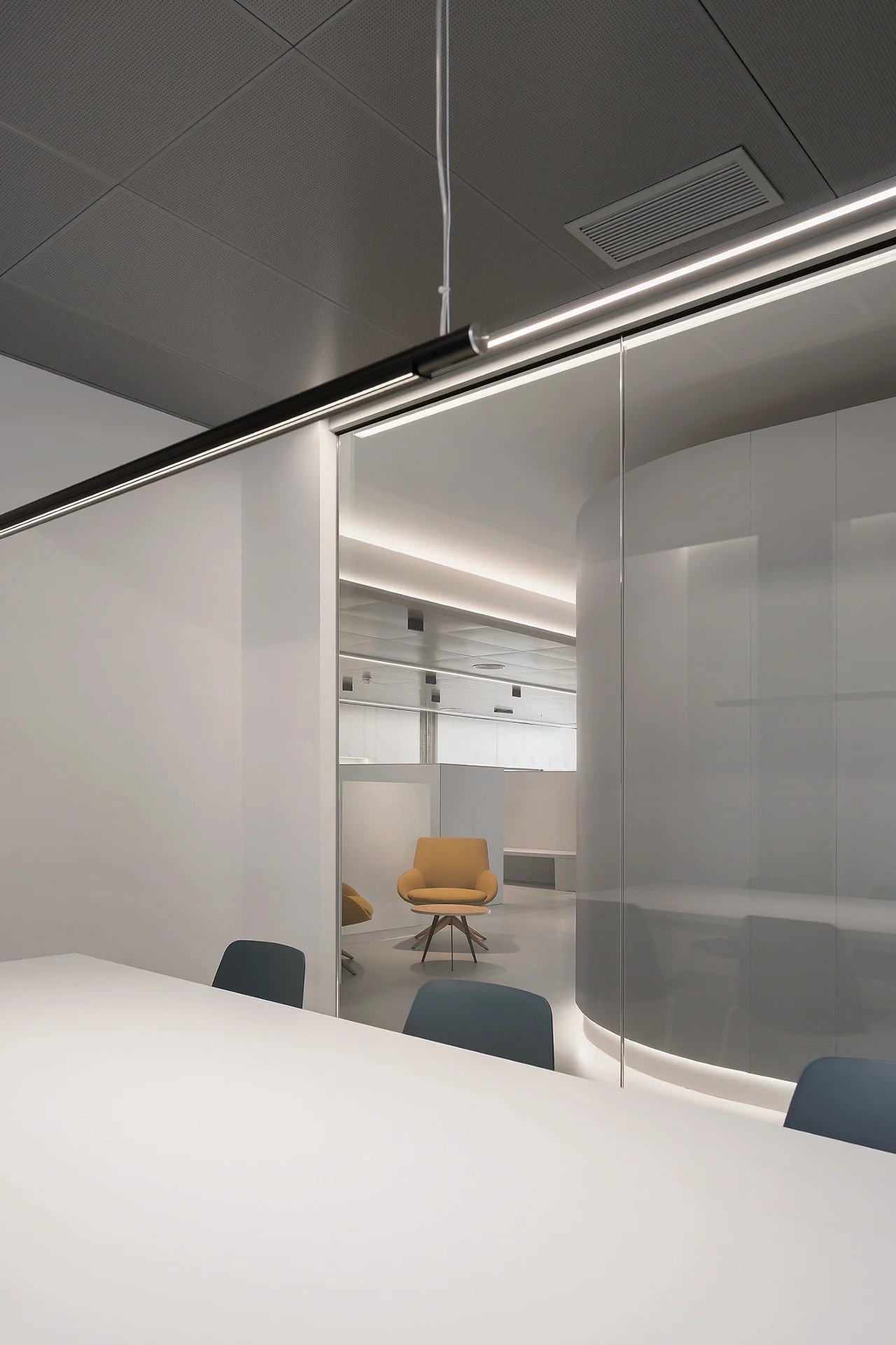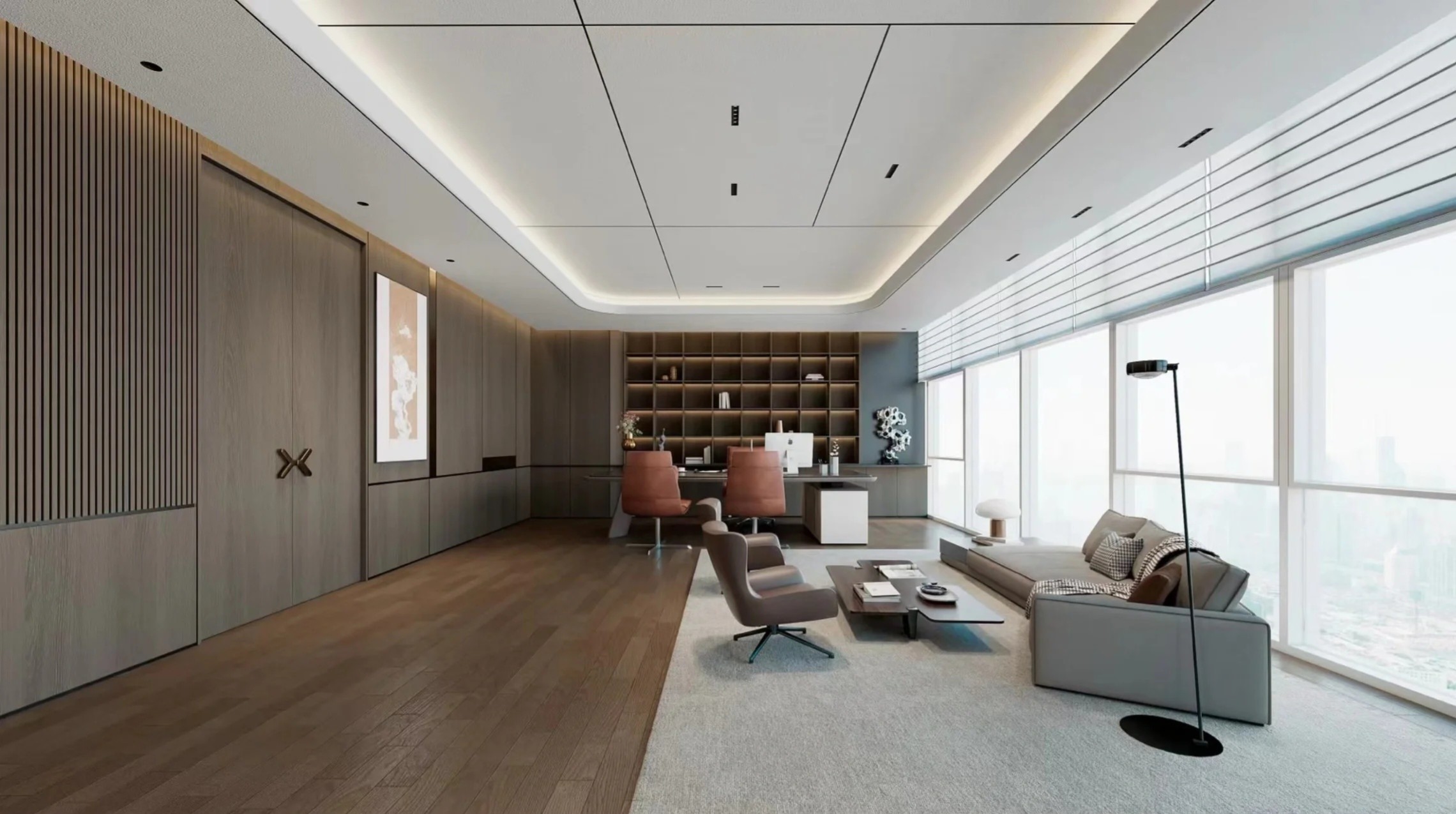 小面积的使用明艳的橙色与大面积的使用饱和度不同灰色,如同阴阳结合,可以完美的实现明与暗,冷与暖的平衡。色彩和材质的运用,体现出复古的格调、现代的时尚,打破会议室沉闷的氛围感,将空间点缀的更加灵动轻盈!