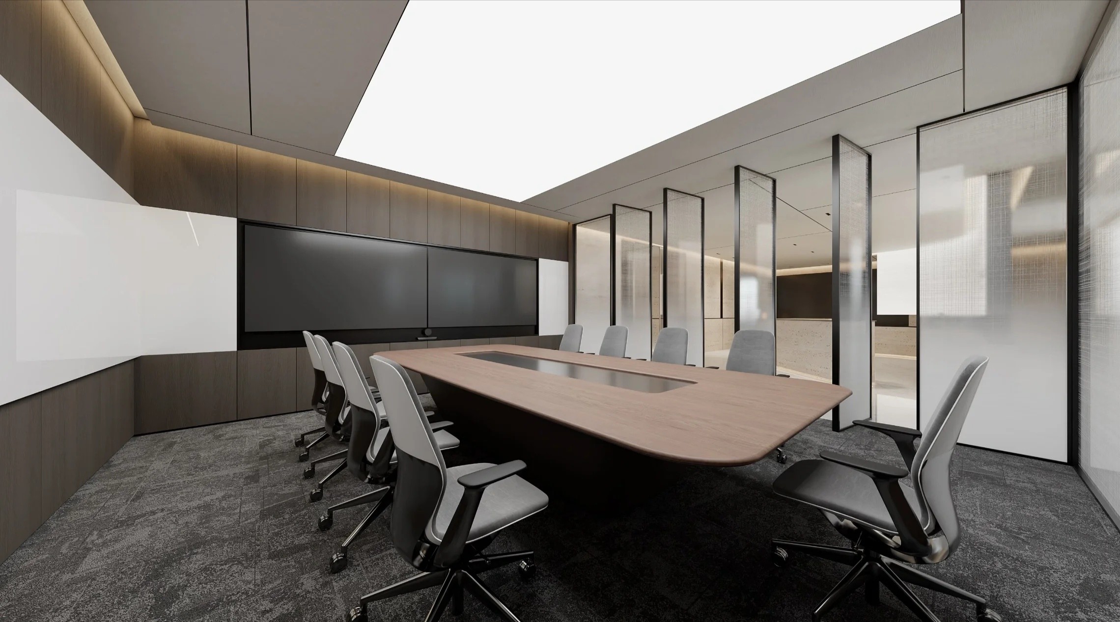 设计师运用集成墙板、毛毡以及木饰面等材质来达到满足会议室的隔音需求。这些材料是办公室会议室装修中的理想材料。同时,值得注意的是有很多常见的材料其实并不适合会议室使用,比如乳胶漆、瓷砖和石材。这些材质容易使声波和光波产生反射,从而影响会议室的整体视听效果。
