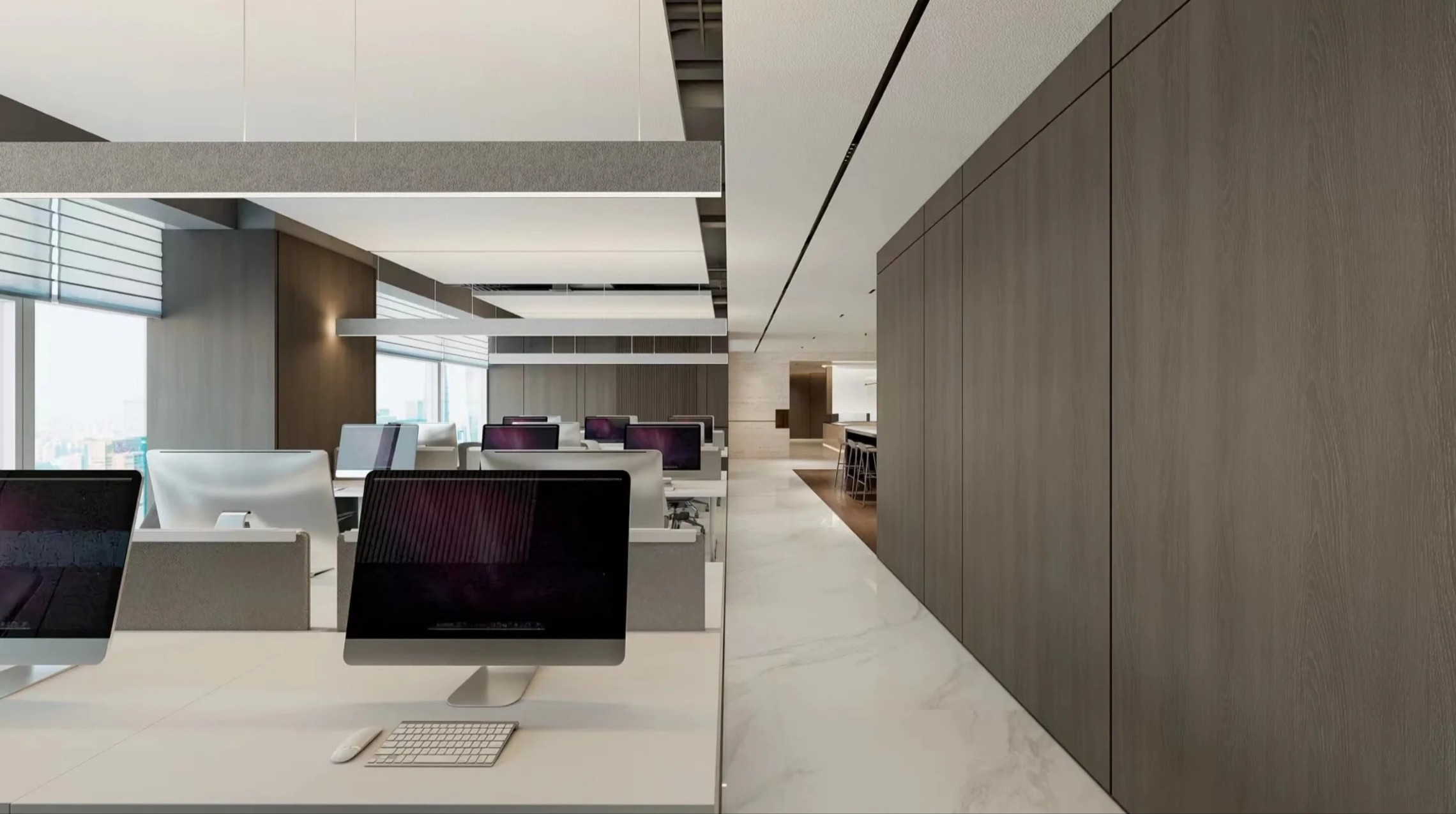 办公开放区在设计上用干练的线条,宁静的色调和光源,不拘于某一种材质或元素的限定,而是力求控制好每一件作品的分量感、尺度感、材料感及氛围感。在满足功能需求的前提下利用材料特性的变化、拓展了空间的纵深面积。设计师在顶部空间的设计中,罕见地采用了半开放裸顶+半封闭吊顶结合的设计。将项目的行业属性以含蓄的设计语言来展示。与网络直播这种看似进入到直播者的私人空间,但也是修饰后的理想表演空间的特性呼应。更让空间更好地表达出,开放与交流的氛围。