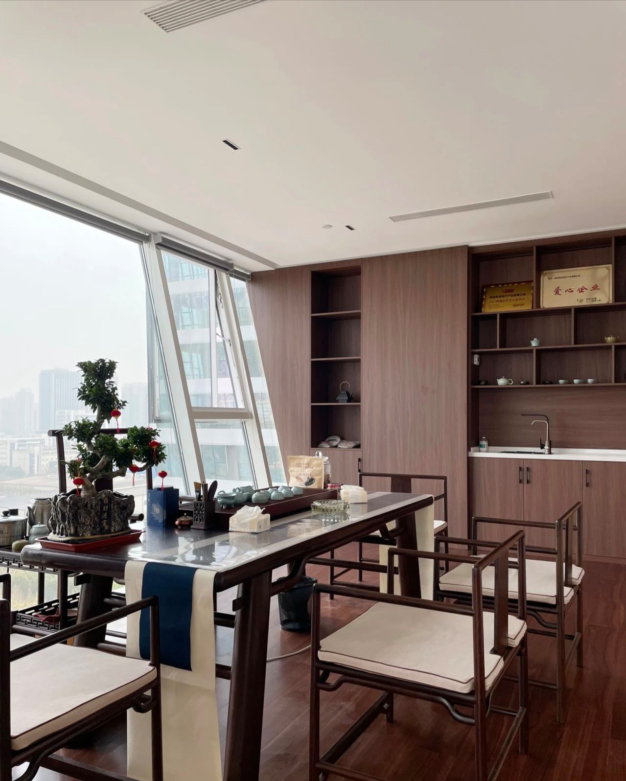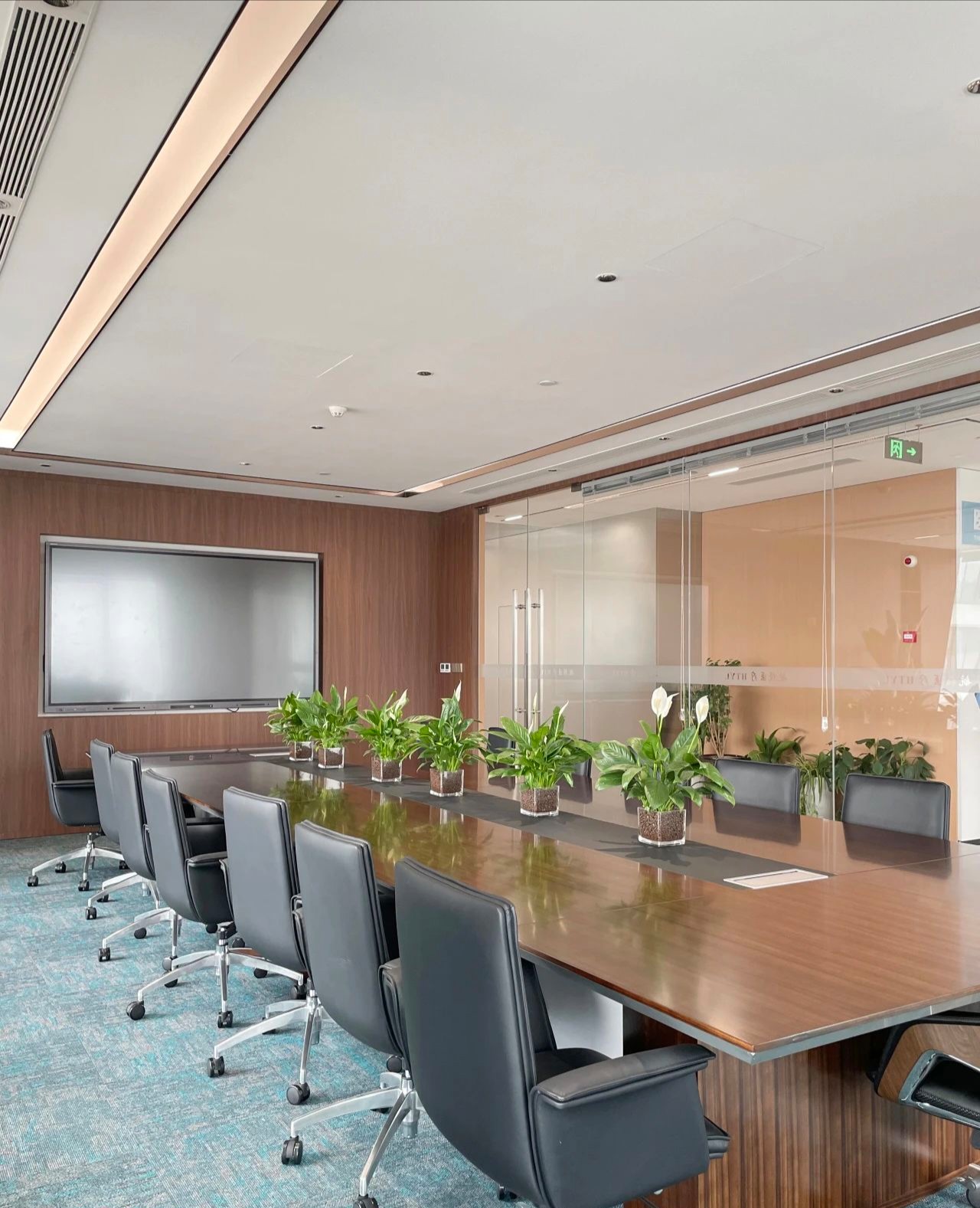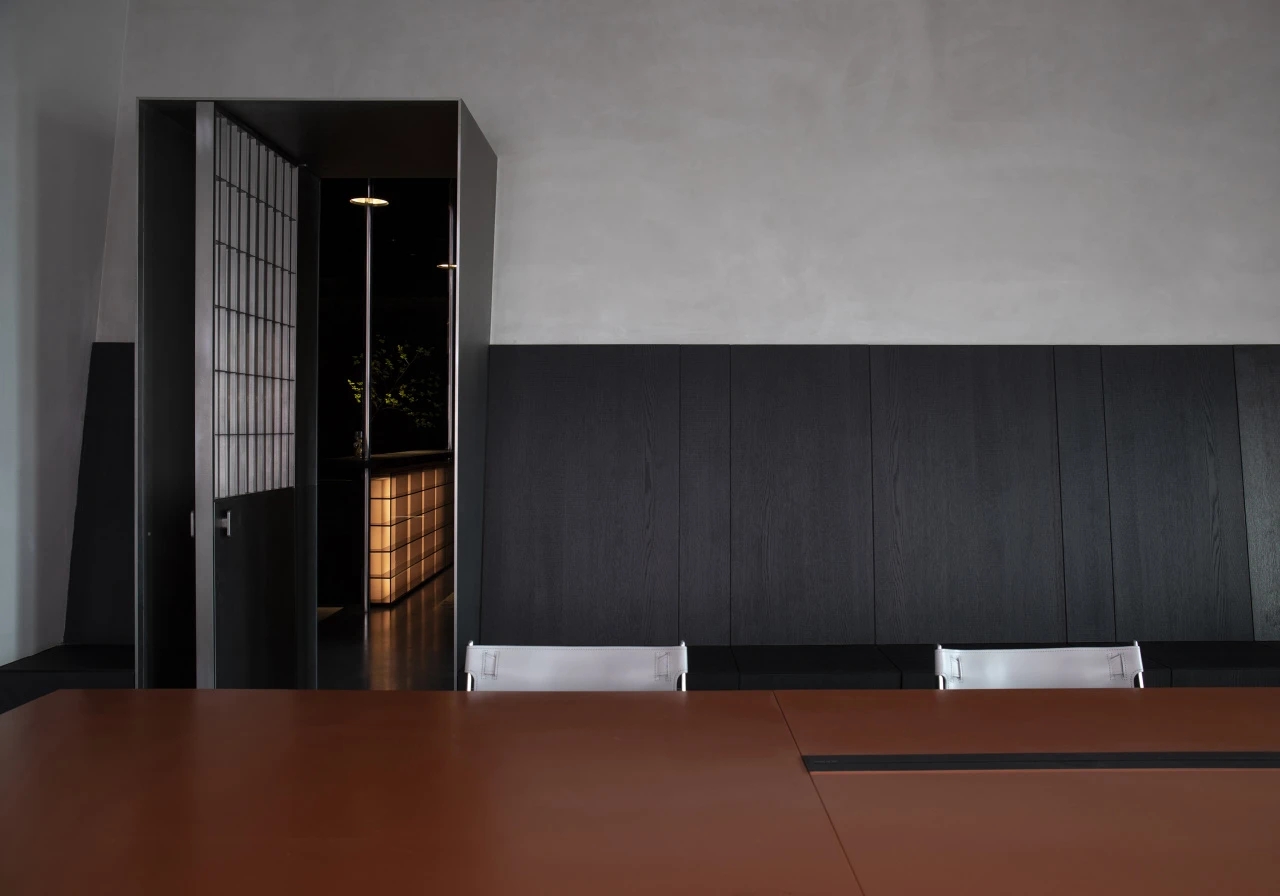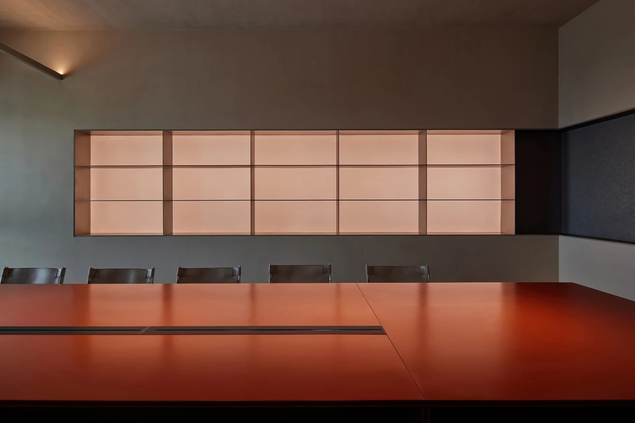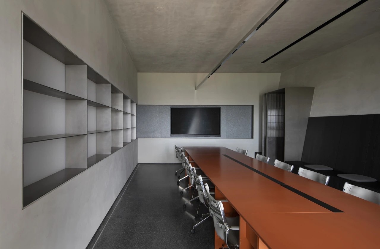 没有过多装饰的会议室,棕色的会议桌,平静的木地板,以确保与会者能够专注于会议内容,于是形成了一个现代与简约风的空间