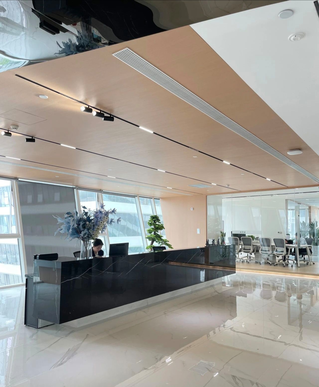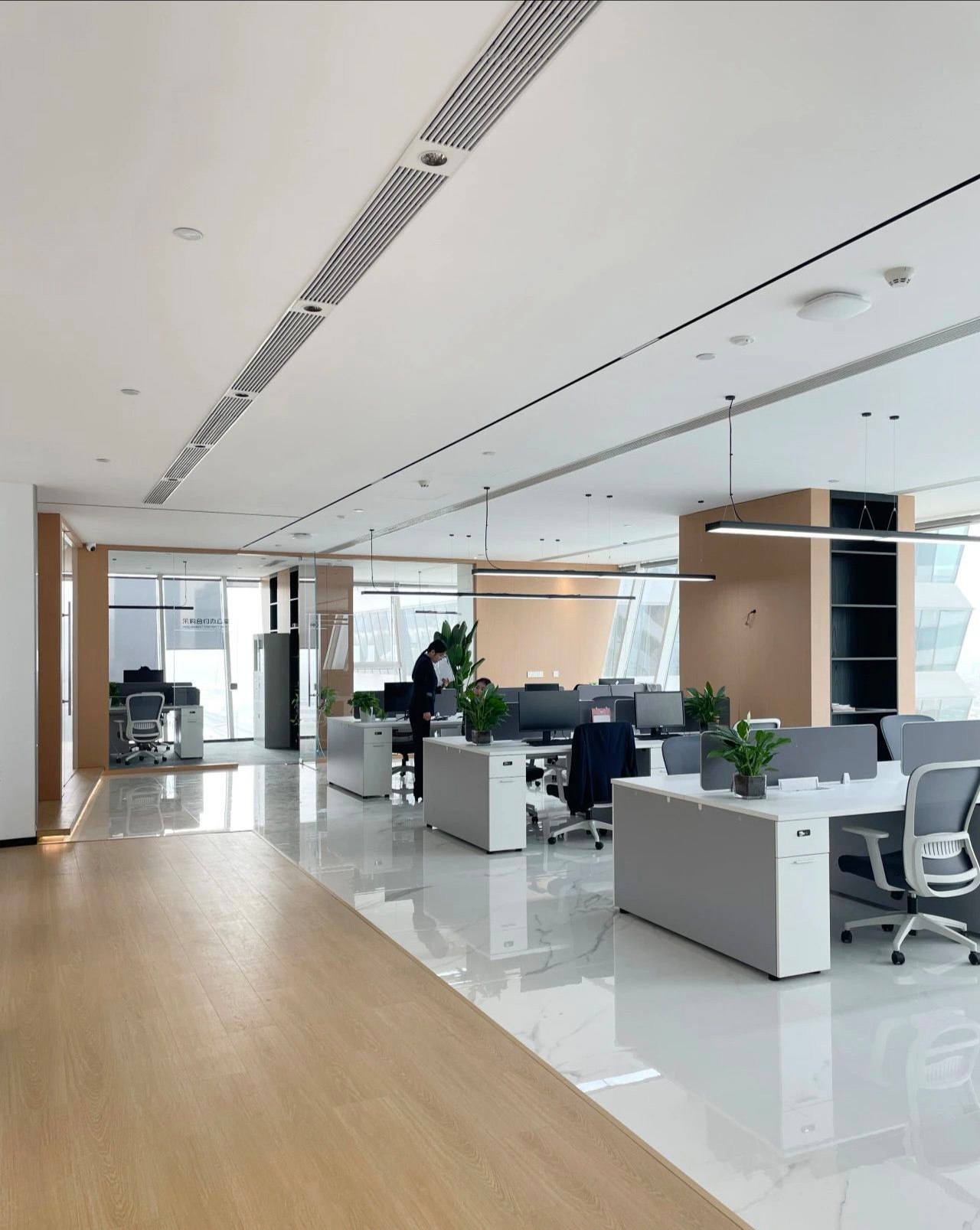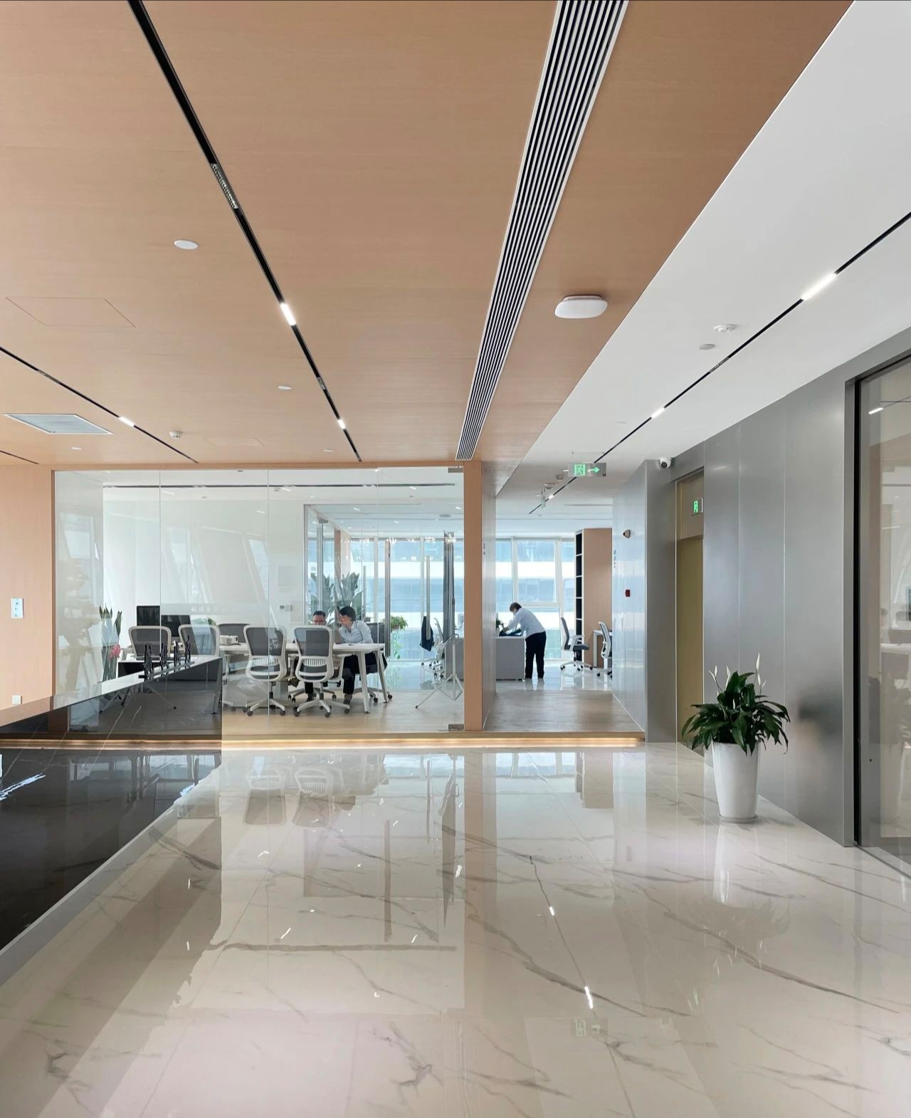 若隐若现的自然光线和室内灯光透射而出,简约有序的光,恰如其分的给予了空间留白美。在空间中融入现代办公生活的美学感受,打破思维的禁锢,赋予工作环境全新的价值与意义。