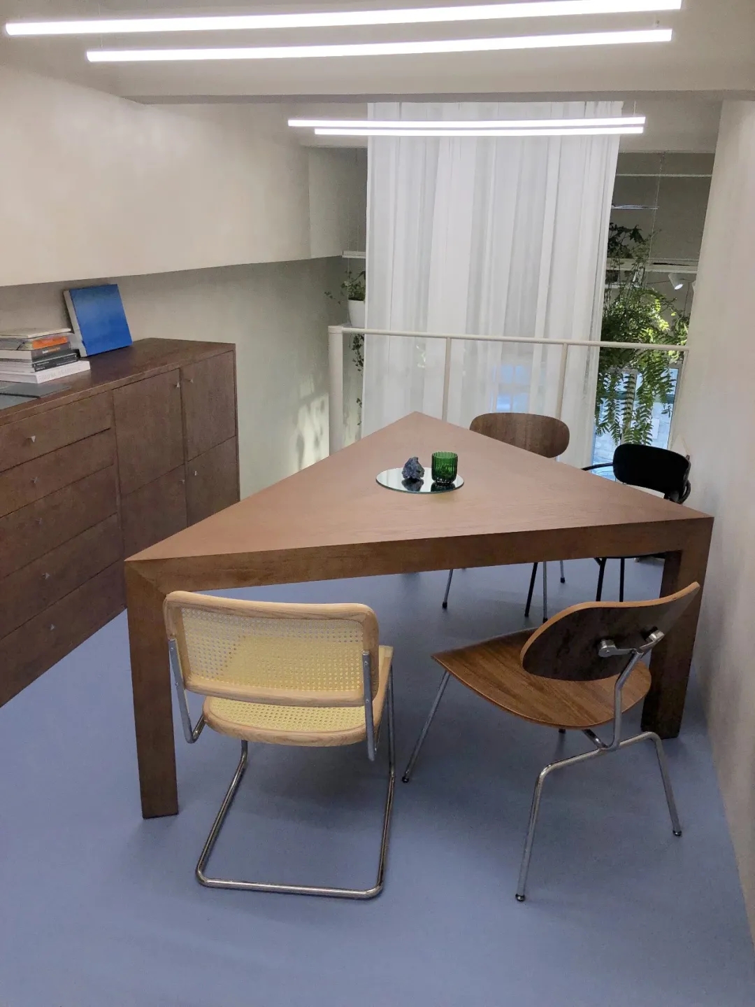 三角形:极具创造性, 不断进取的力量会议室,创作区和储藏空间都被设置在了二楼的夹层区域。蓝色Vinyl地板和展示材料样版的实木矮橱,从颜色和材质上加深了空间的多元层次。与此同时,放弃了大众心中会议桌的刻板印象,而选择了三角形会议桌放置于中心区域。相较于常规会议桌带来的规矩感与严肃感,三角的形态可以促进我们跳跃性思维的迸发,创造更轻松有趣的讨论环境,也象征了一种不断进取的力量。