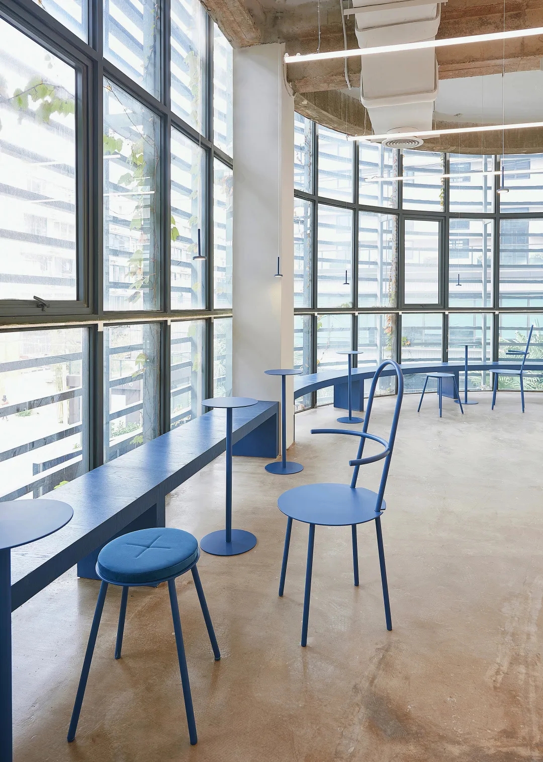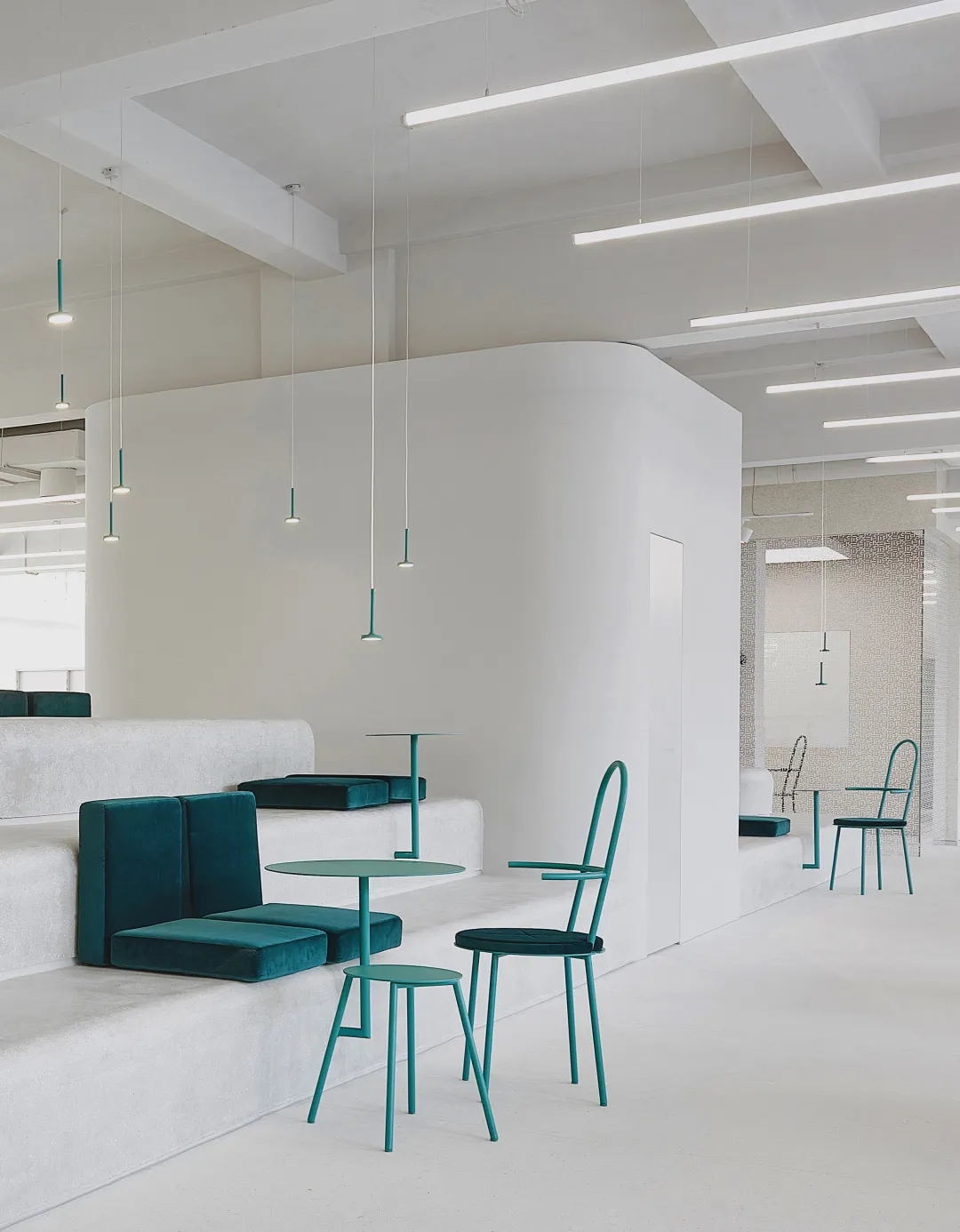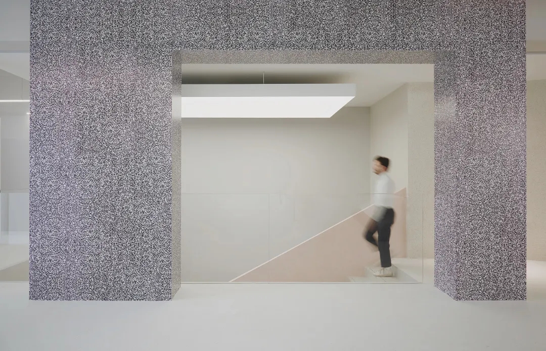 室内普遍采用了较为中性的色调,使得接待处蓝色的水磨石和粉色马来漆装饰的楼梯结构格外醒目。除此之外,互动区域的座椅,坐垫,灯具等都搭配了强烈的色调来平衡整体的设计。