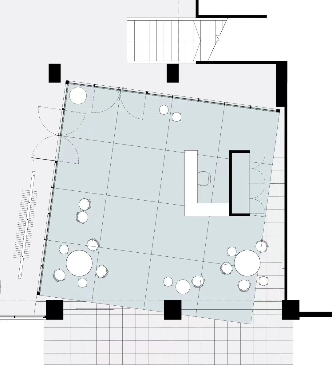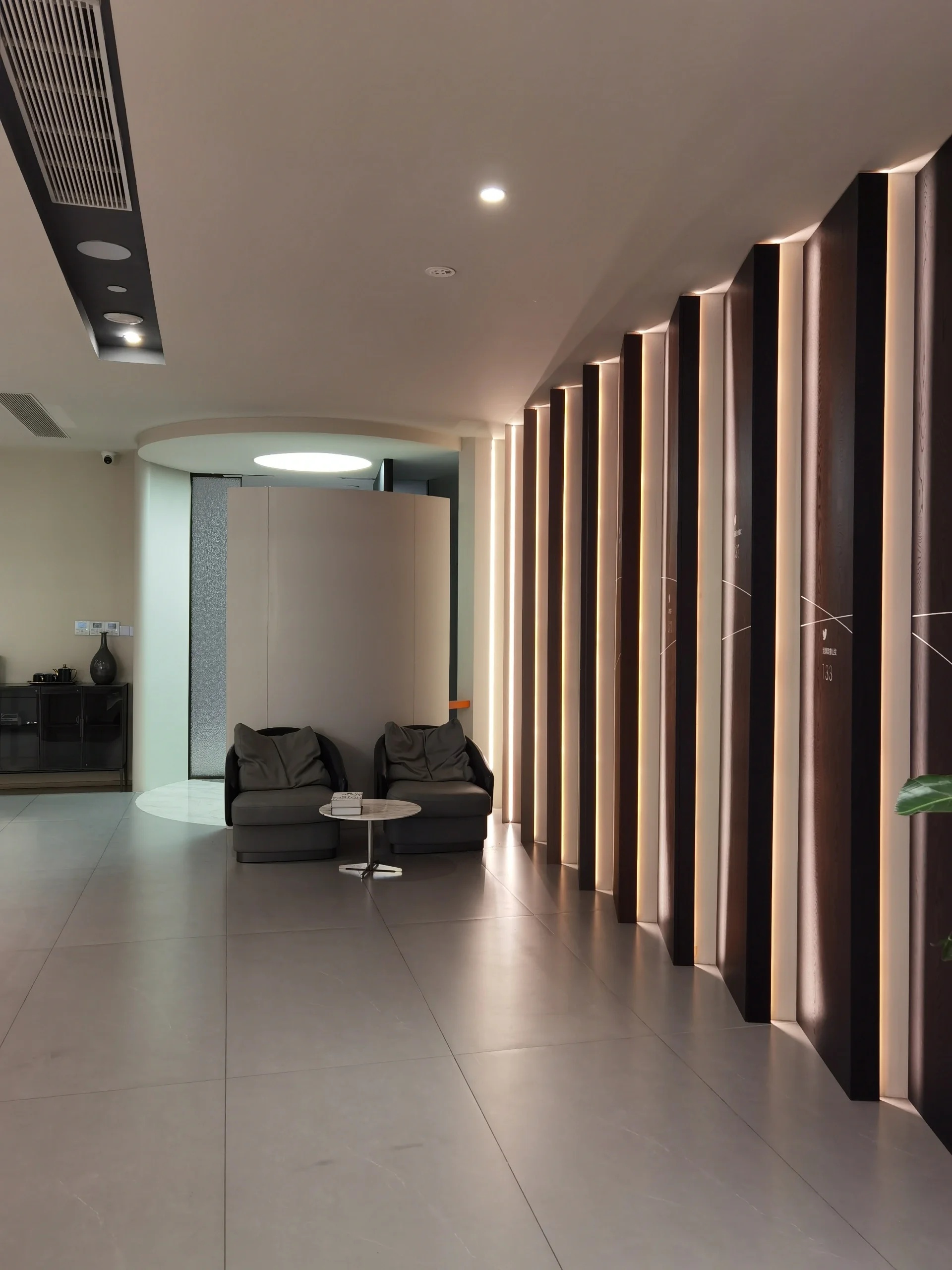 两层楼高的入口玄关区域是我们的生活区和迎宾区。以圆形不锈钢咖啡桌为中心,无形连接起了一个可以接待宾客、展开商务洽谈、举行小型活动或与团队、朋友和客户聚会的多功能空间。