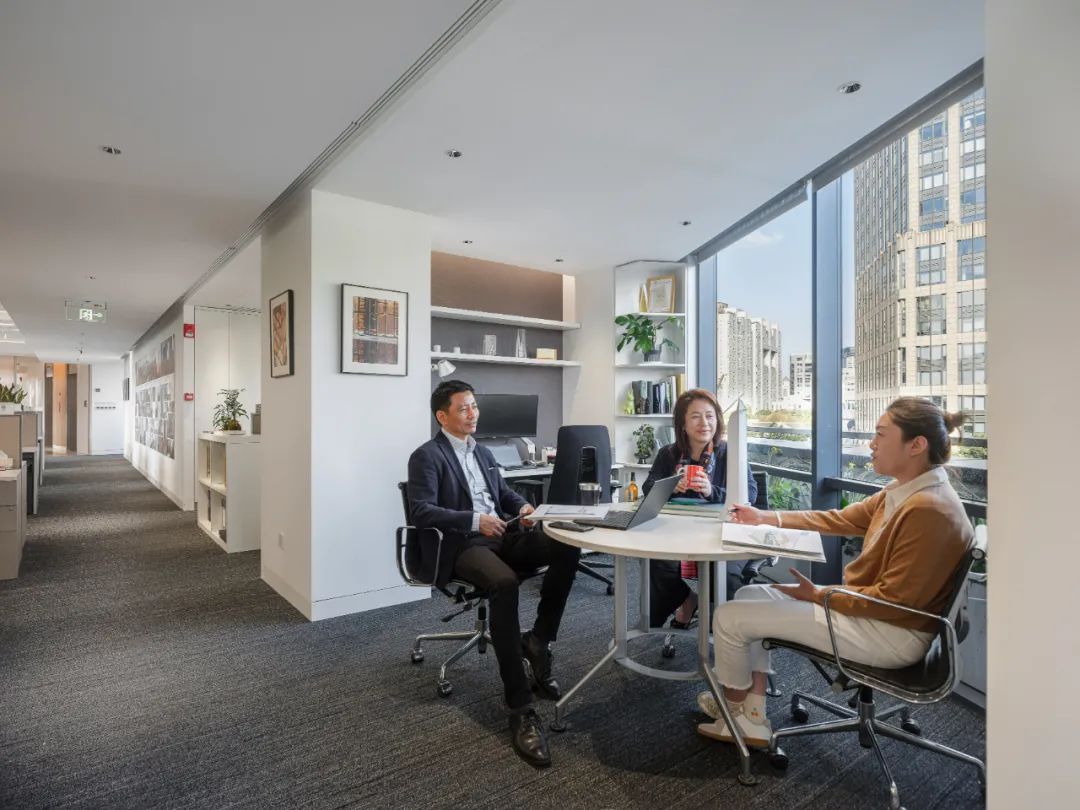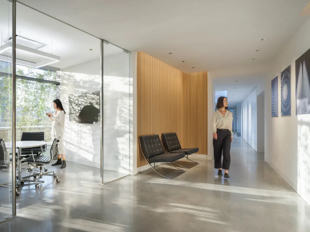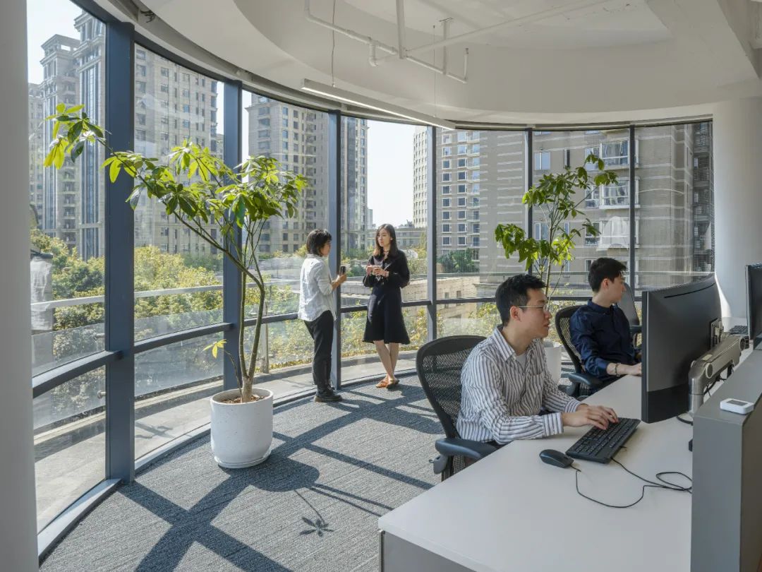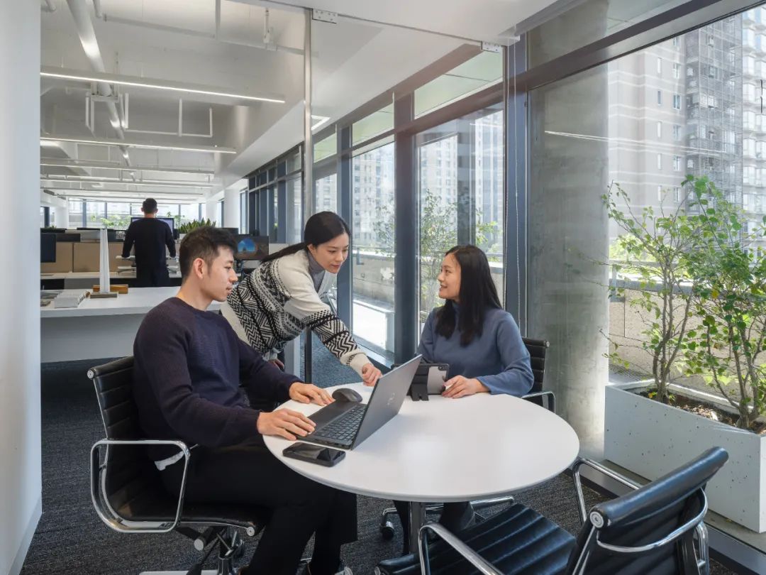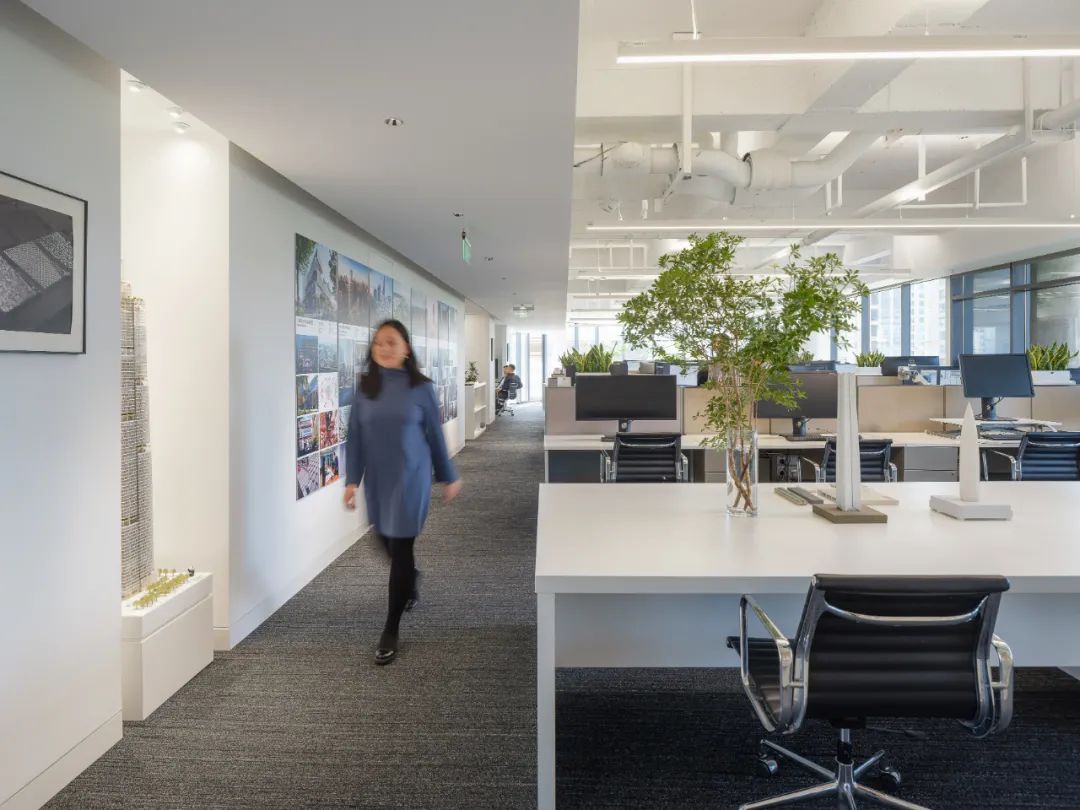 每个工作站之间的隔板比常规规格较低,取而代之的是更多的绿植被引入,这种低隔板让人与人之间的沟通更加方便。为了提高同事们的幸福感,共享区域和所有工作站座位都可以直接看到室内室外的植物和景观。所有工作站都处在在玻璃围护结构5m范围内,视觉透光率大于或等于40%,成功地实现了日光设计策略。