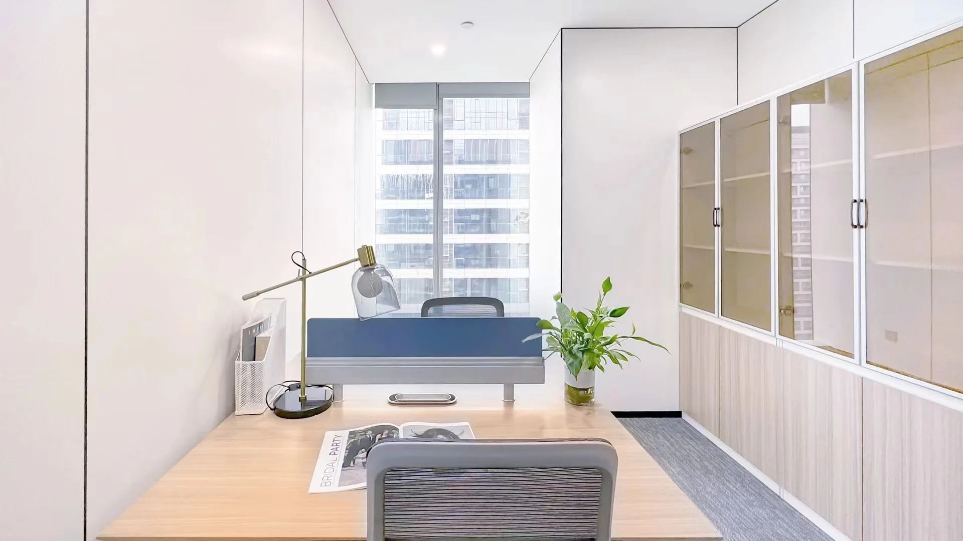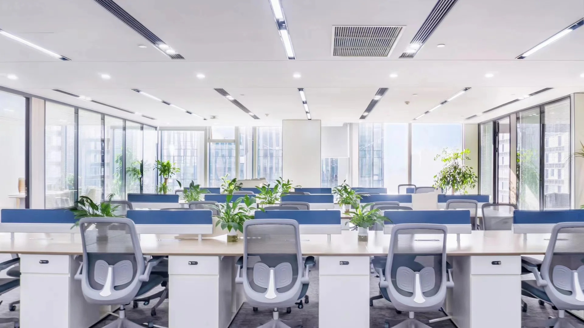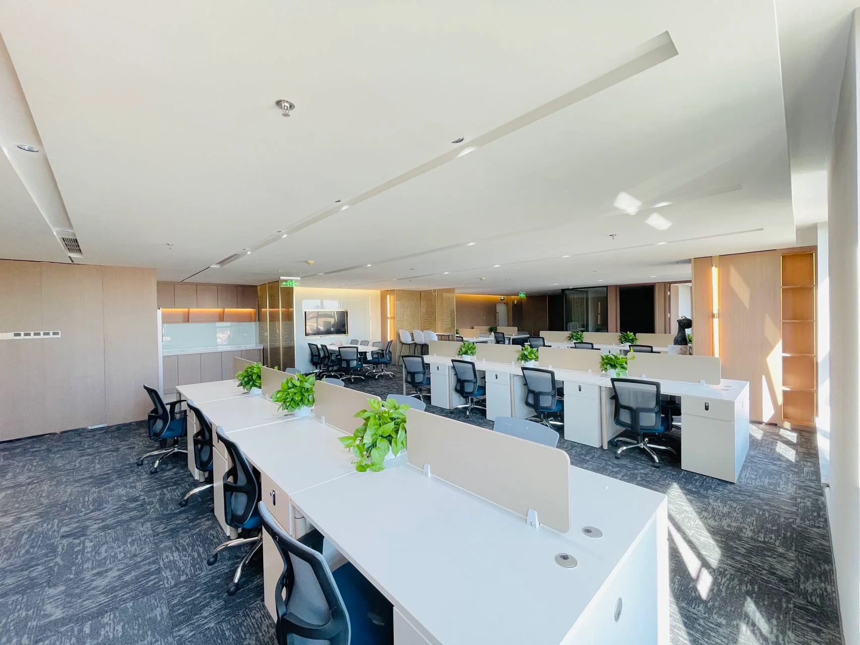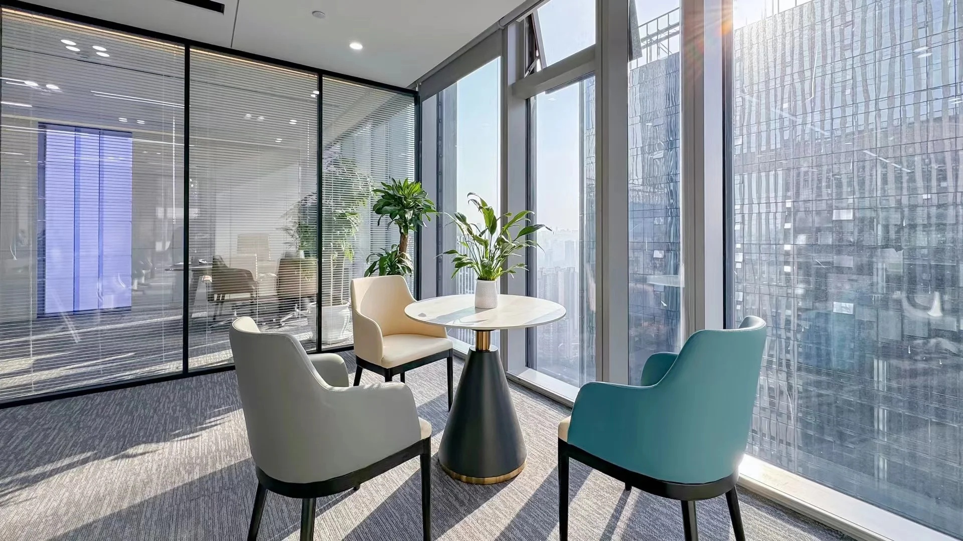每个工作站之间的隔板比常规规格较低,取而代之的是更多的绿植被引入,这种低隔板让人与人之间的沟通更加方便。为了提高同事们的幸福感,共享区域和所有工作站座位都可以直接看到室内室外的植物和景观。所有工作站都处在在玻璃围护结构5m范围内,视觉透光率大于或等于40%,成功地实现了日光设计策略。