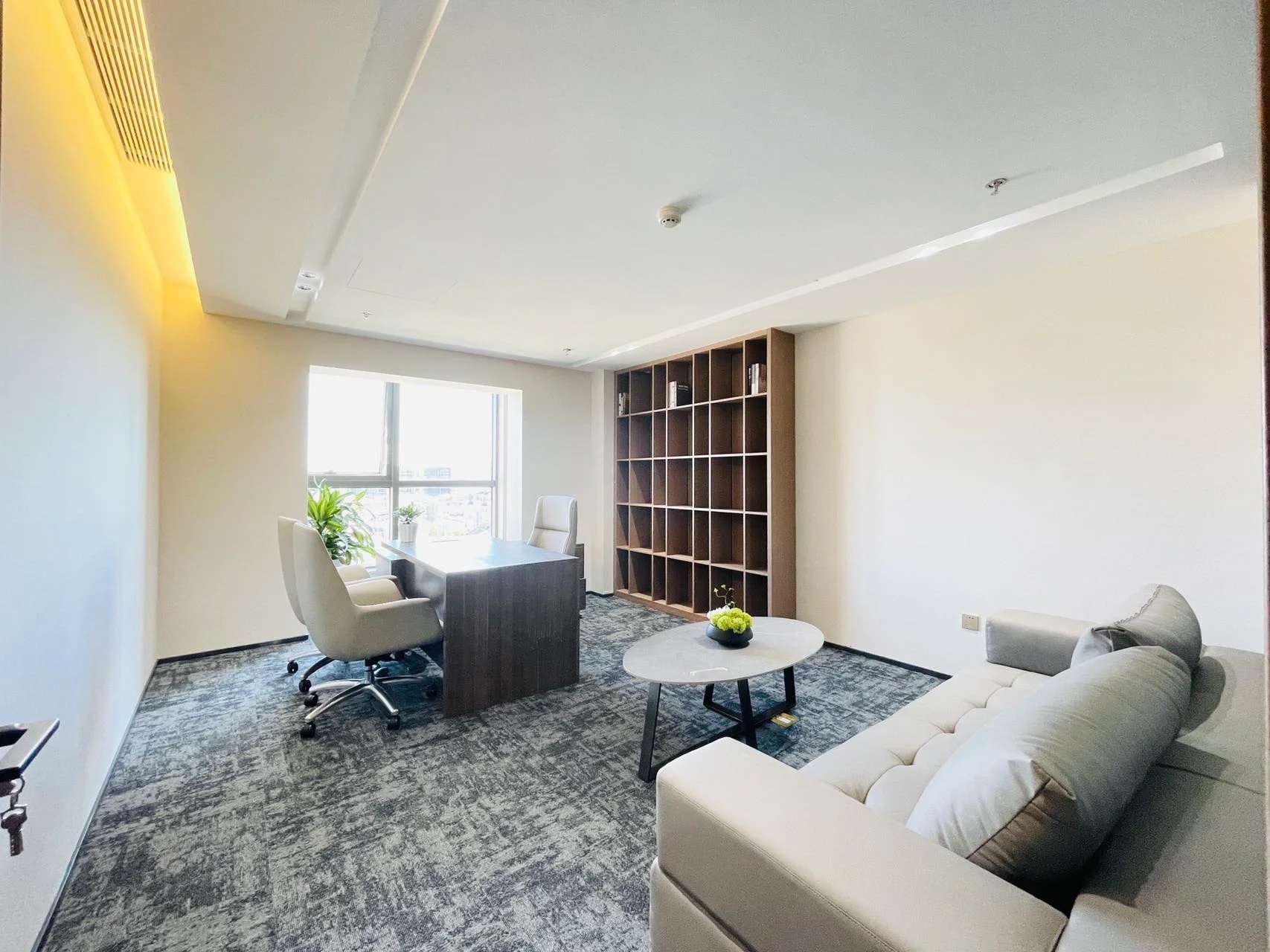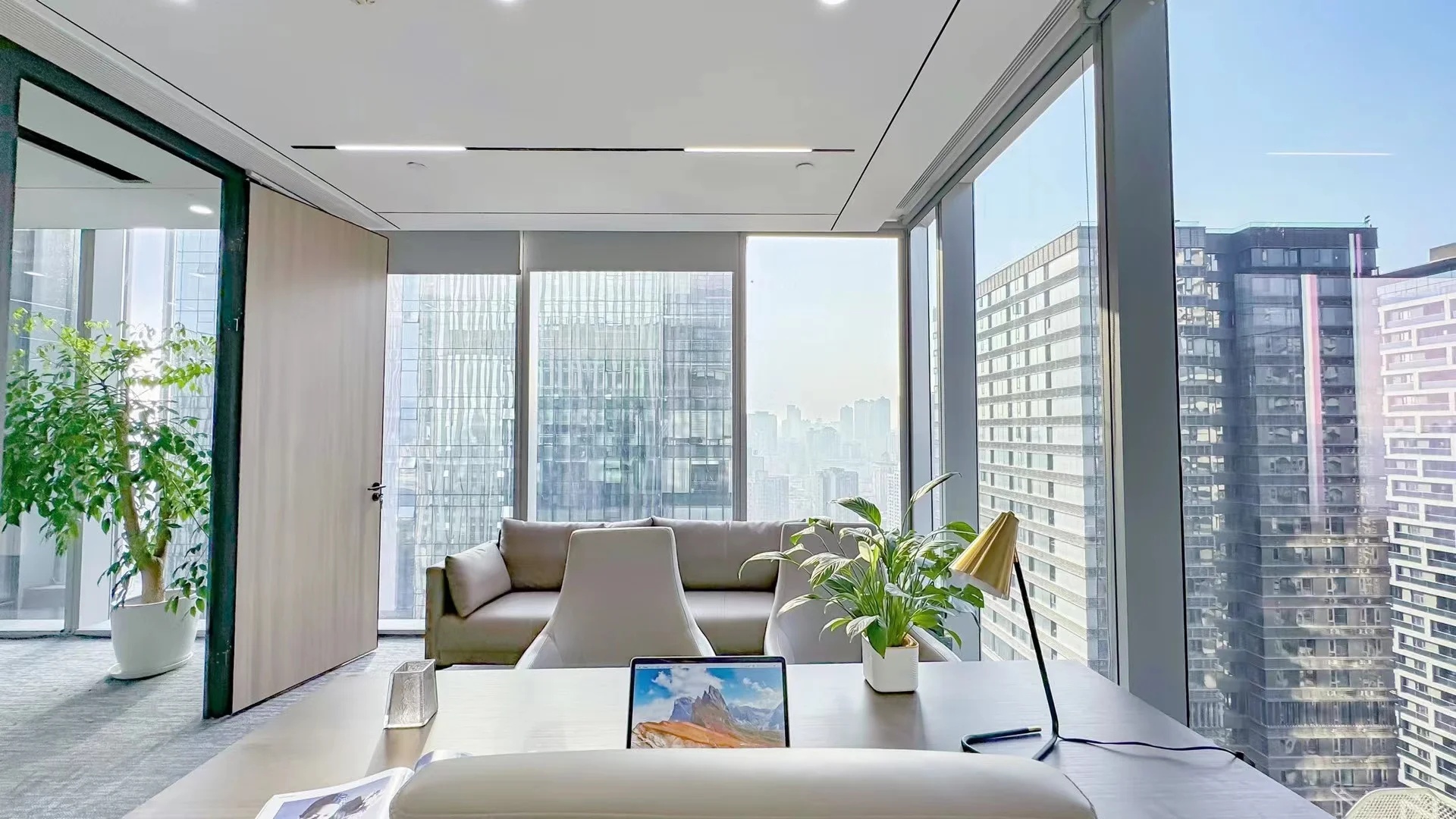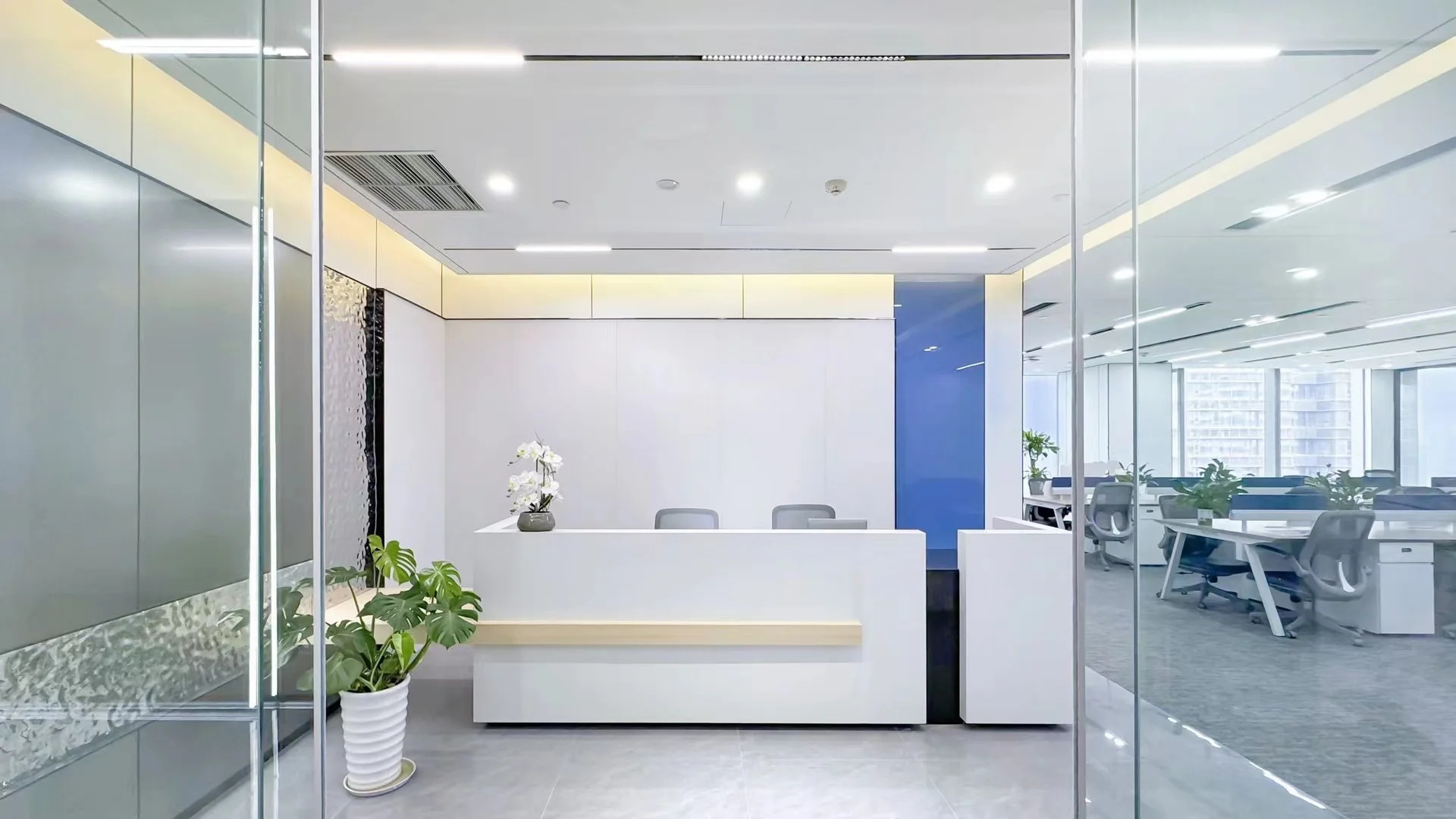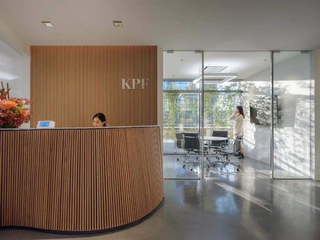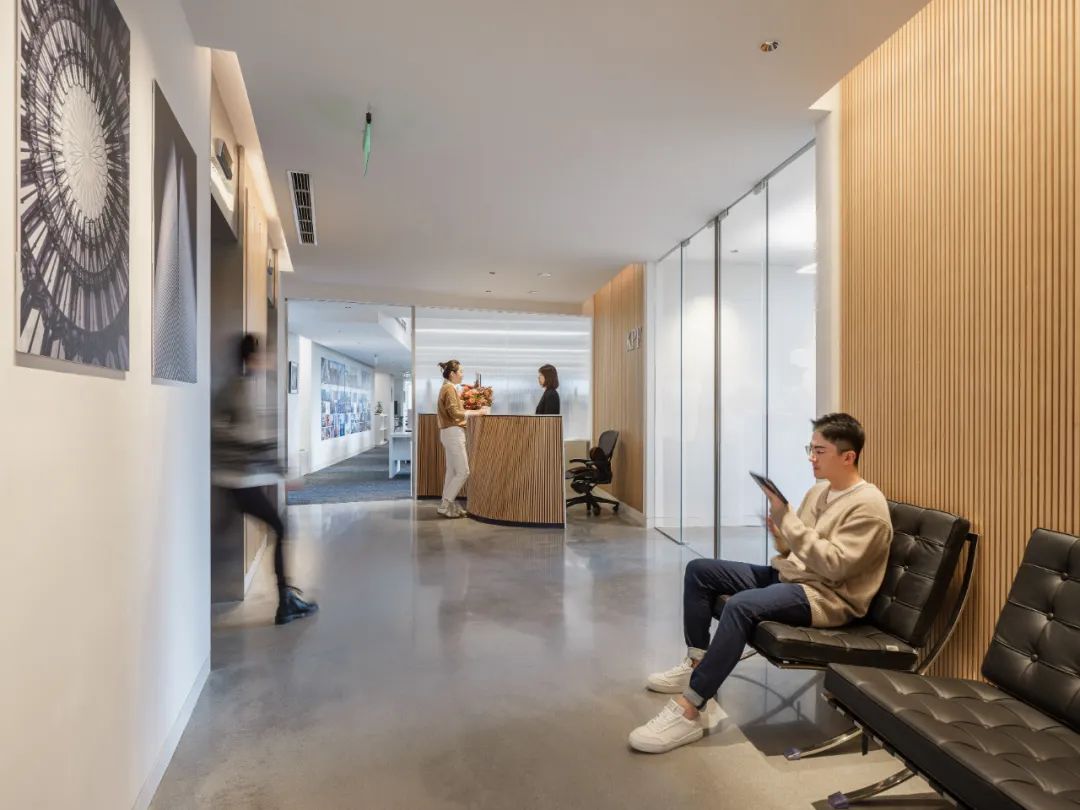 接待区连接办公区和会议区,我们引入了木材这种自然的设计元素作为墙面的装饰材料,营造出亲切舒适的观感。办公室全境禁烟,在多处设有空气质量检测仪,配备的新风系统具有电子除尘和纳米杀菌功能,确保室内空气质量。