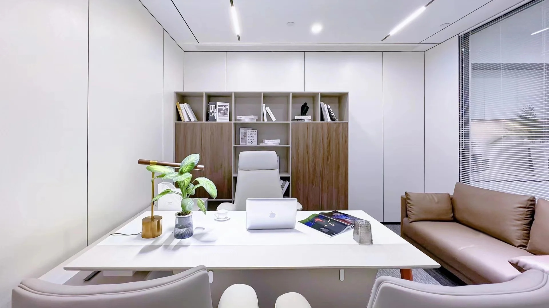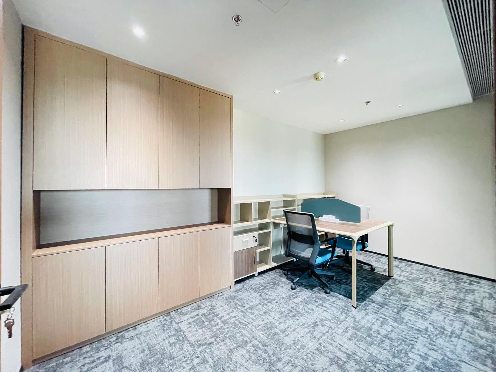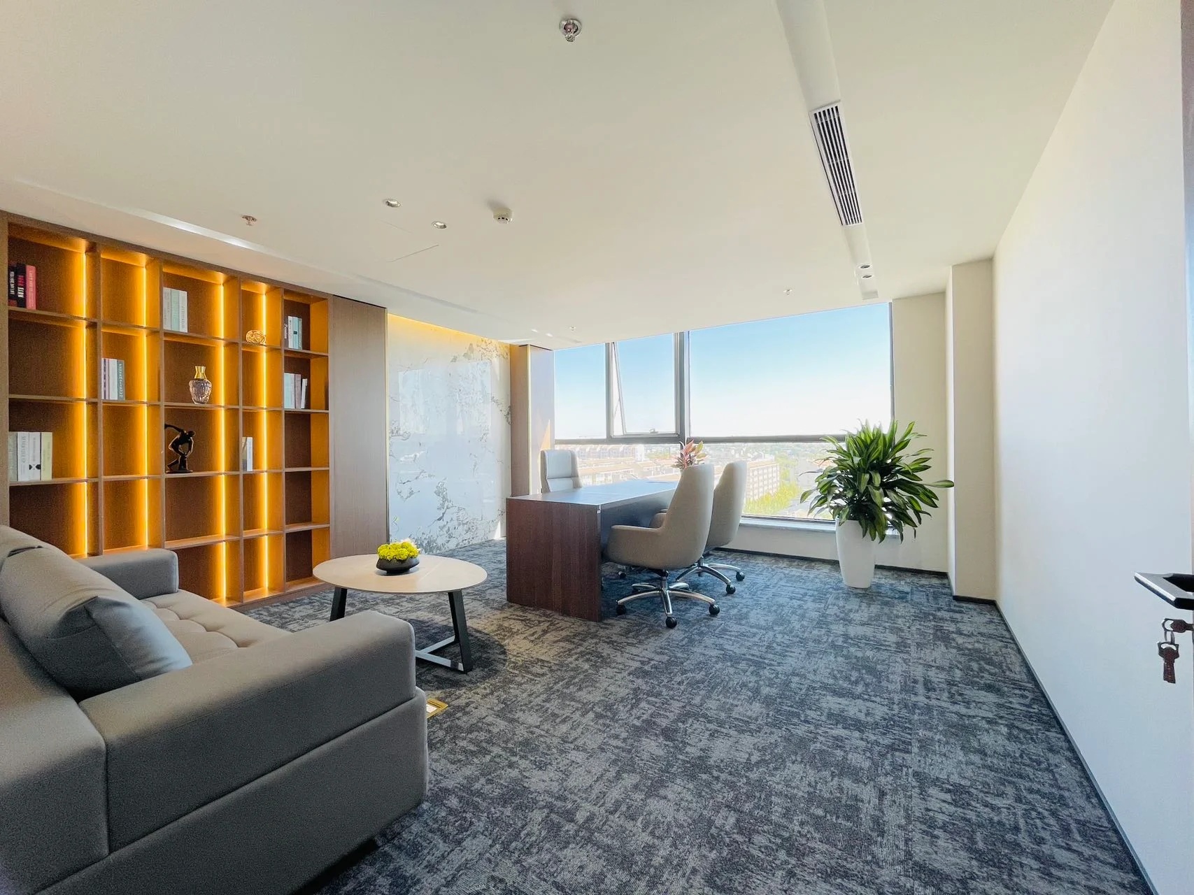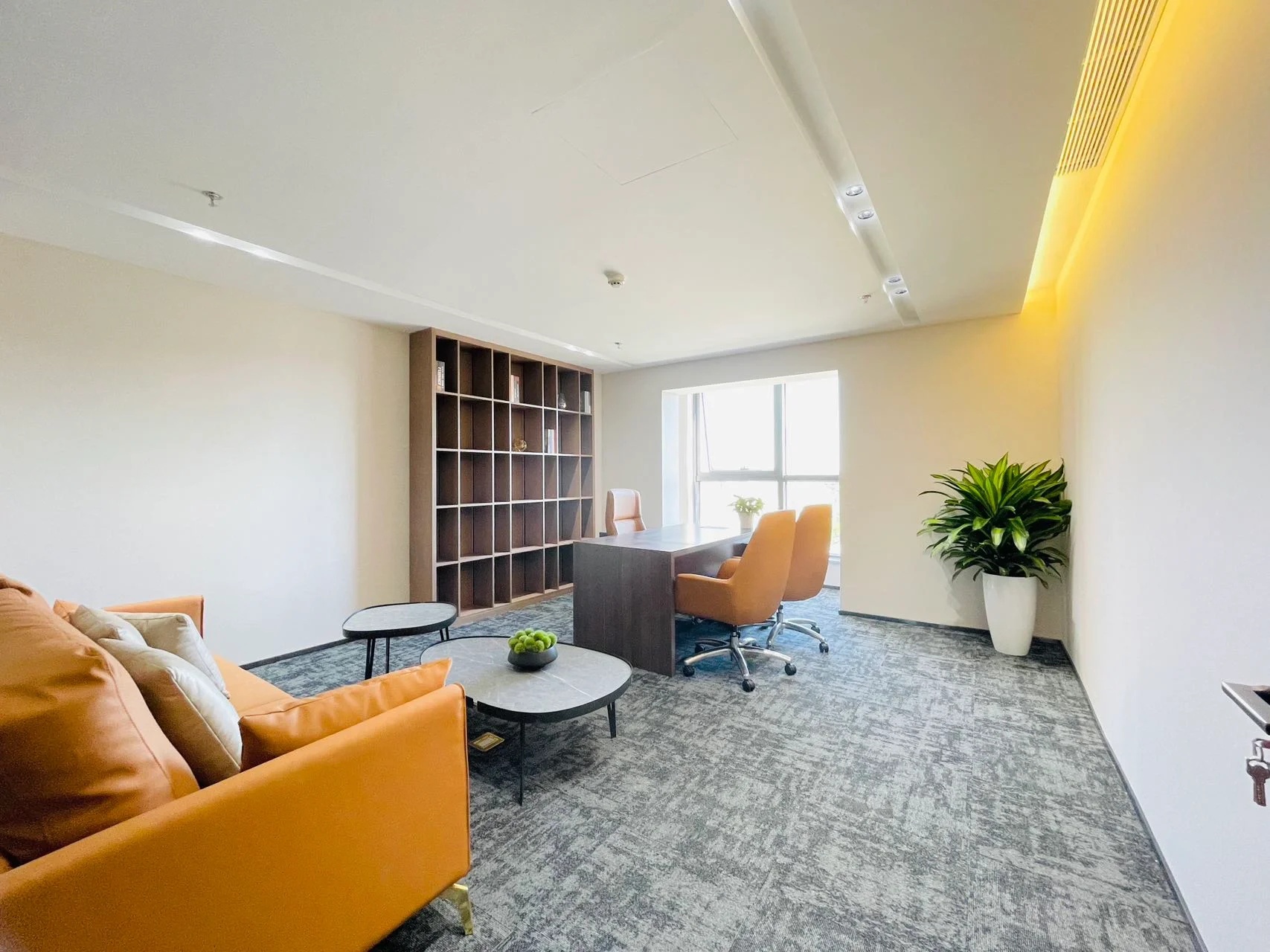 接待区连接办公区和会议区,我们引入了木材这种自然的设计元素作为墙面的装饰材料,营造出亲切舒适的观感。办公室全境禁烟,在多处设有空气质量检测仪,配备的新风系统具有电子除尘和纳米杀菌功能,确保室内空气质量。