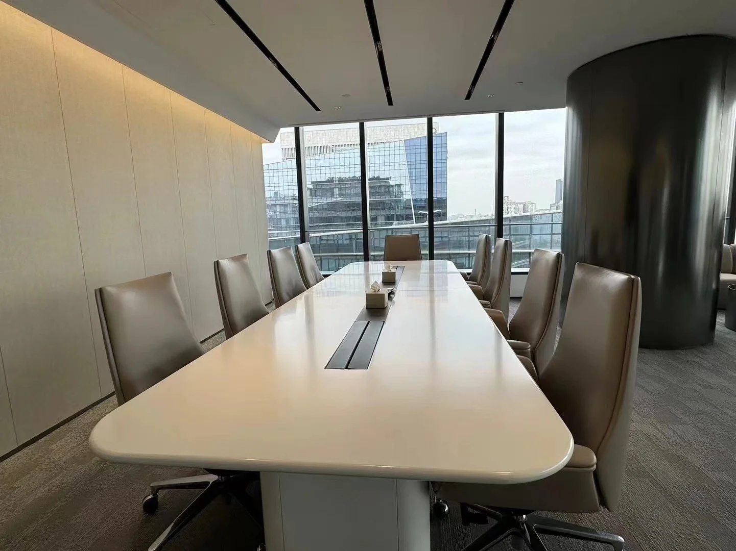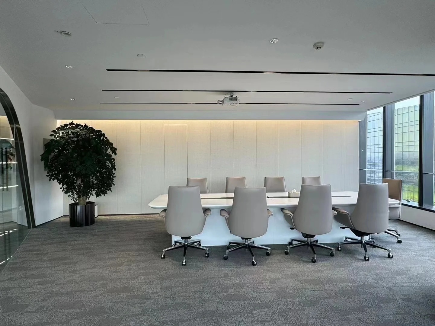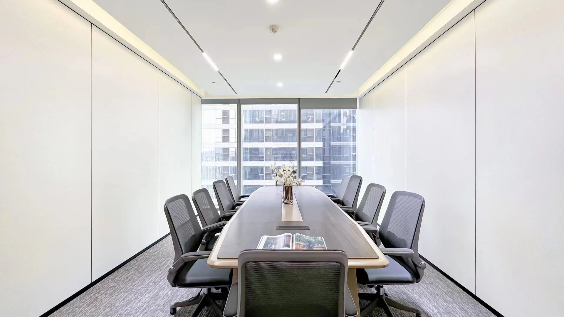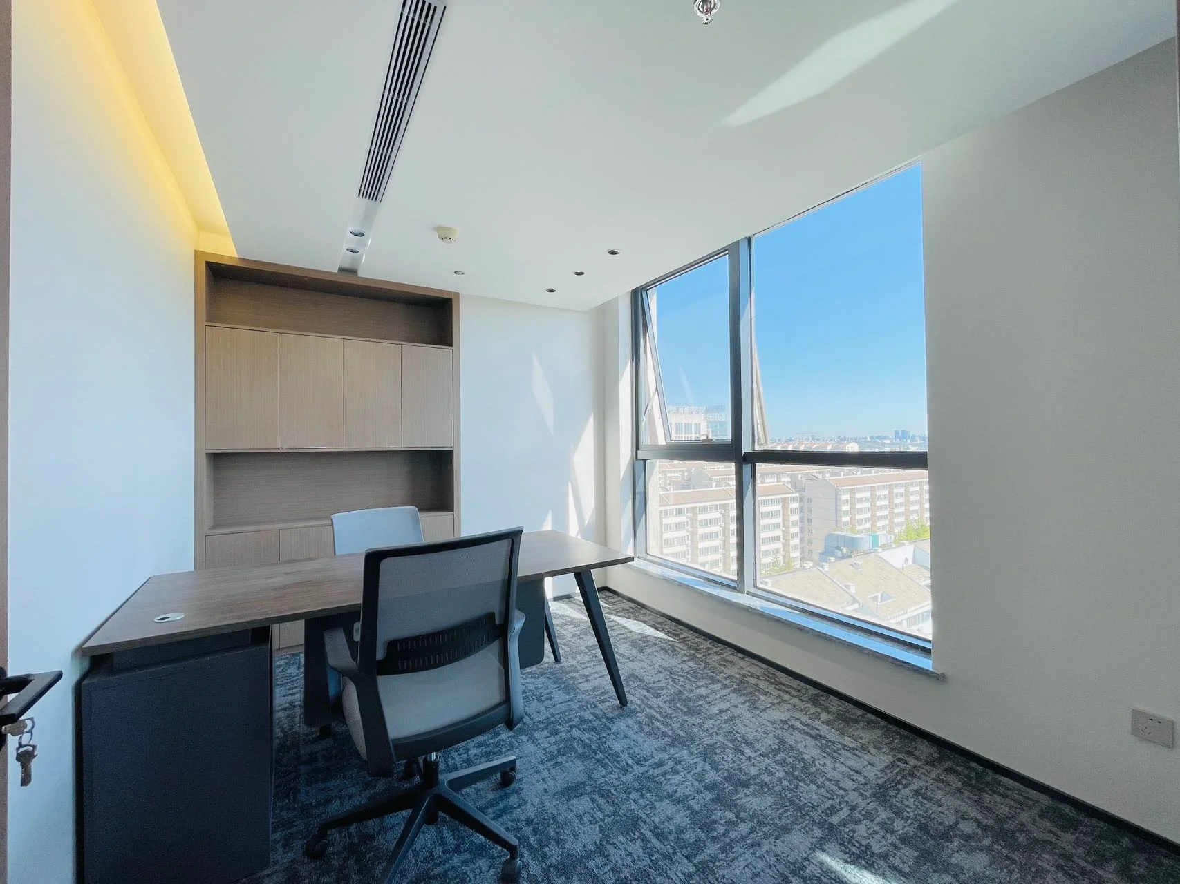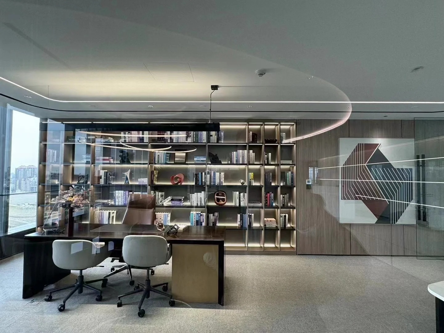 接待区连接办公区和会议区,我们引入了木材这种自然的设计元素作为墙面的装饰材料,营造出亲切舒适的观感。办公室全境禁烟,在多处设有空气质量检测仪,配备的新风系统具有电子除尘和纳米杀菌功能,确保室内空气质量。