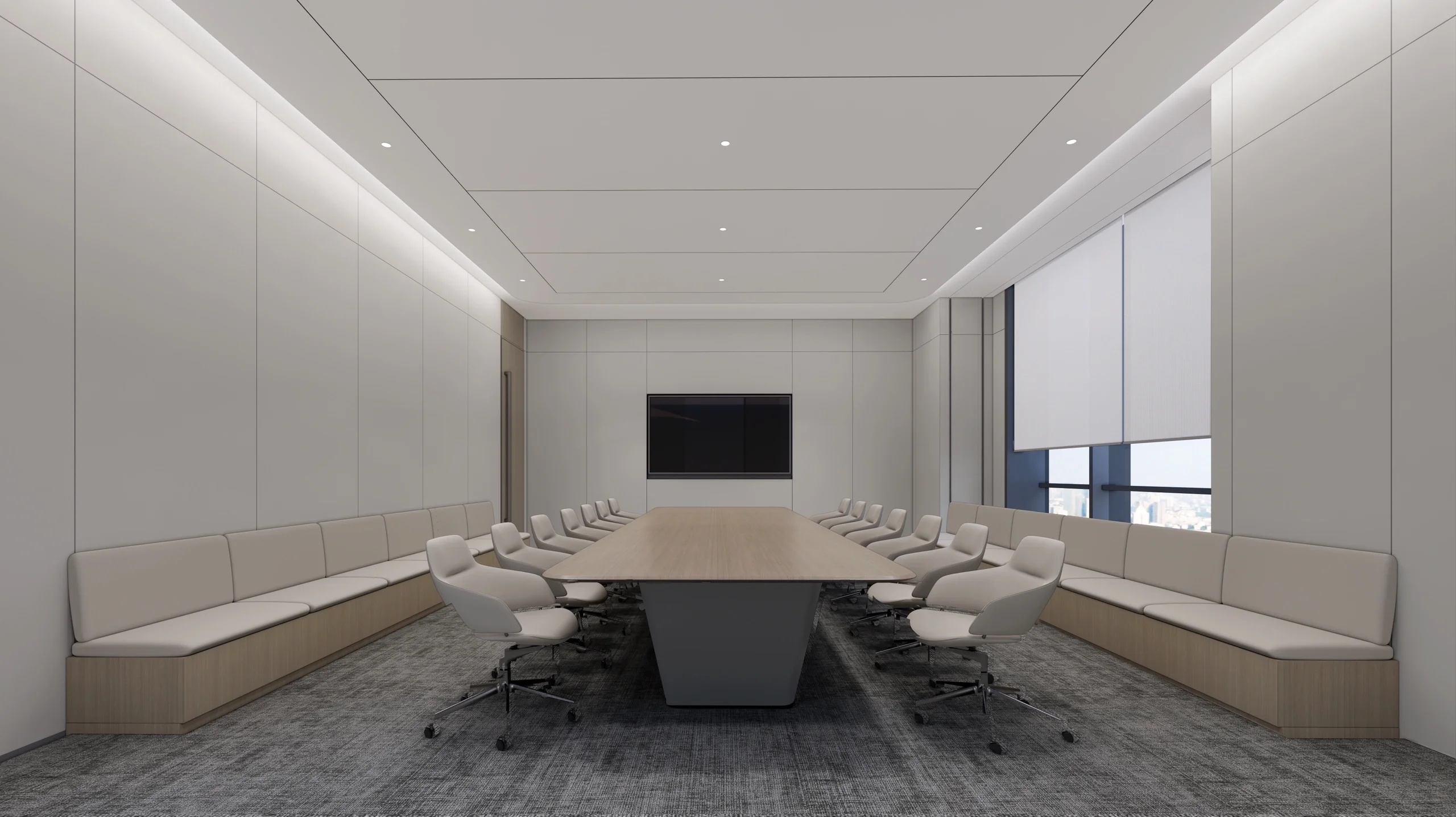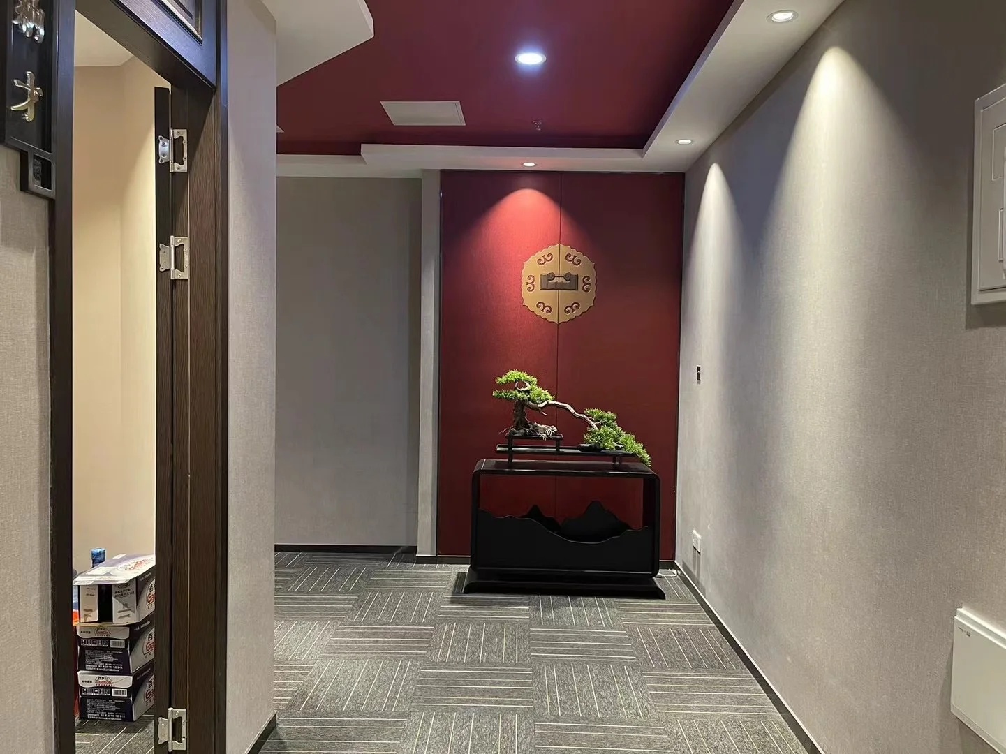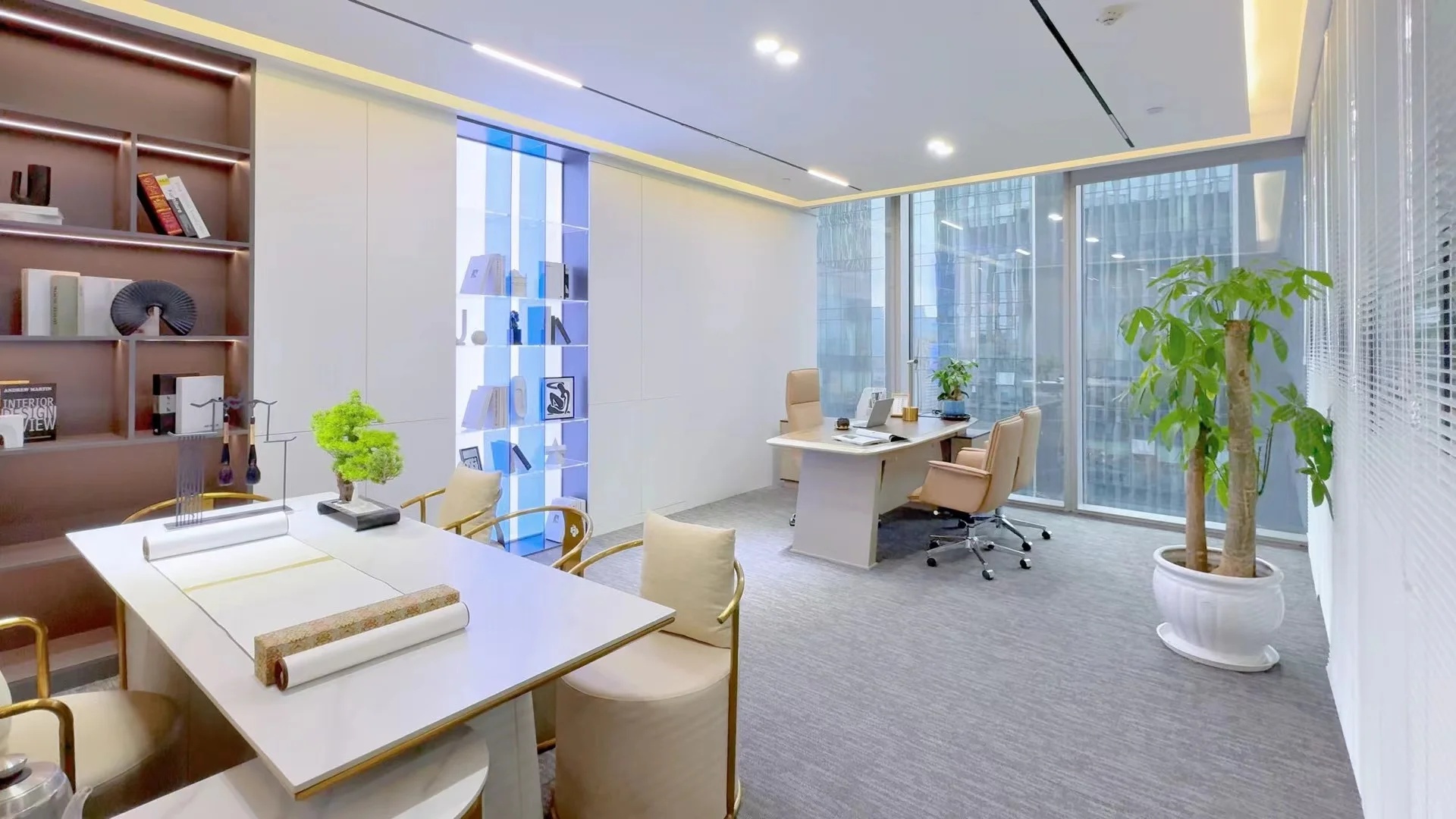 天然环保的材料中色彩以大地色系(浅米灰+木色)为空间基调,整体视觉简约素雅,宁静不张扬。“简约”满足于现代人对于轻松自由环境的诉求,“素雅”则是符合于新中式风格的特色。在如此舒适的环境下办公何尝不是一种享受。