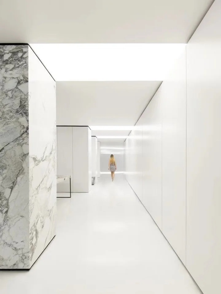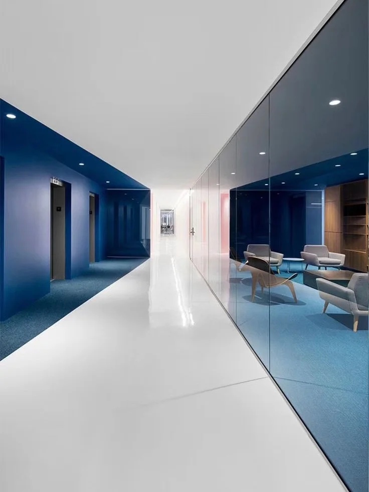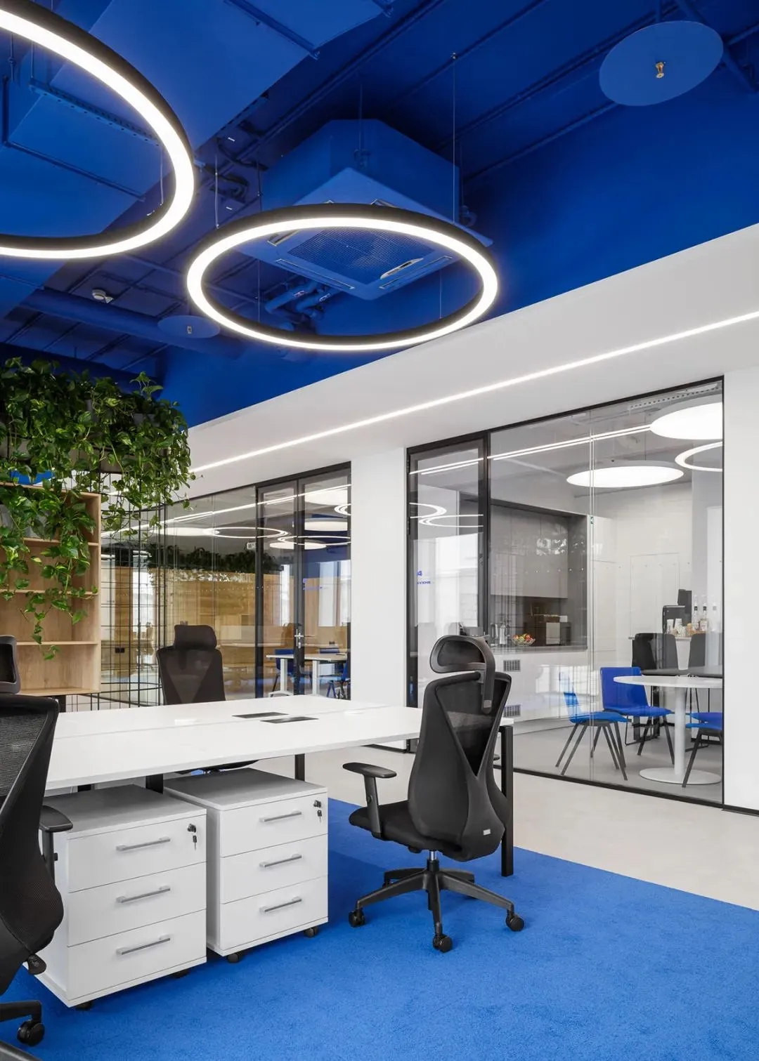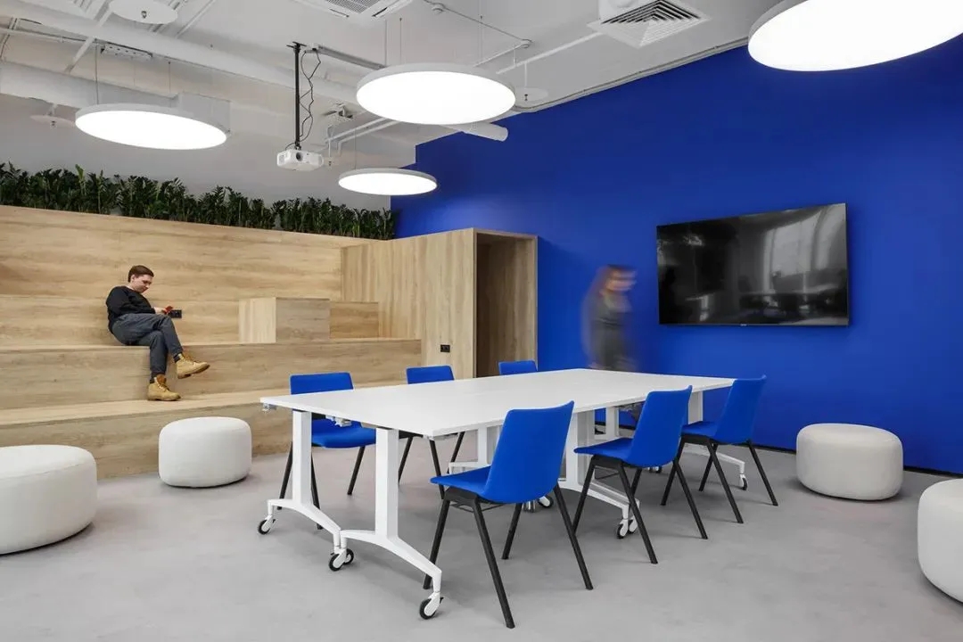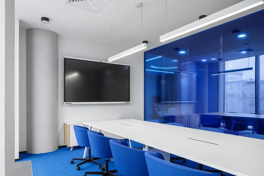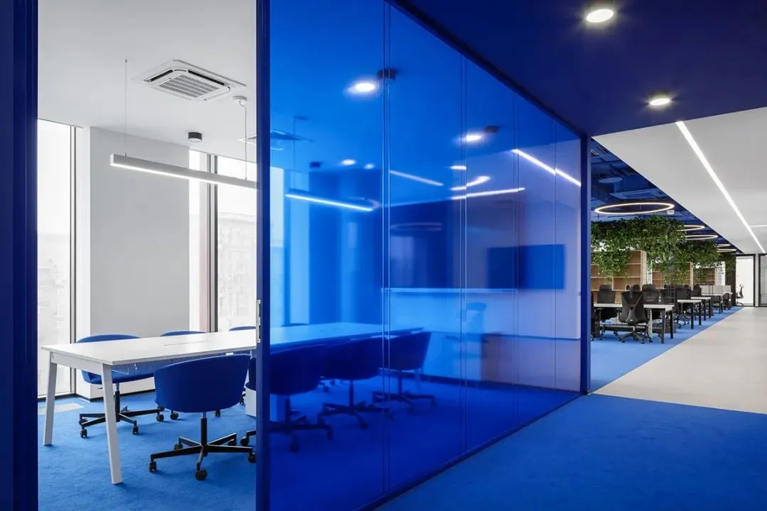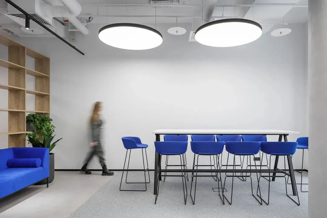 蓝色是办公室设计中最常用的颜色,尤其是在科技公司。然而,在很多设计案例中,能够体现蓝色的审美空间却很少,甚至蓝色的空间设计让很多人审美疲劳。Offcon的这个设计给我们带来了全新的视觉冲击和审美空间体验。大面积的蓝色色块,结合极简的白色空间体量,辅以黑色点缀,营造出宁静、优雅、时尚、美好的空间氛围。