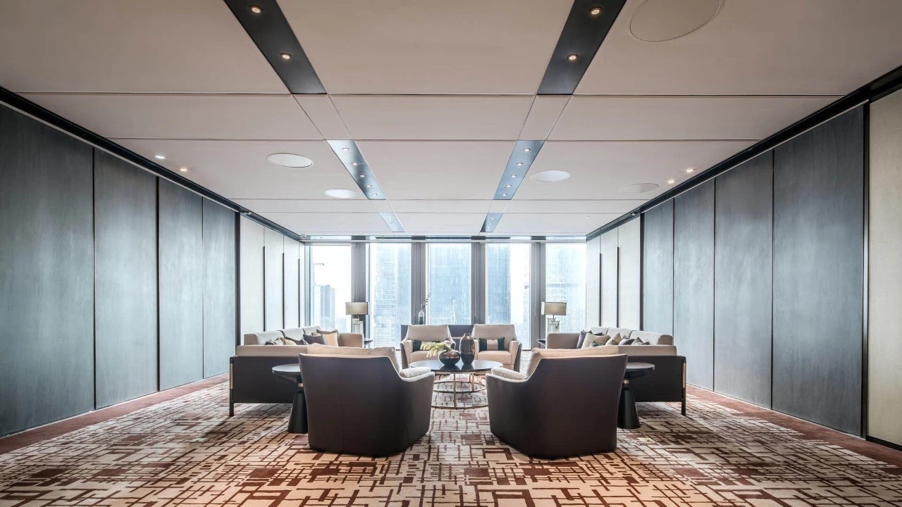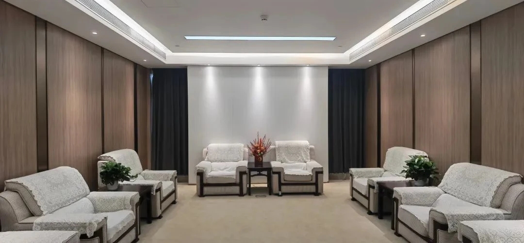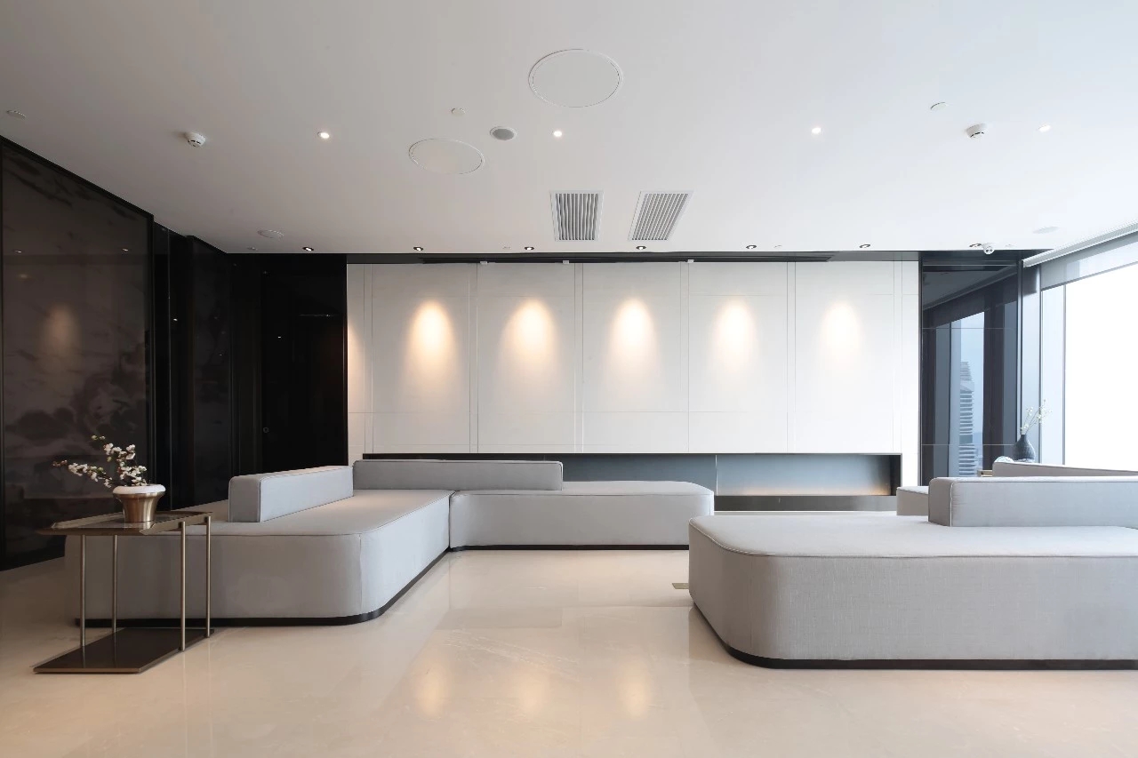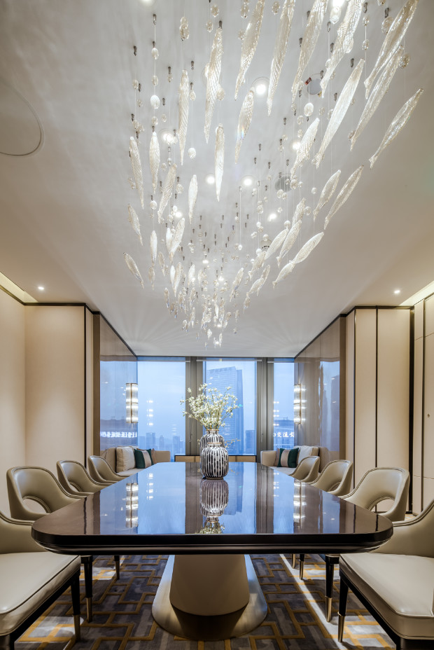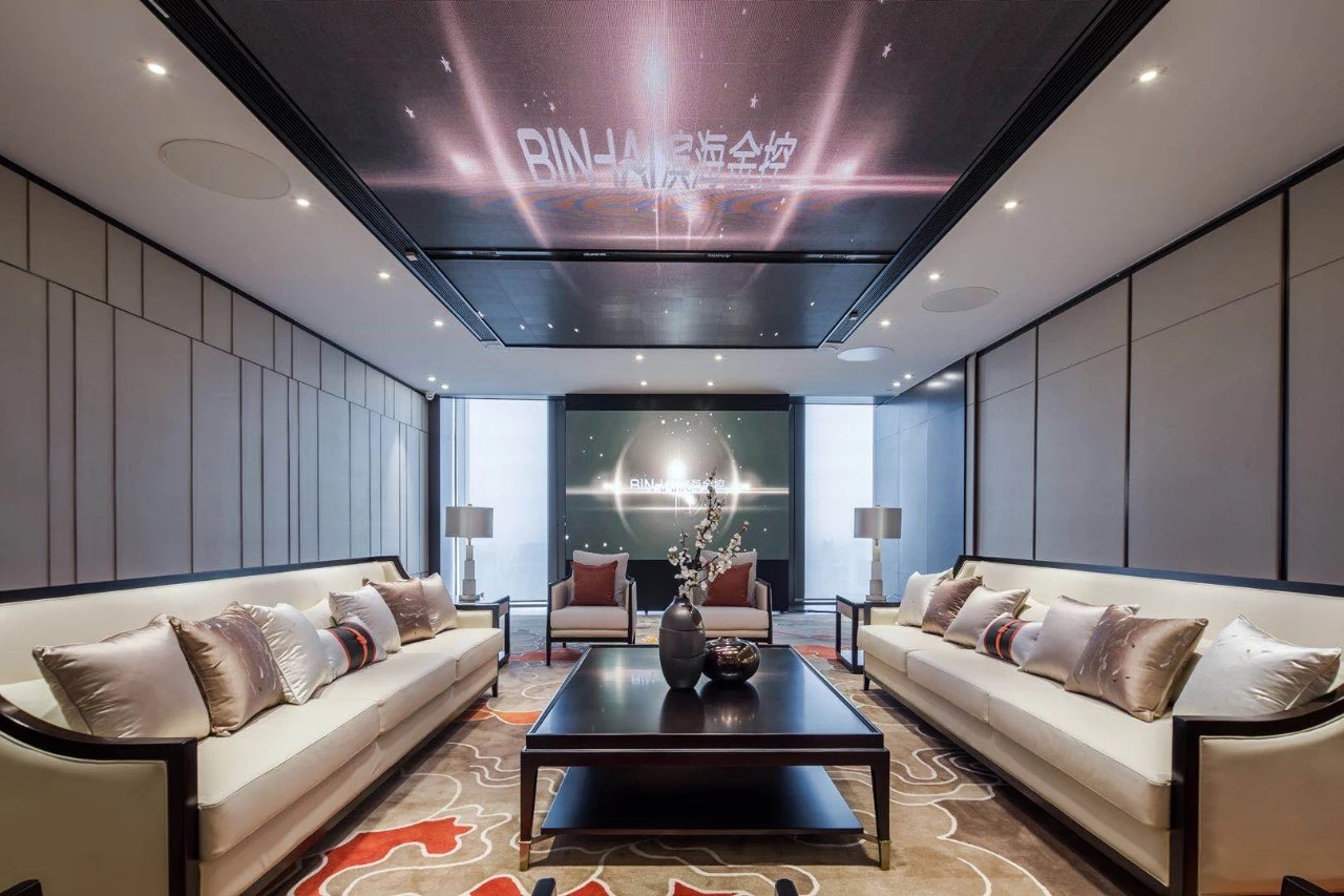 家具回应着建筑线条的迂回,与云腾图案十分契合。天花板和墙面的滨海金控投影画面给人震撼的视听享受。