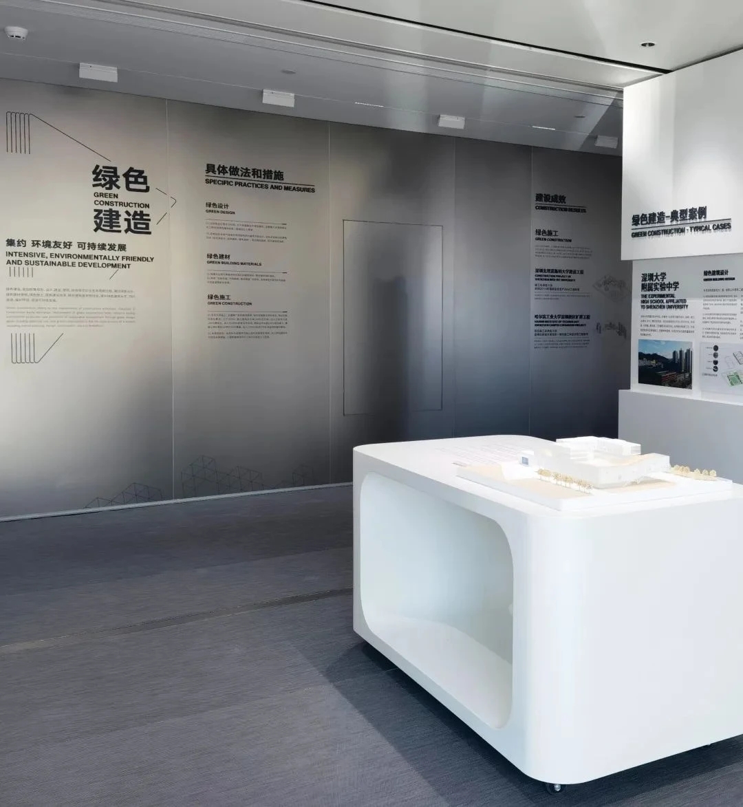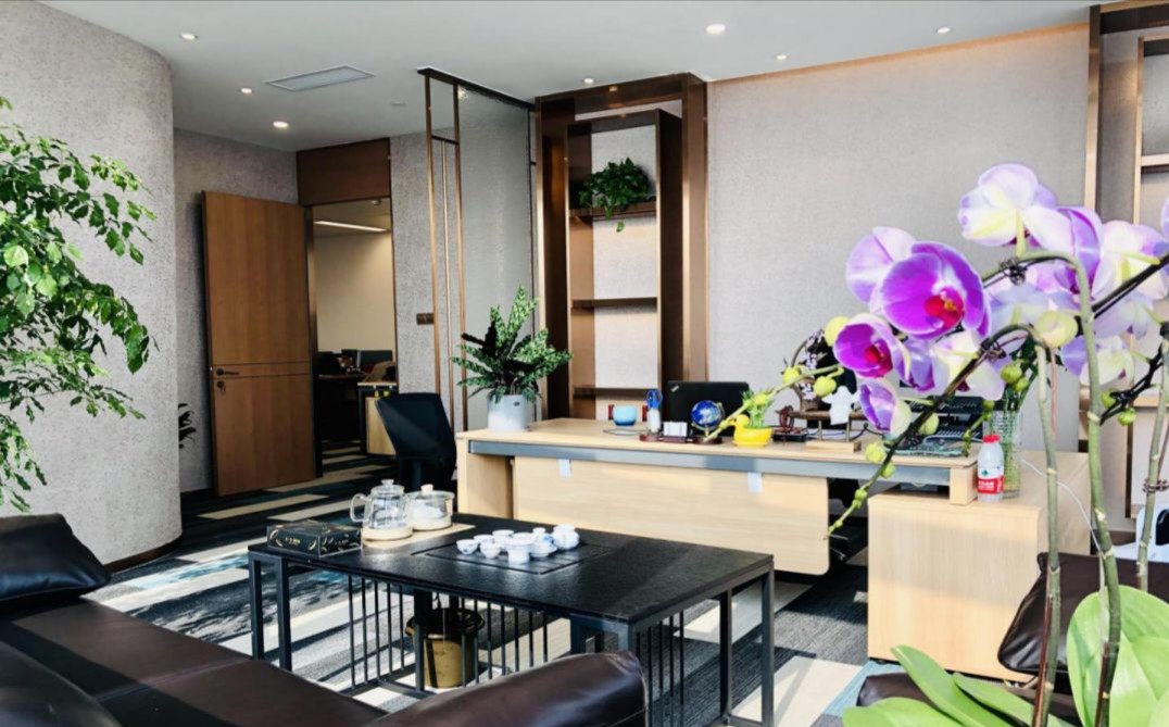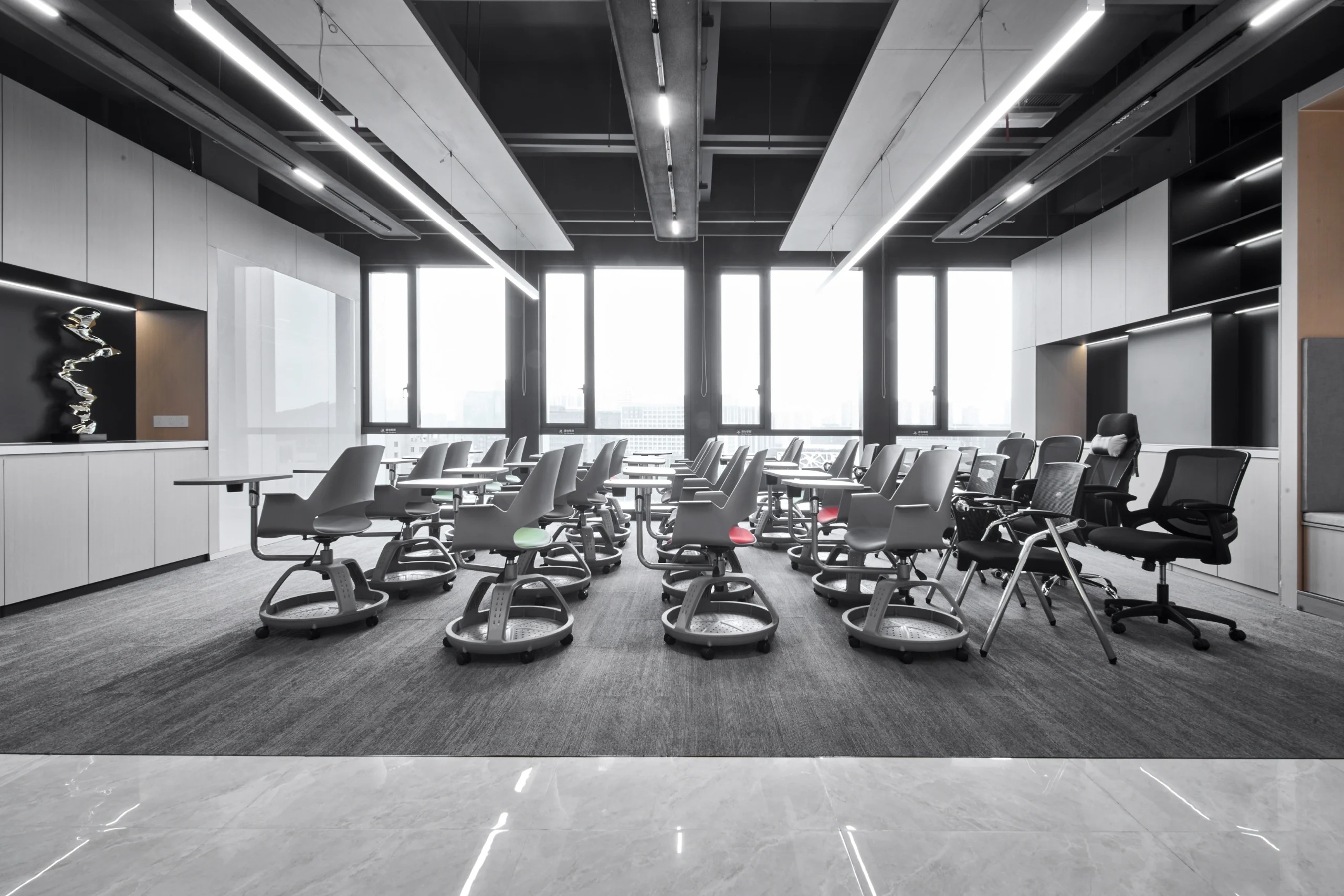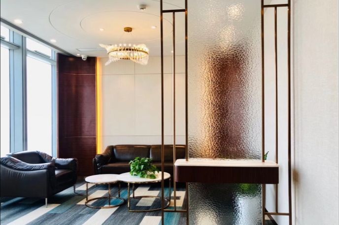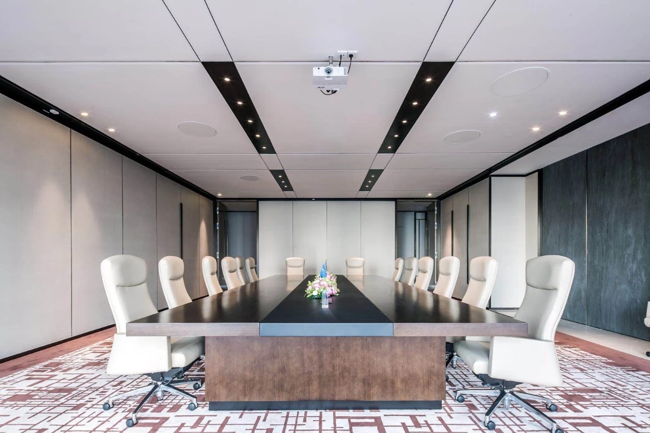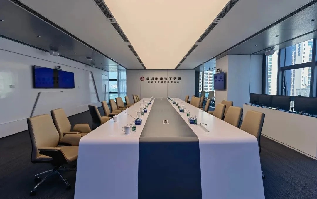 家具回应着建筑线条的迂回,与云腾图案十分契合。天花板和墙面的滨海金控投影画面给人震撼的视听享受。