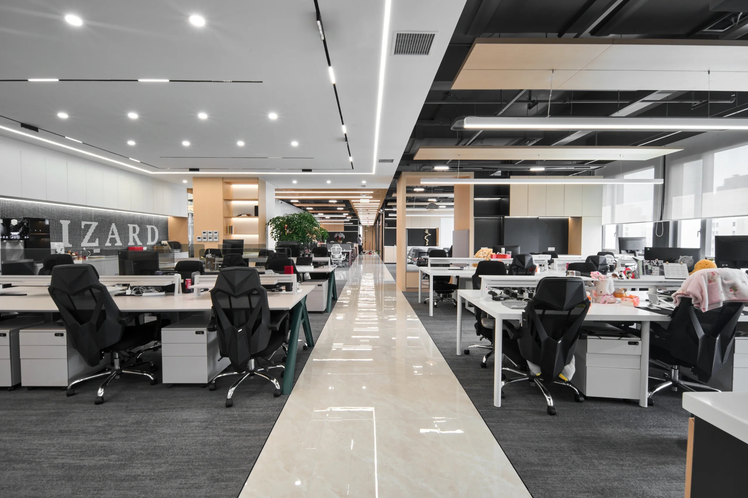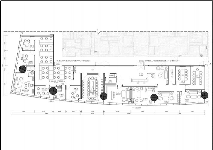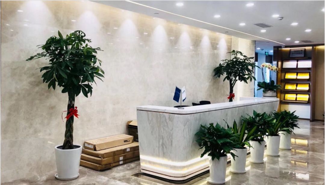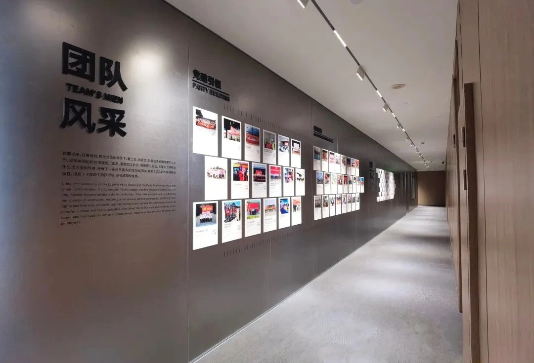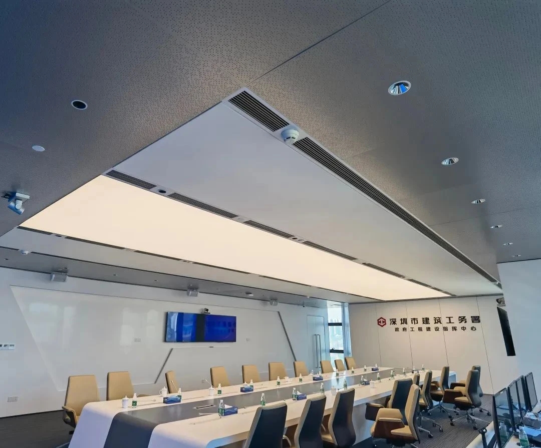 家具回应着建筑线条的迂回,与云腾图案十分契合。天花板和墙面的滨海金控投影画面给人震撼的视听享受。