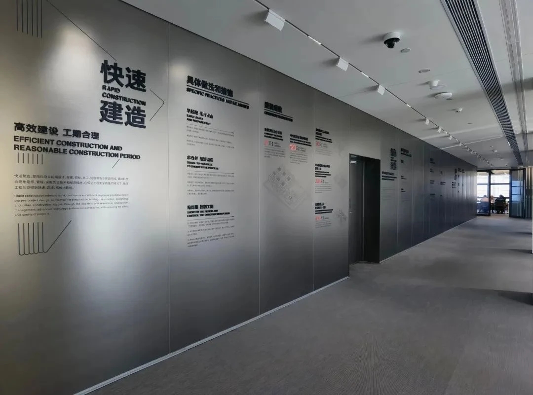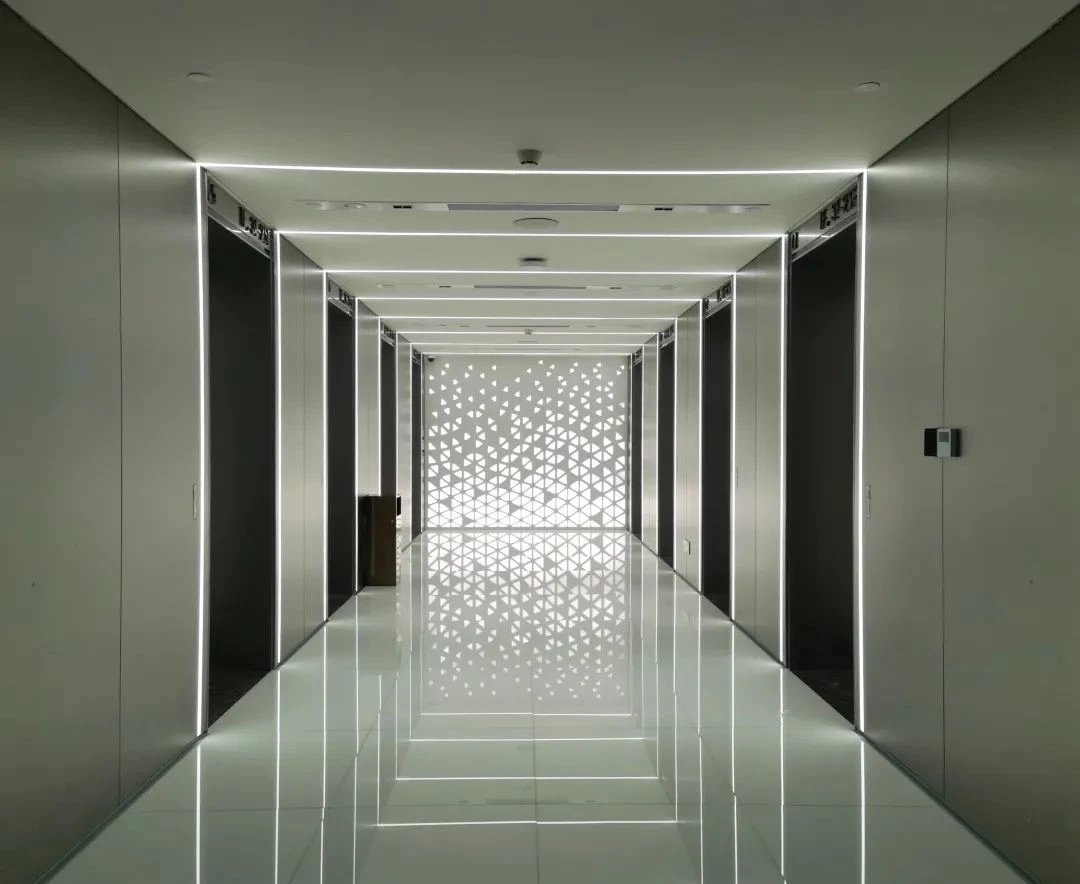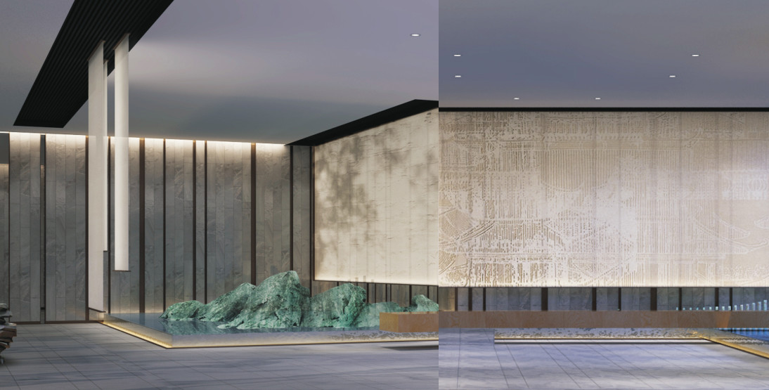 整个装饰区取名“龙起水”,寓意游龙顺风顺水。此装饰区为中海怡高团队专研的概念,石壁画作源自岭南十三行街区繁荣的景象,以水纹环绕,配合望海石,孕育出岭南的渔港文化。再配合投影技术,与行人互动,将动态的光影图像融合到空间墙上。