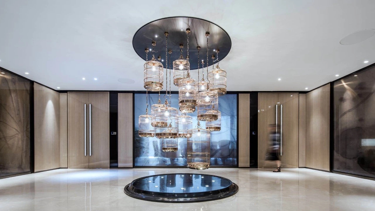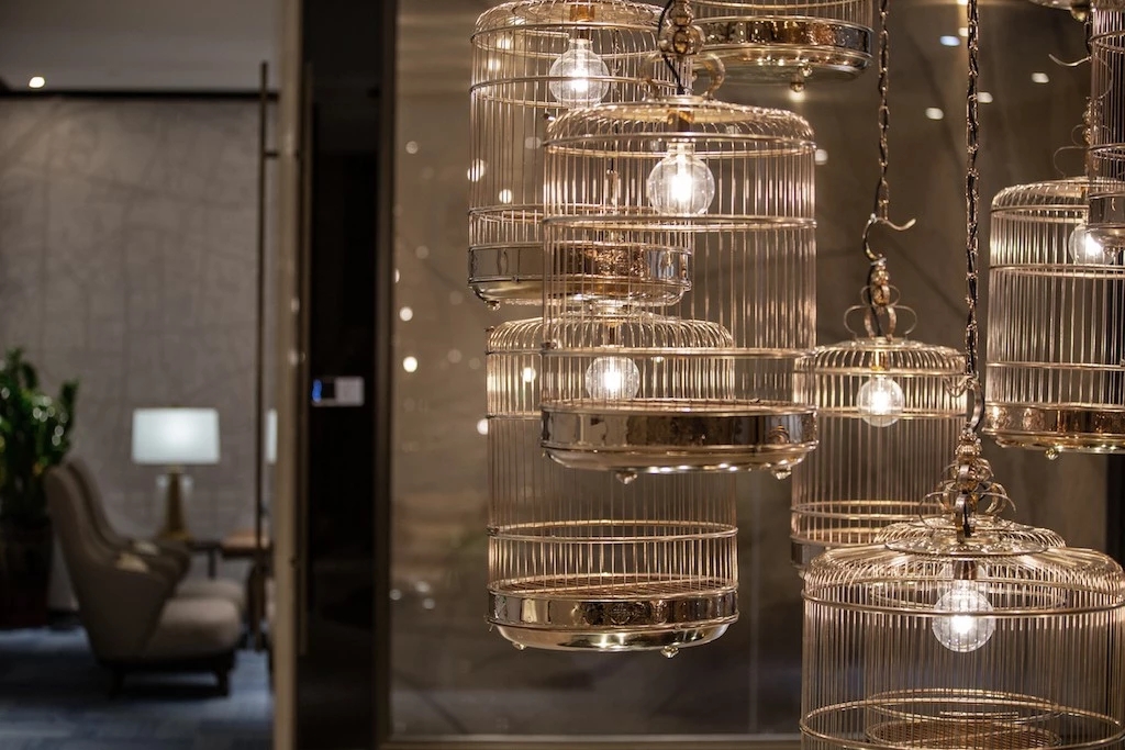 为了丰富空间的质感与层次,中庭区、过道以开场的圆形示人,融合错落的鸟笼元素、鱼篓元素、舞狮元素,制造出空间中最具张力的视觉焦点,人行其中,光线微微穿透其中,倾泻出与众不同的空间魅力,在另类新奇中隐现设计美感。