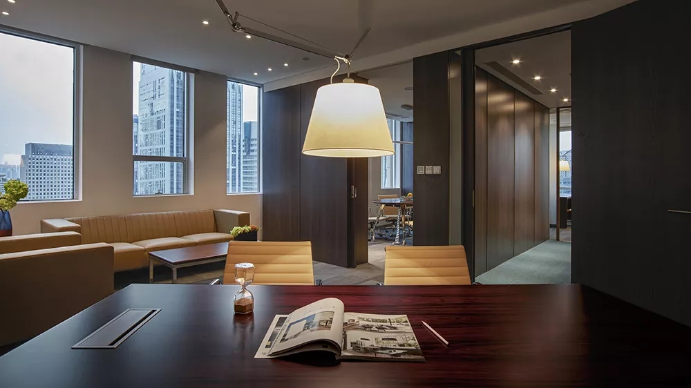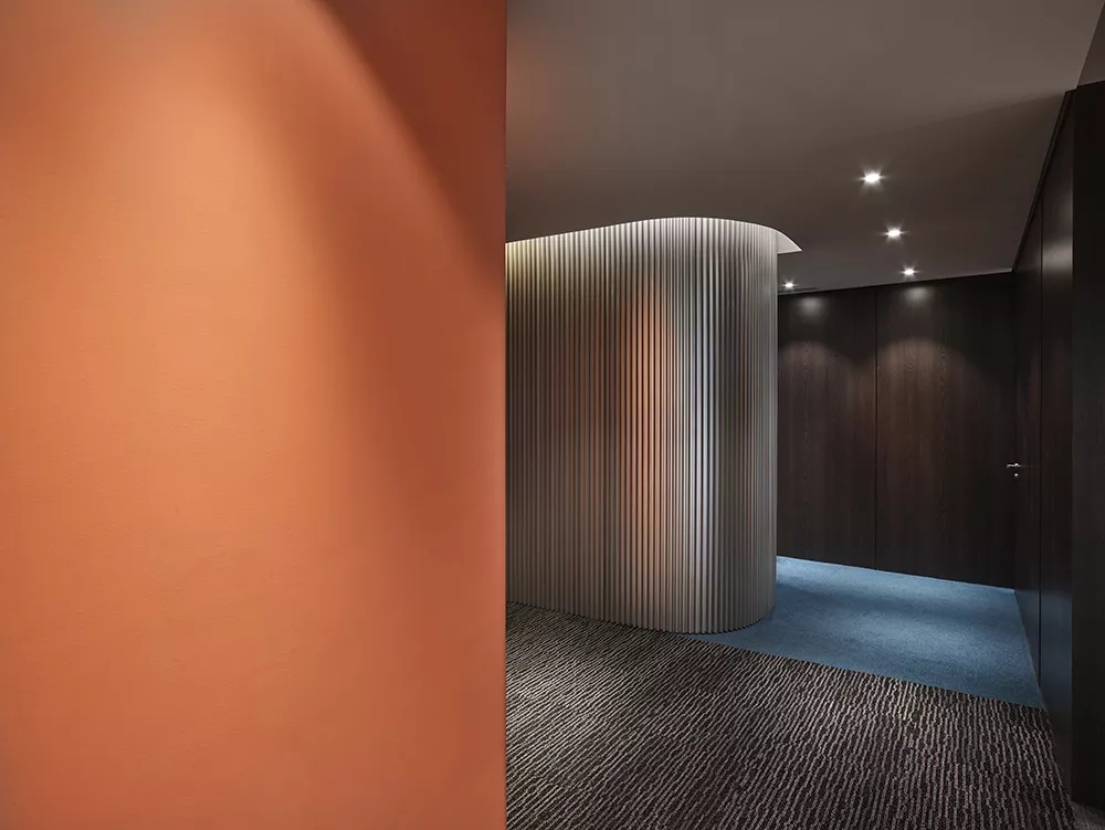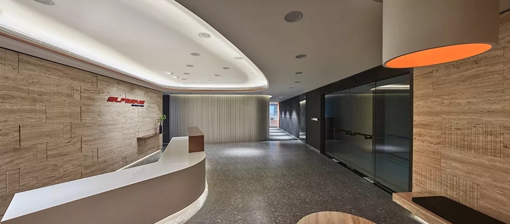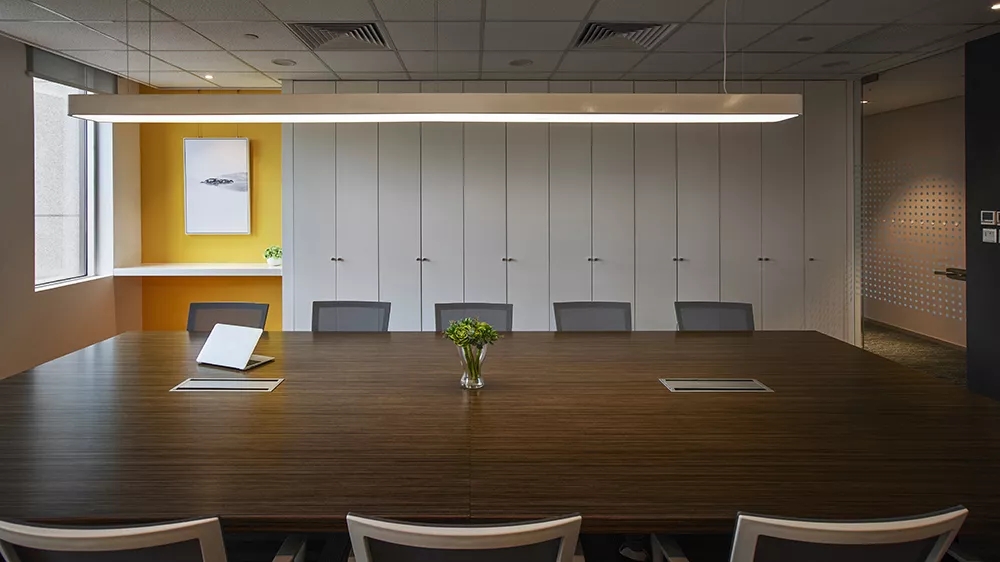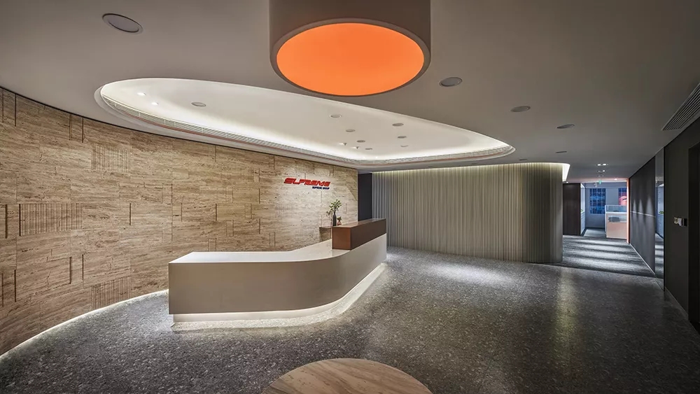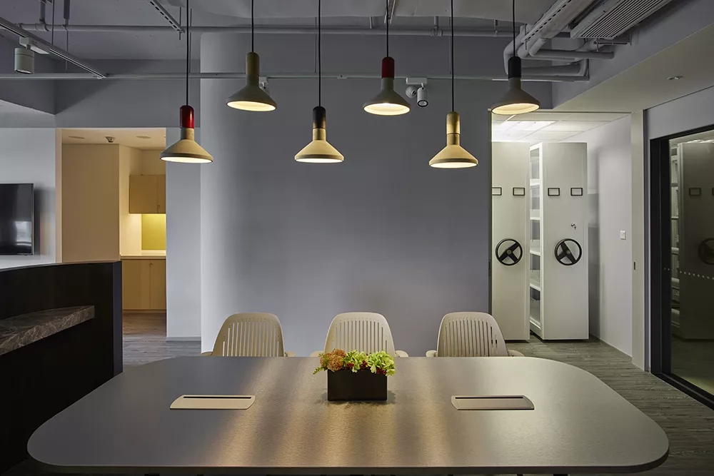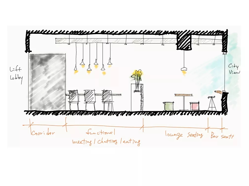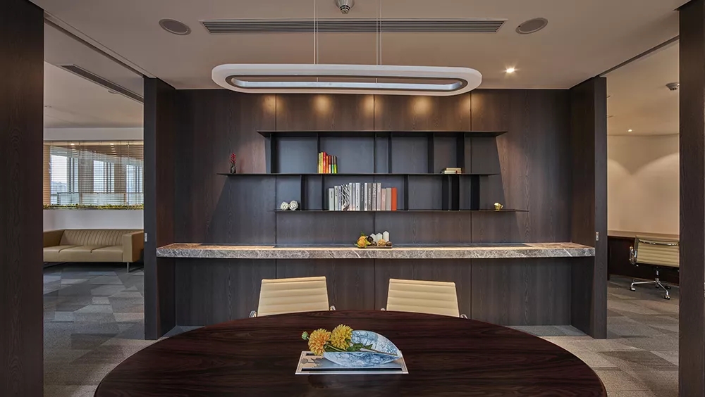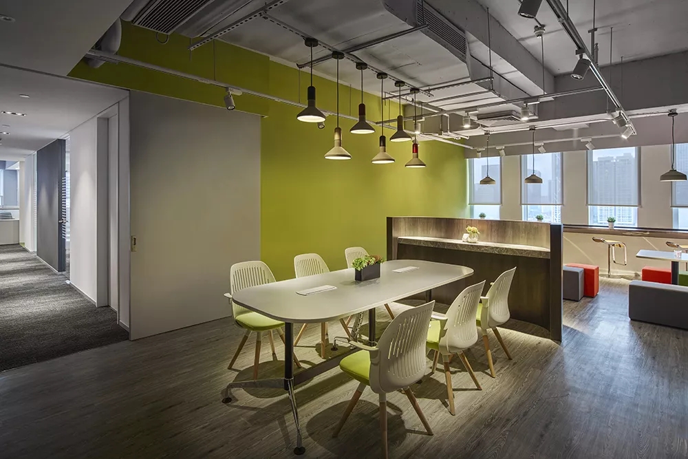 整个空间以员工休閒区为结尾, 以半高弧形屏风枱面把此区分为前区的会议桌区和靠窗的Lounge区, 此 空间可有多功能使用, 除员工放松休闲外还可有会议功能;另以不同色块的活动家具及不同形式的吊灯, 希望创造出一 让员工可在此放鬆、充电、随性讨论氛围的工作环境。