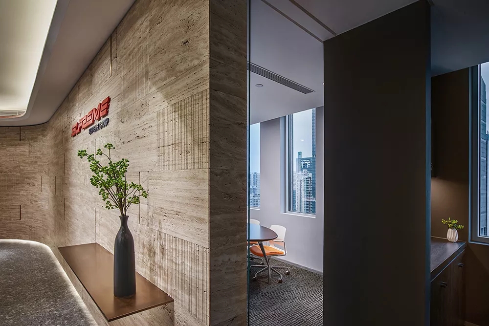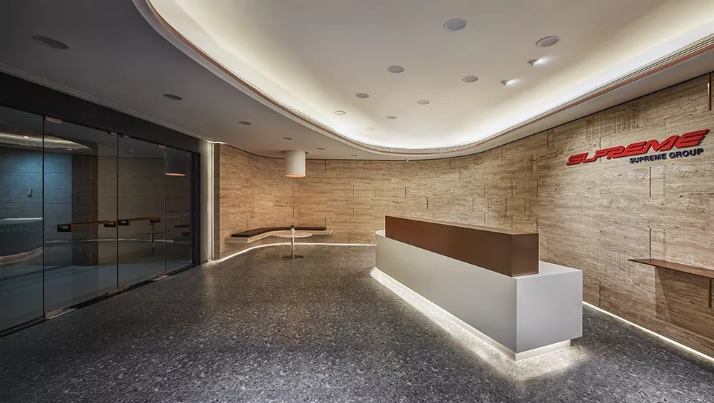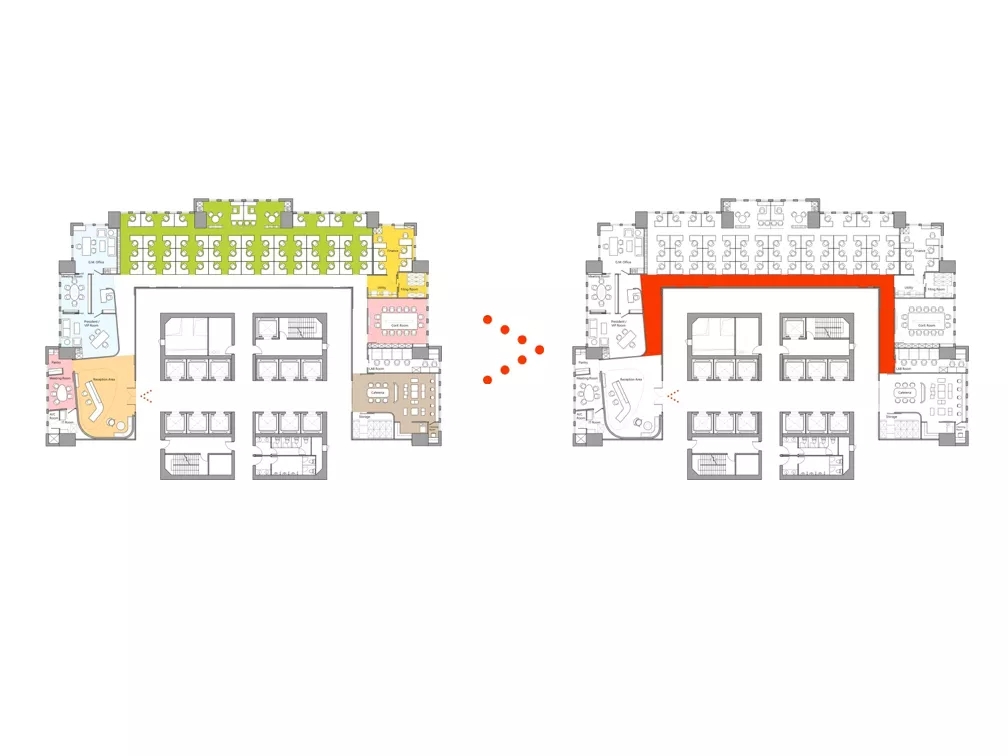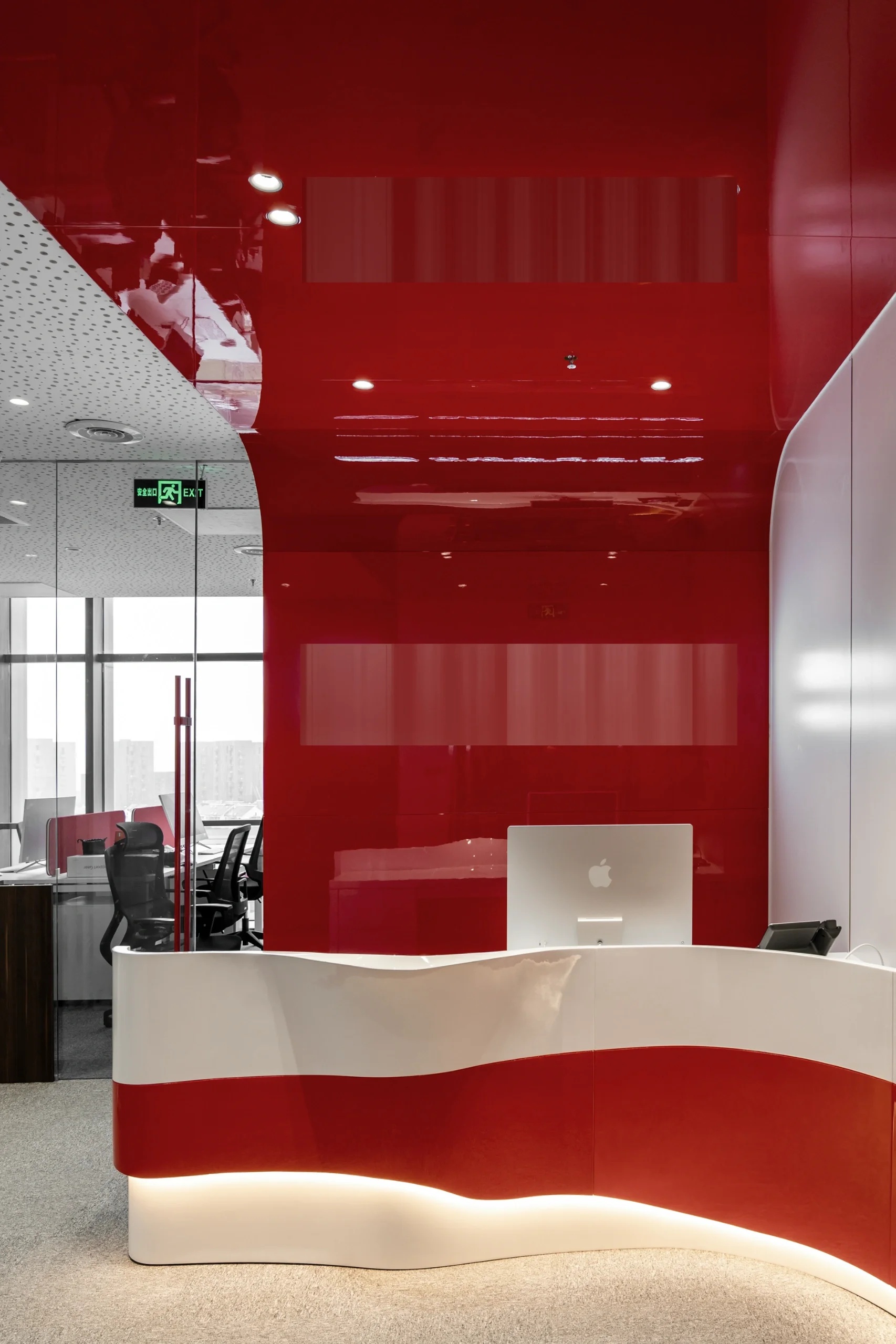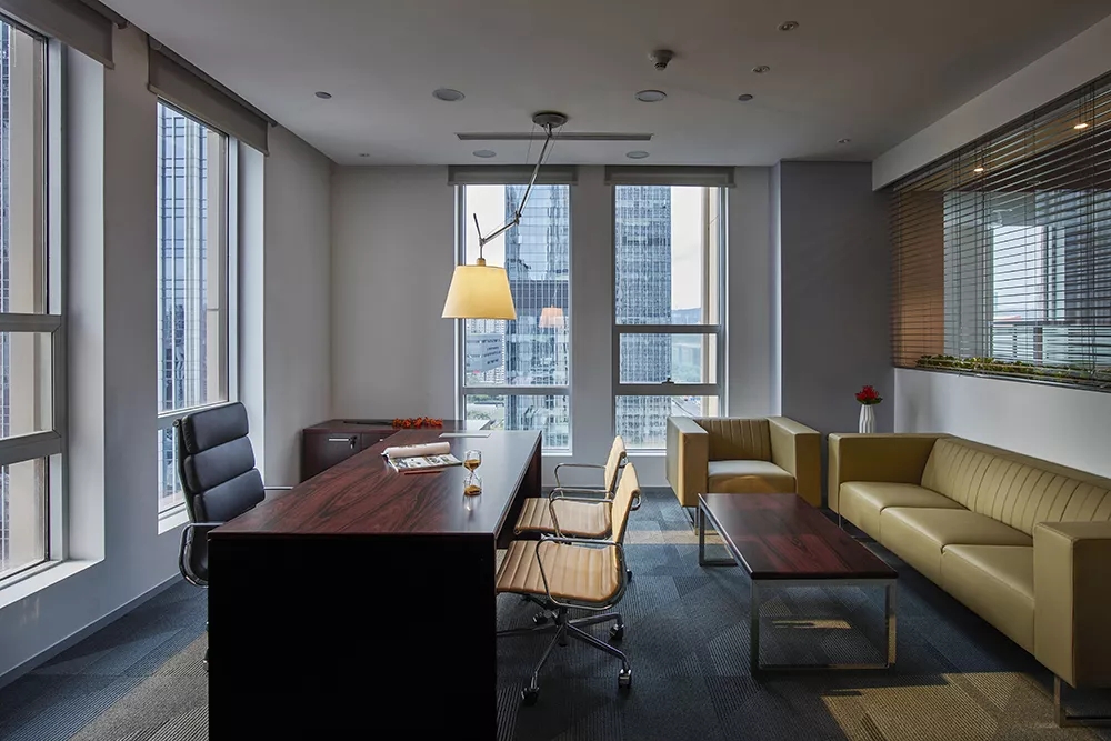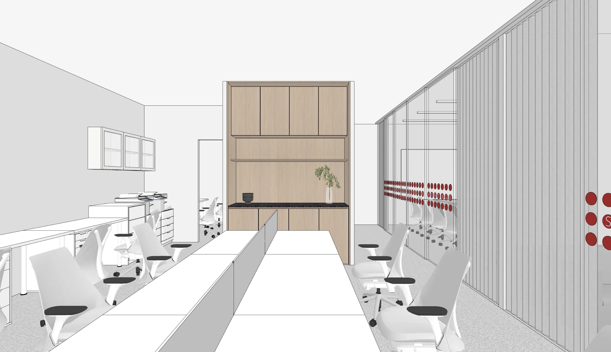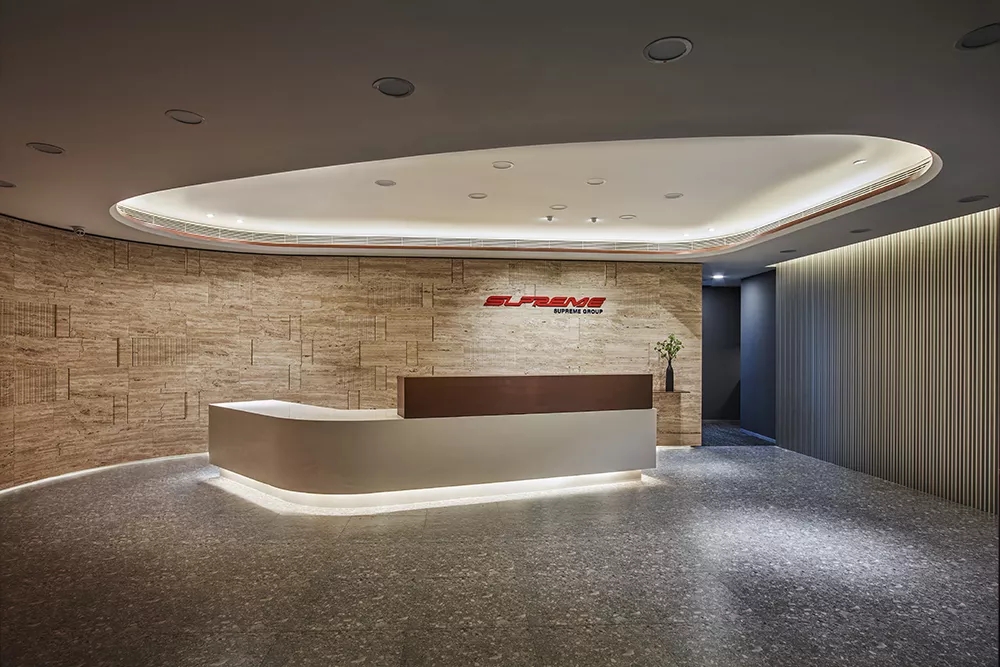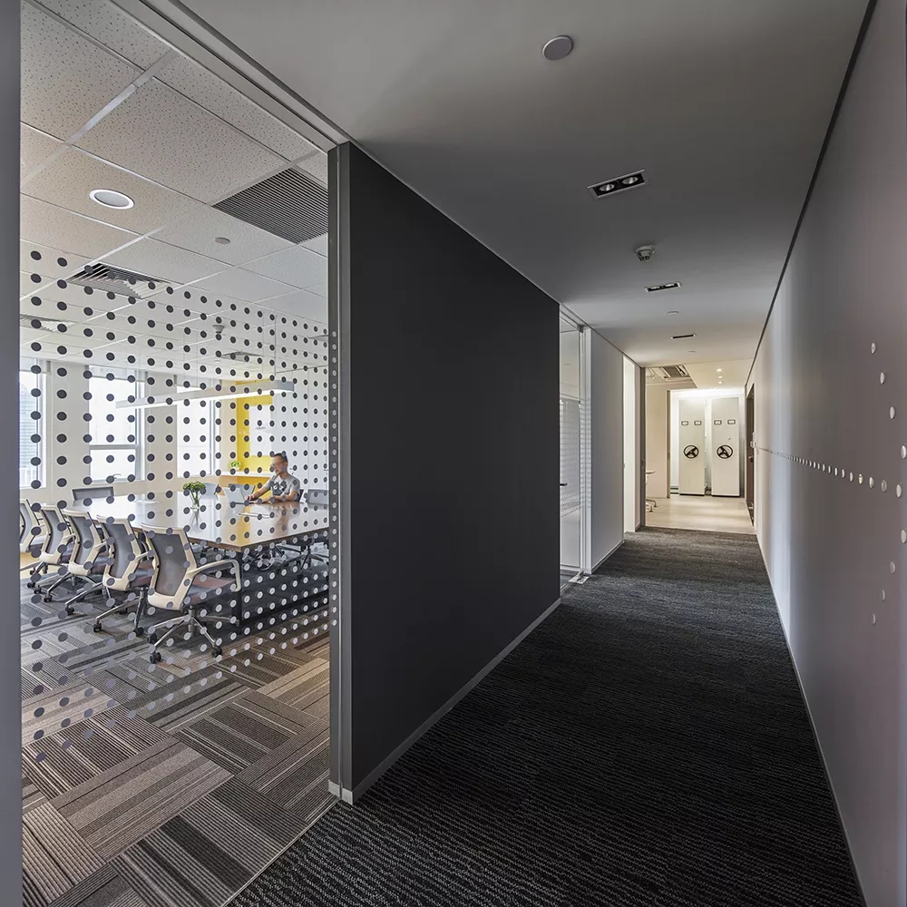 整个空间以员工休閒区为结尾, 以半高弧形屏风枱面把此区分为前区的会议桌区和靠窗的Lounge区, 此 空间可有多功能使用, 除员工放松休闲外还可有会议功能;另以不同色块的活动家具及不同形式的吊灯, 希望创造出一 让员工可在此放鬆、充电、随性讨论氛围的工作环境。