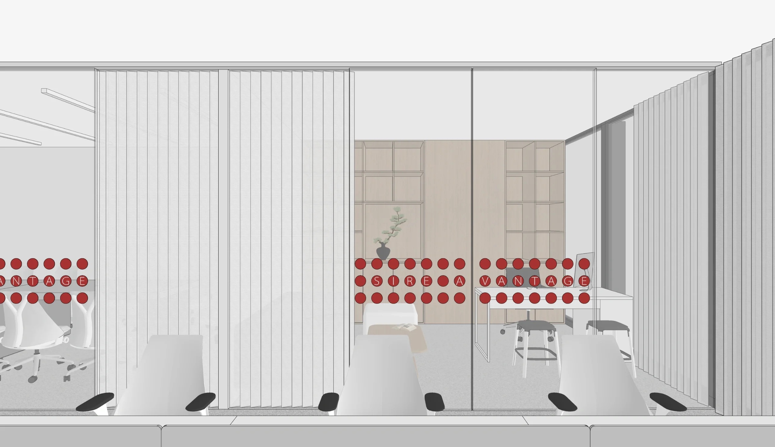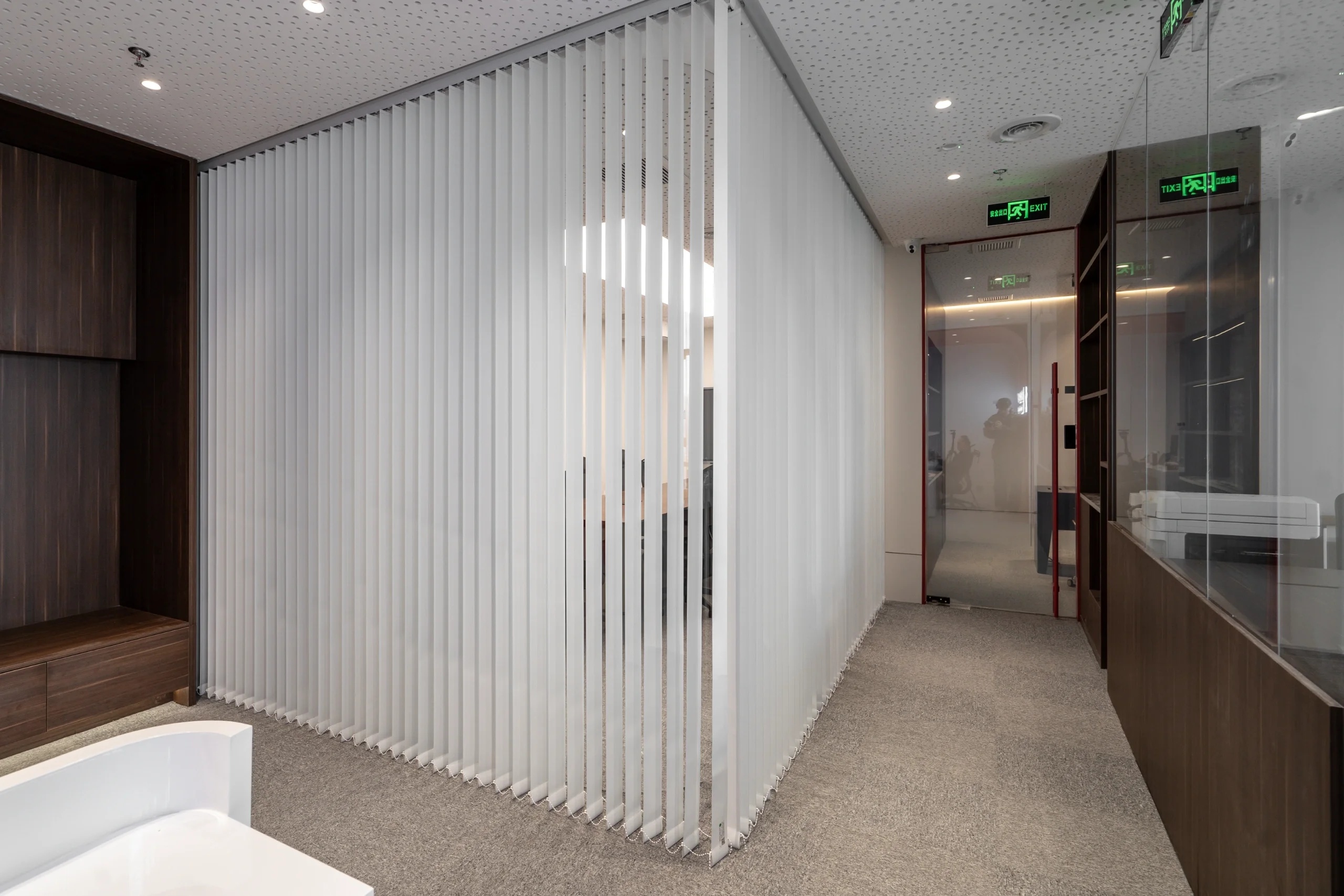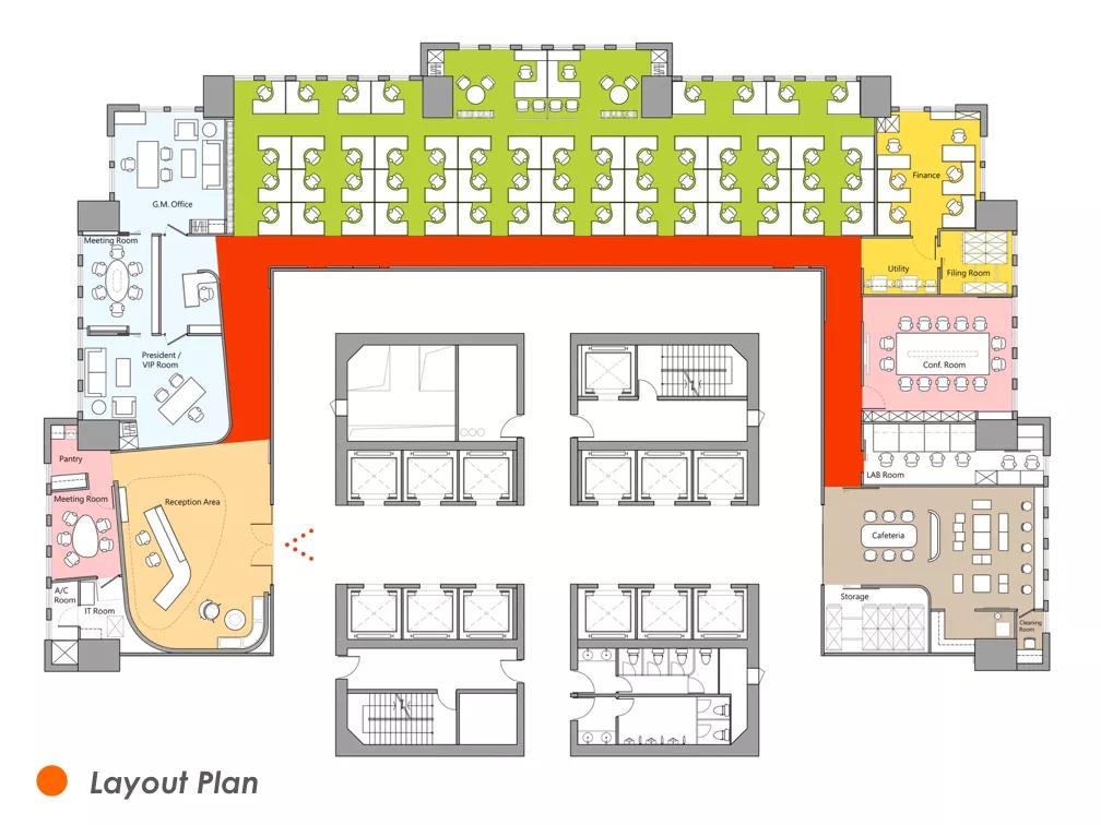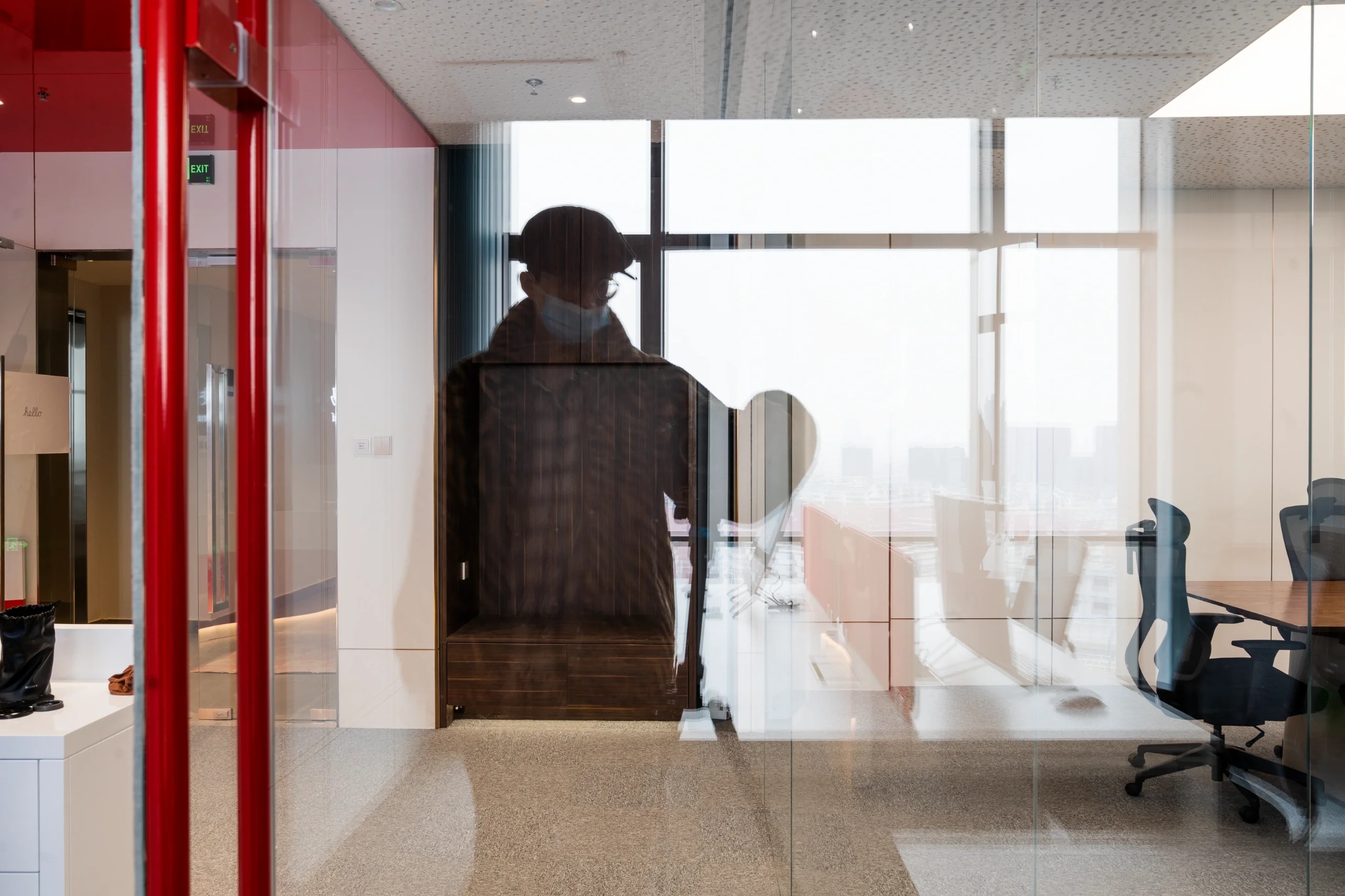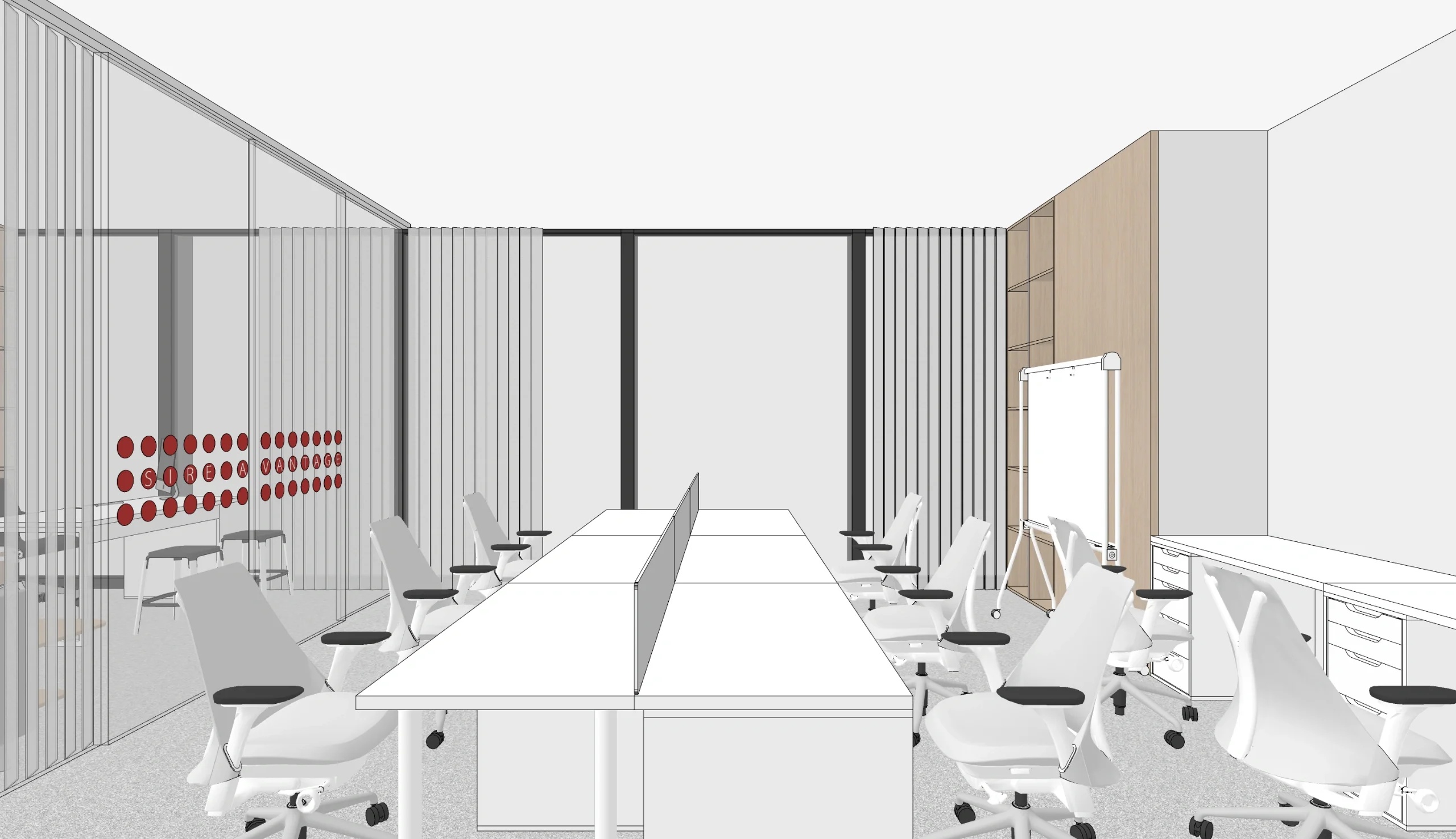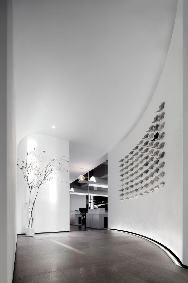 整个空间以员工休閒区为结尾, 以半高弧形屏风枱面把此区分为前区的会议桌区和靠窗的Lounge区, 此 空间可有多功能使用, 除员工放松休闲外还可有会议功能;另以不同色块的活动家具及不同形式的吊灯, 希望创造出一 让员工可在此放鬆、充电、随性讨论氛围的工作环境。