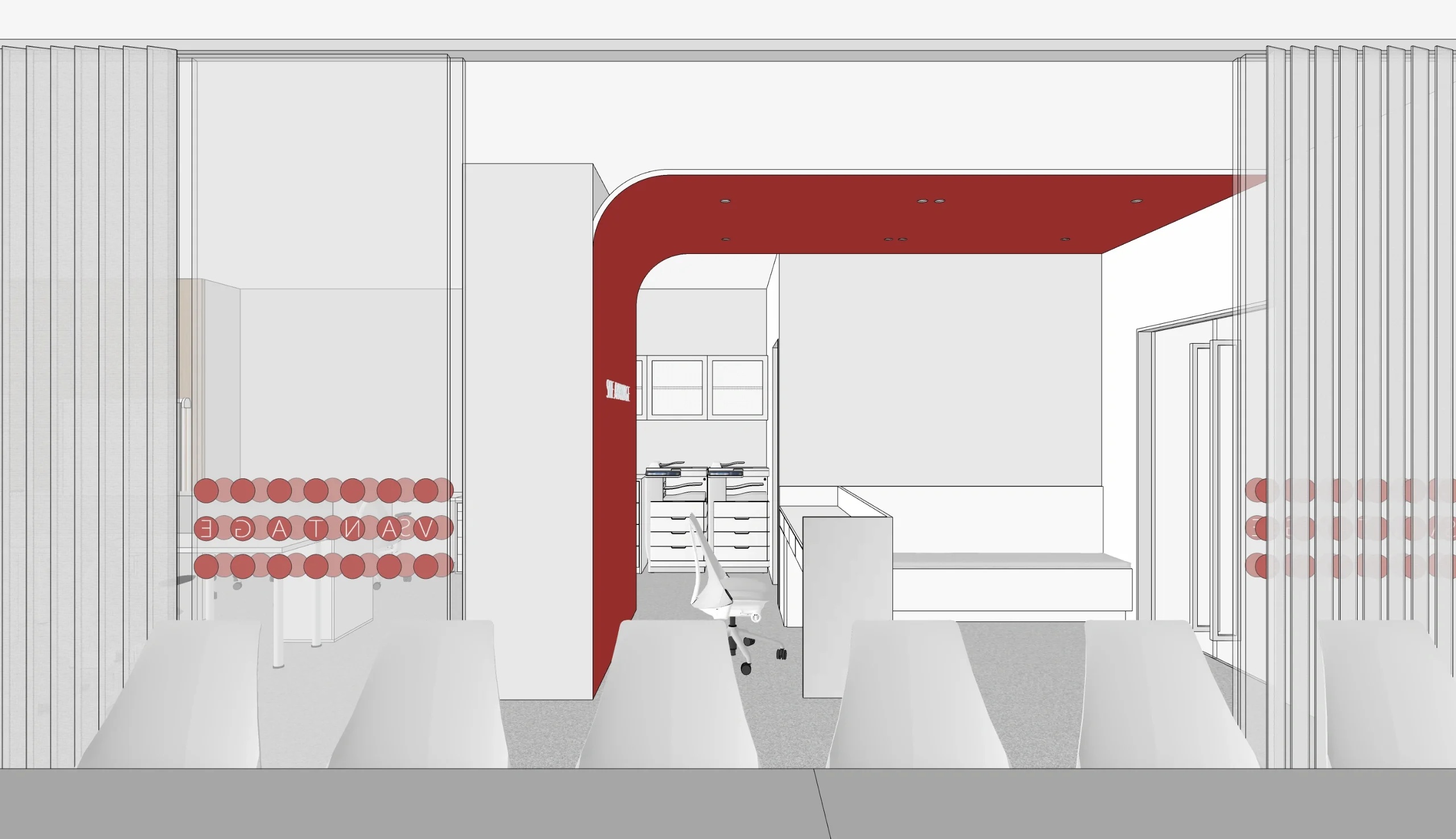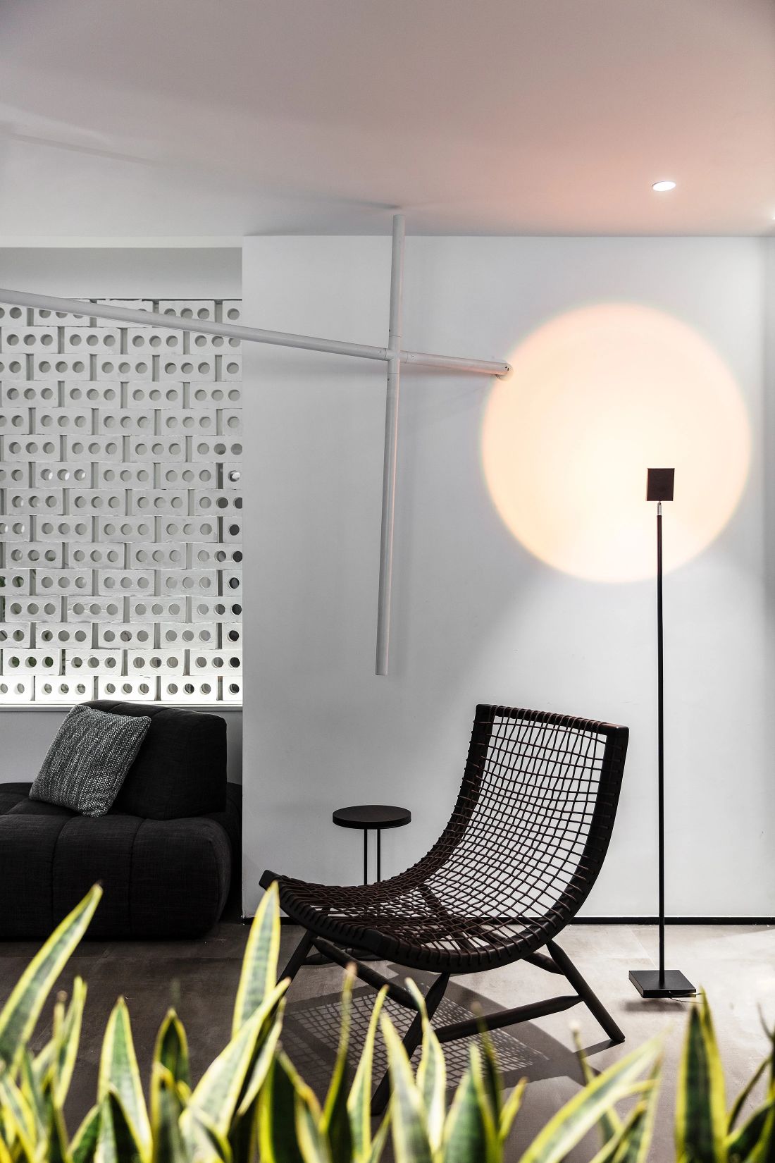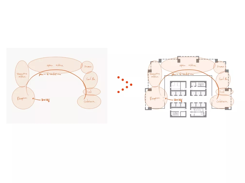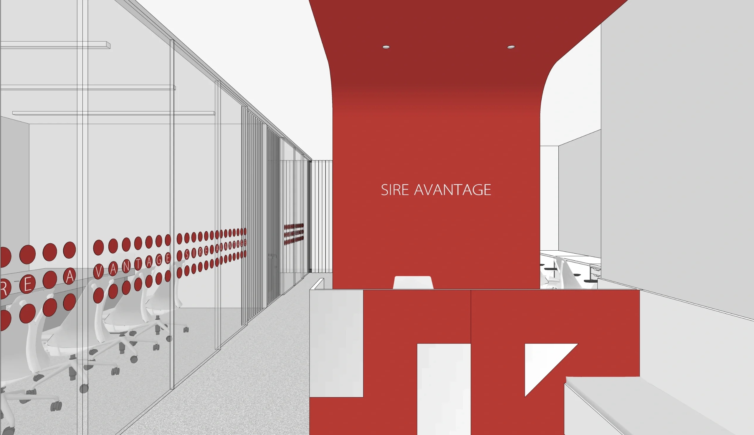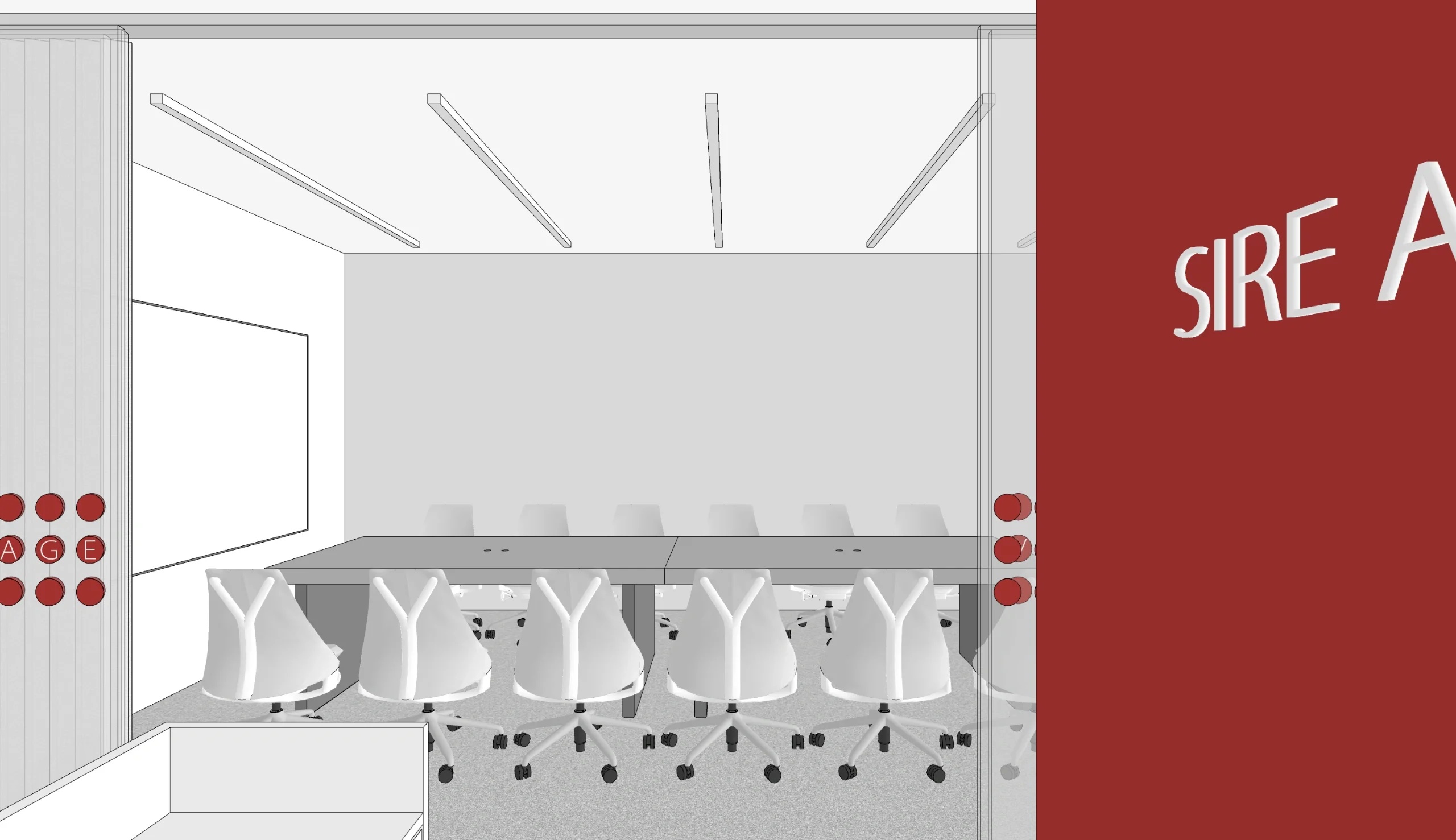整个空间以员工休閒区为结尾, 以半高弧形屏风枱面把此区分为前区的会议桌区和靠窗的Lounge区, 此 空间可有多功能使用, 除员工放松休闲外还可有会议功能;另以不同色块的活动家具及不同形式的吊灯, 希望创造出一 让员工可在此放鬆、充电、随性讨论氛围的工作环境。