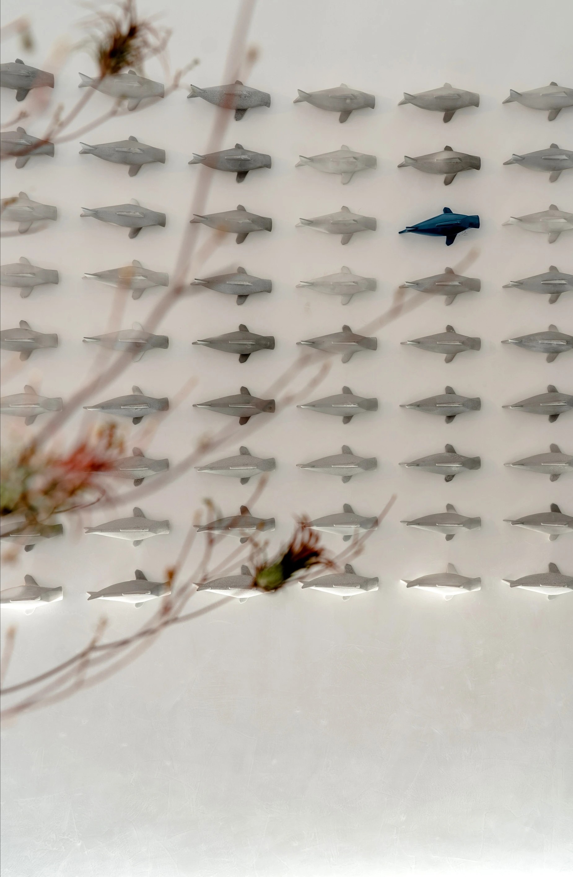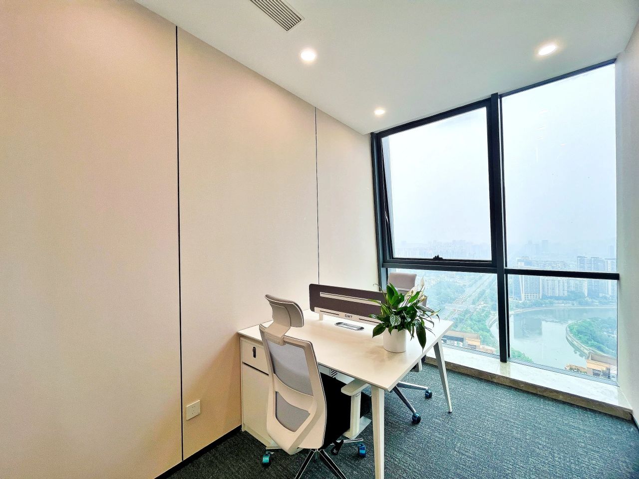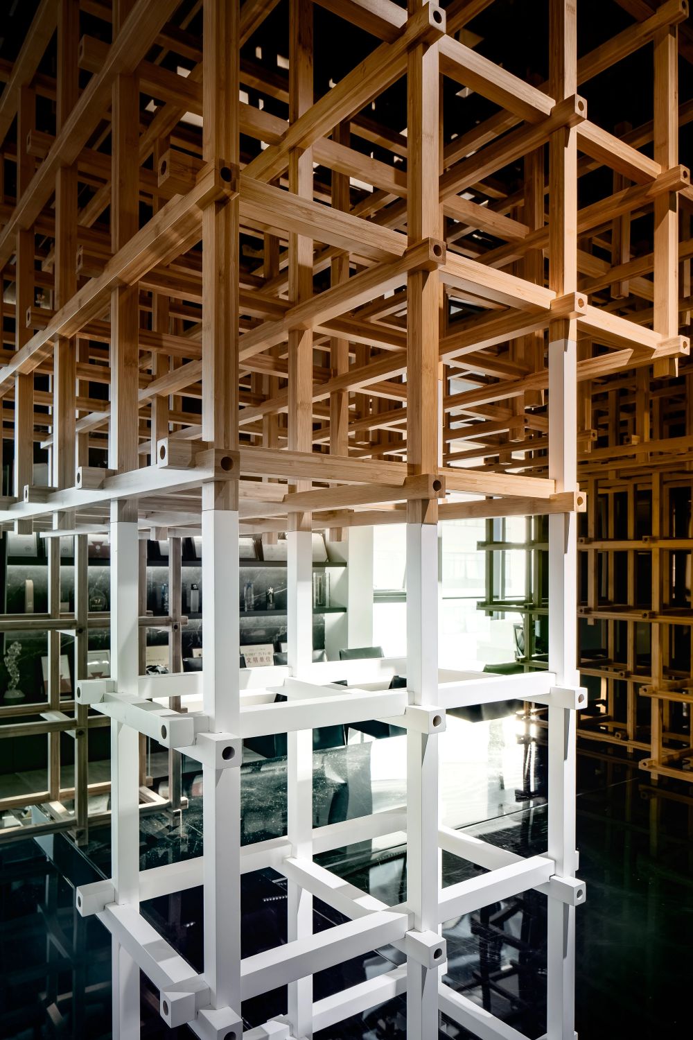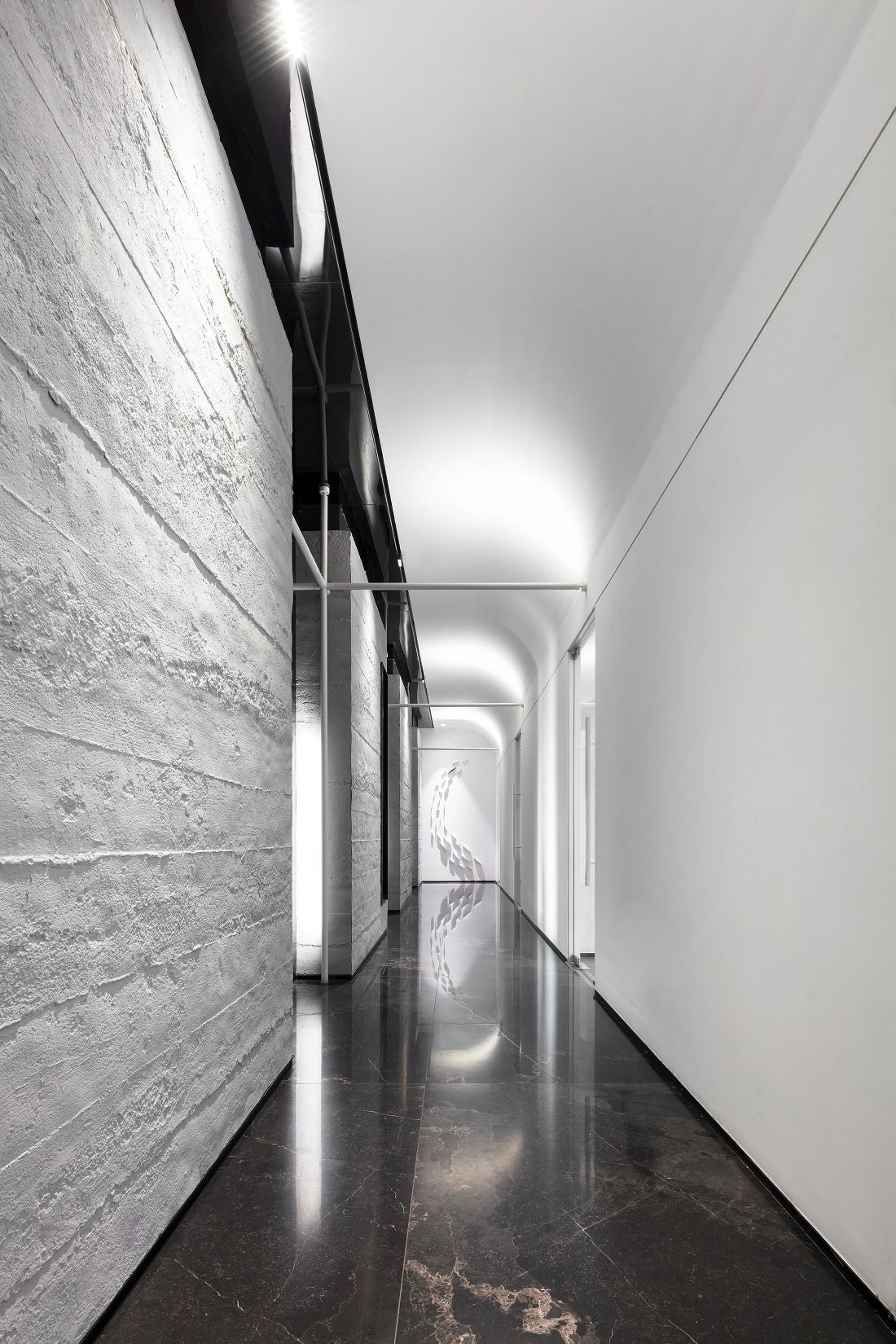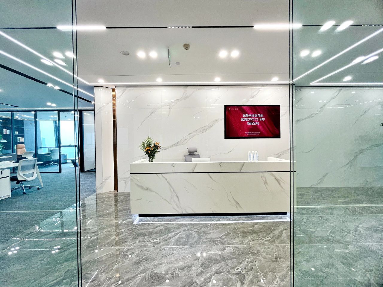 整个空间以员工休閒区为结尾, 以半高弧形屏风枱面把此区分为前区的会议桌区和靠窗的Lounge区, 此 空间可有多功能使用, 除员工放松休闲外还可有会议功能;另以不同色块的活动家具及不同形式的吊灯, 希望创造出一 让员工可在此放鬆、充电、随性讨论氛围的工作环境。