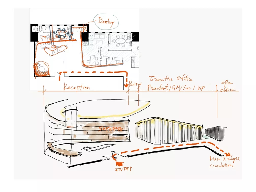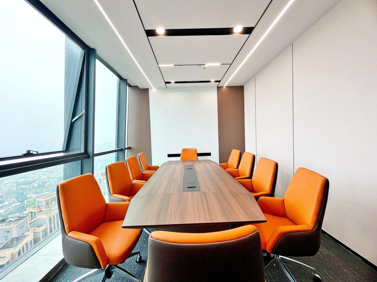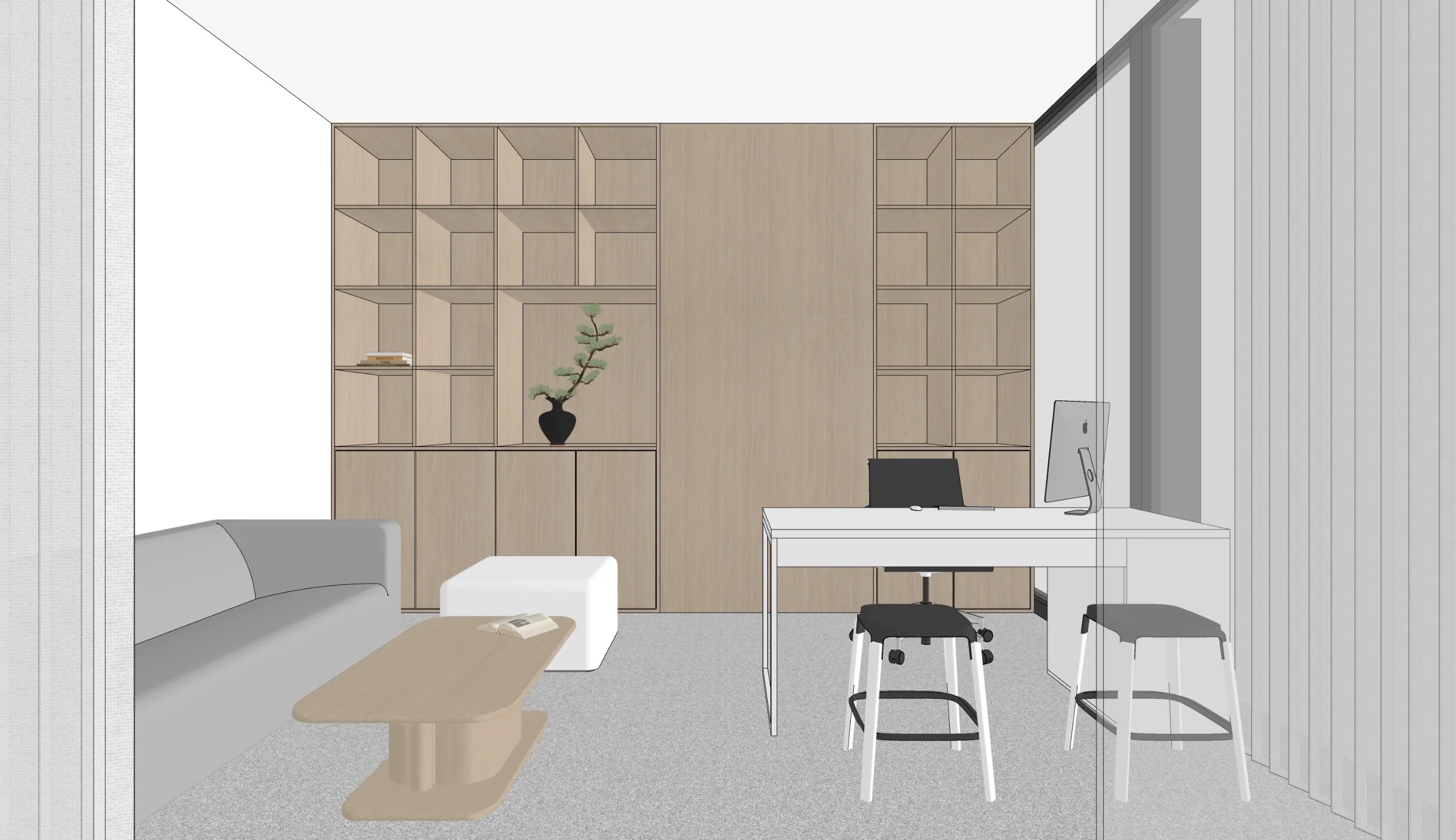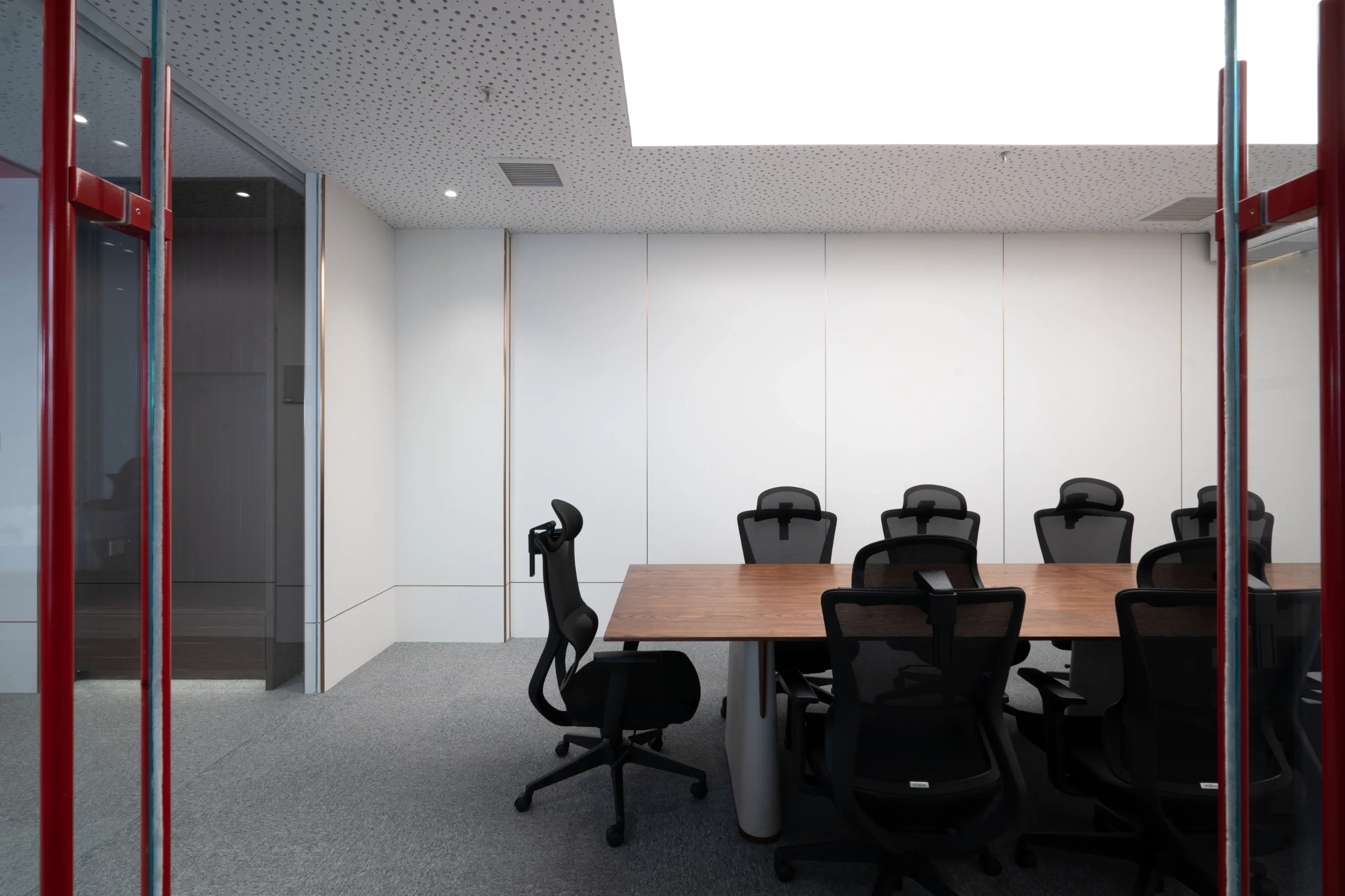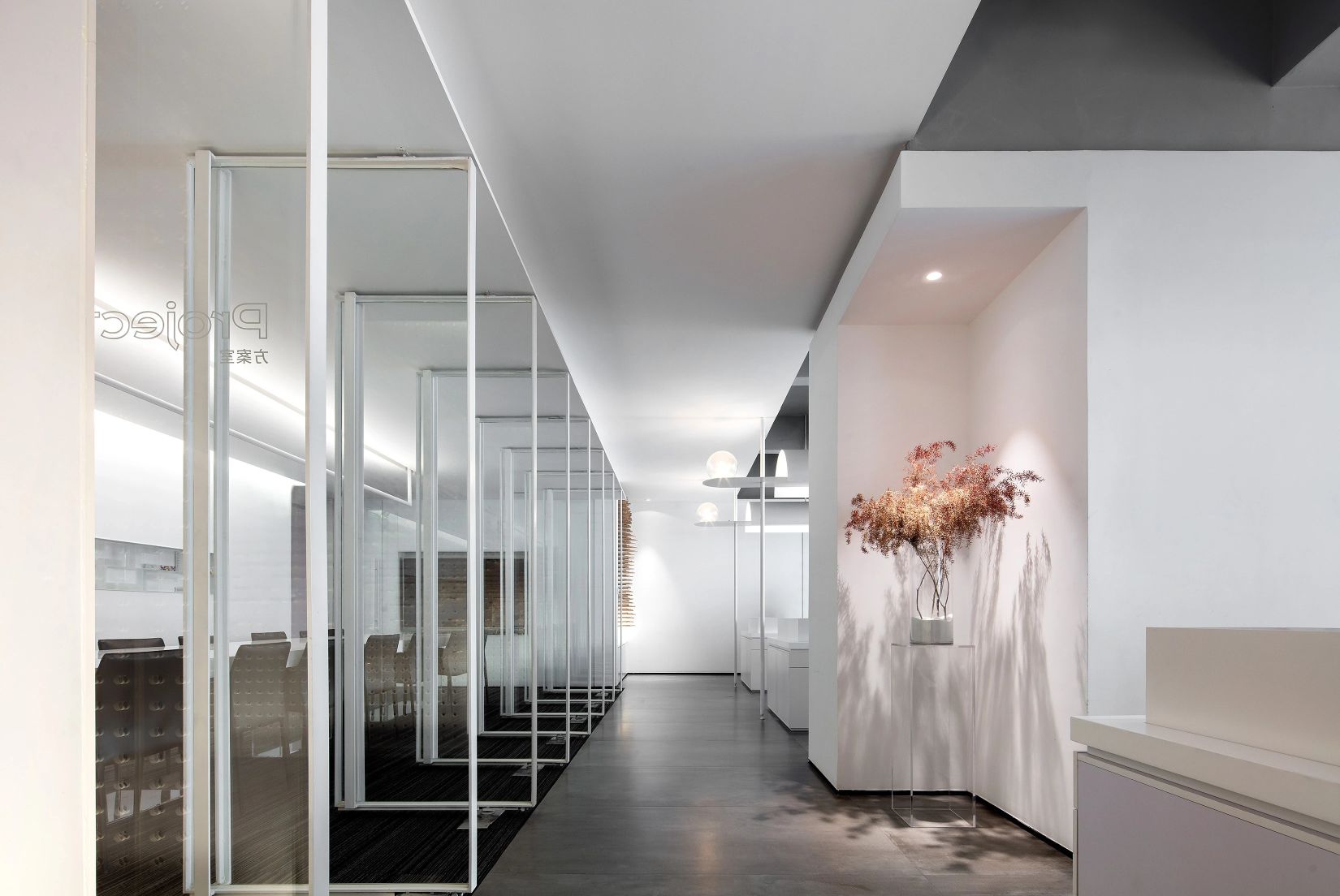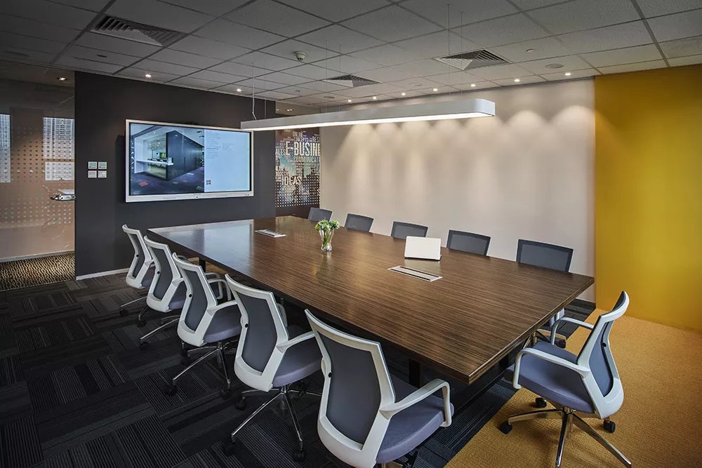 以深灰为主色调, 电子白板两侧以落地玻璃让空间有延展效果, 延伸至走道墙面;临窗区墙面及地面以U形 黄色色块勾勒,。